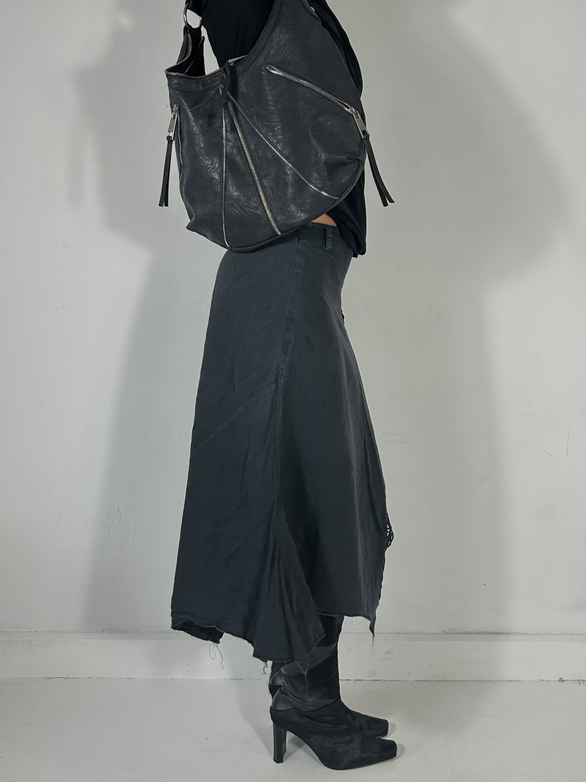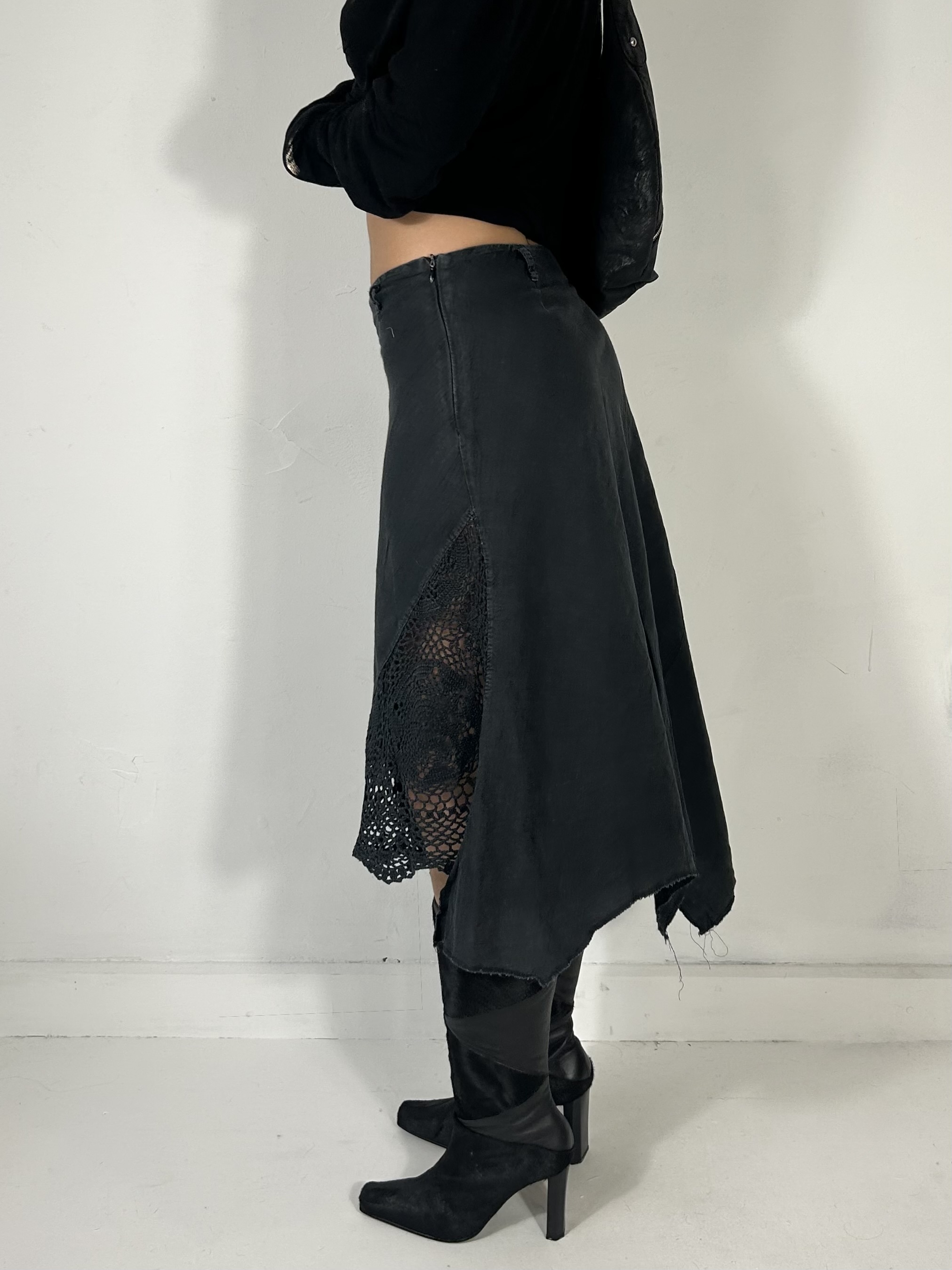 Black raw hem midi skirt with sheer crochet panel. Size XS.