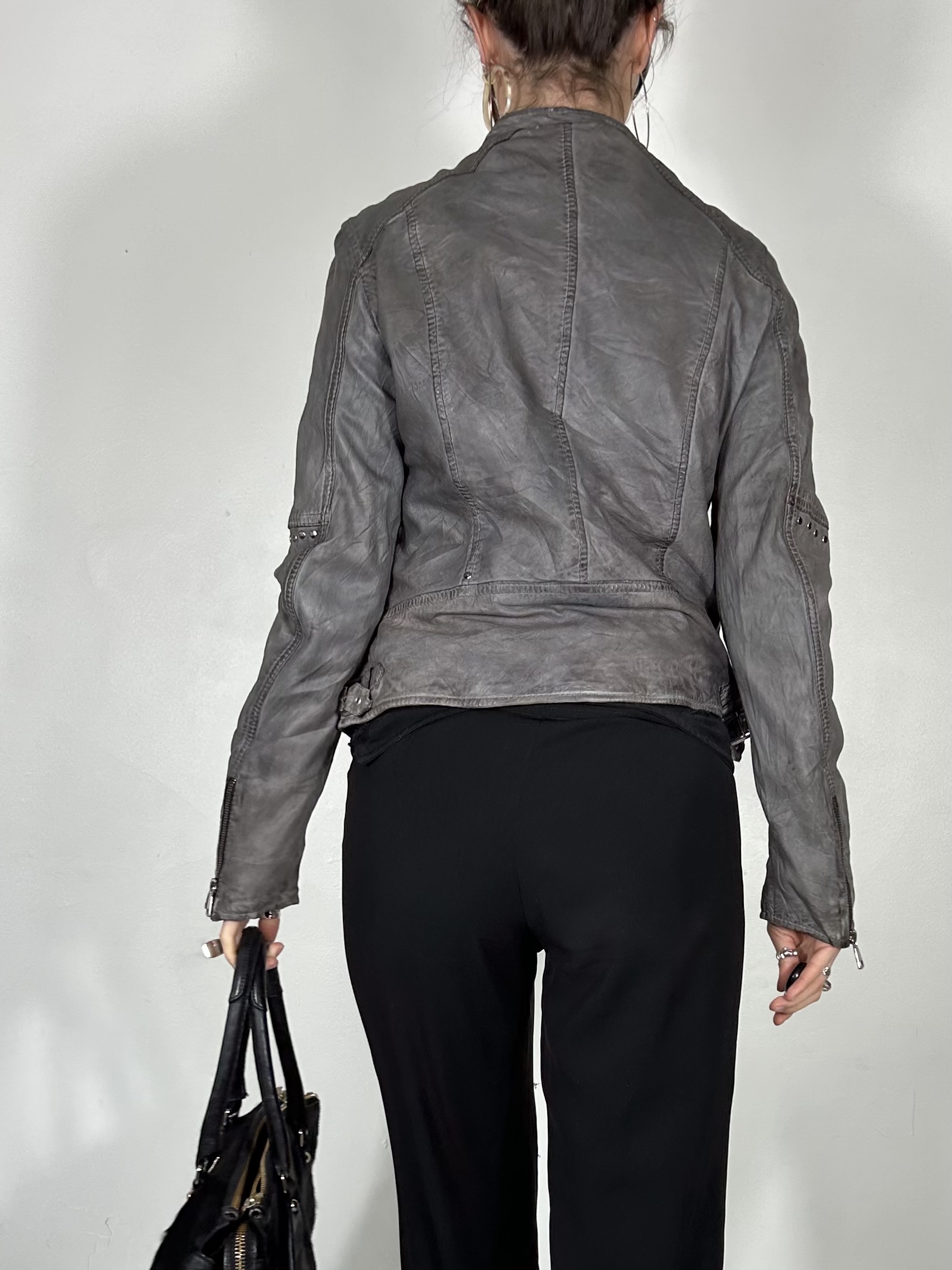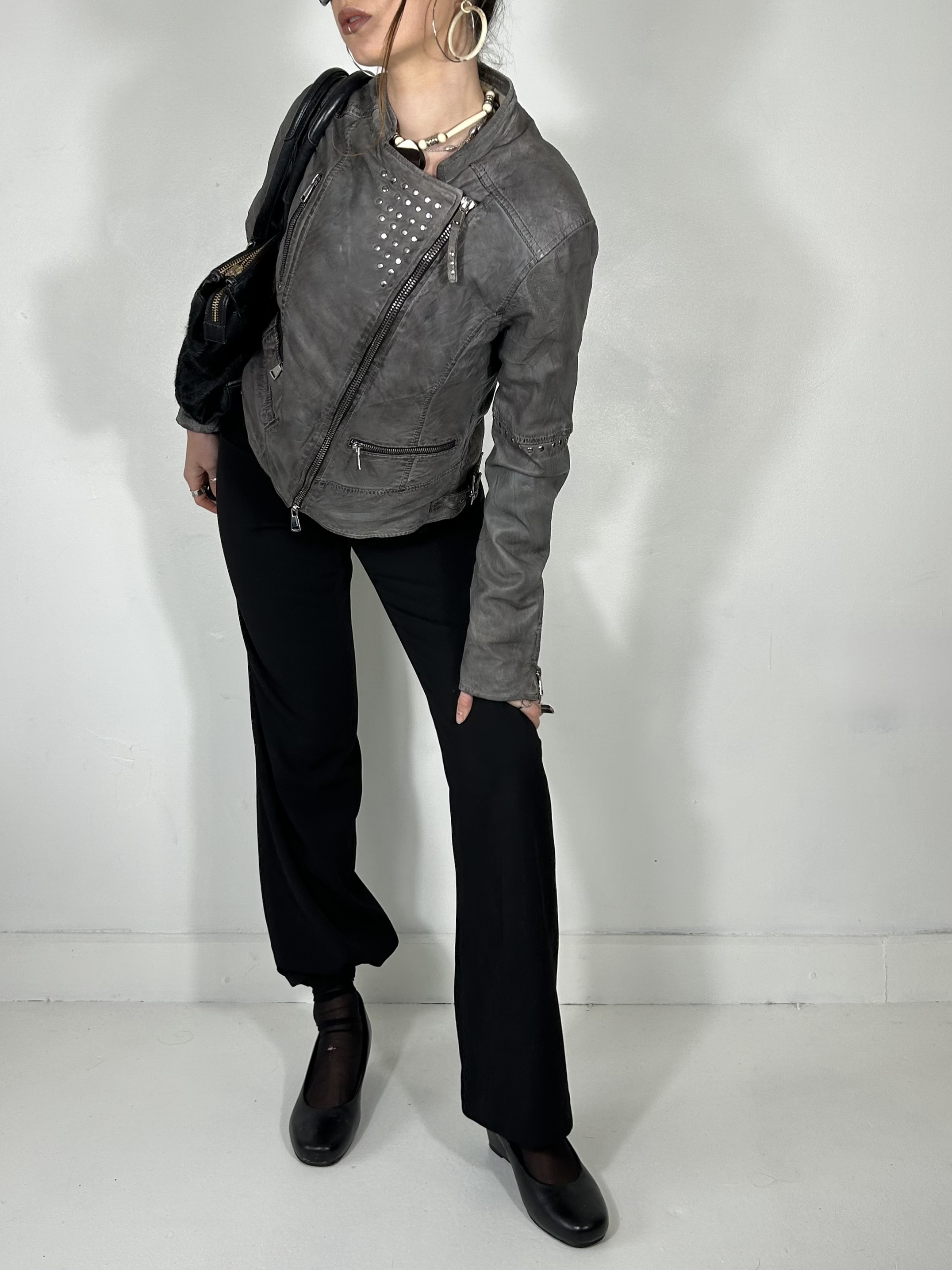 Charcoal grey asymmetrical leather jacket with stud detailing