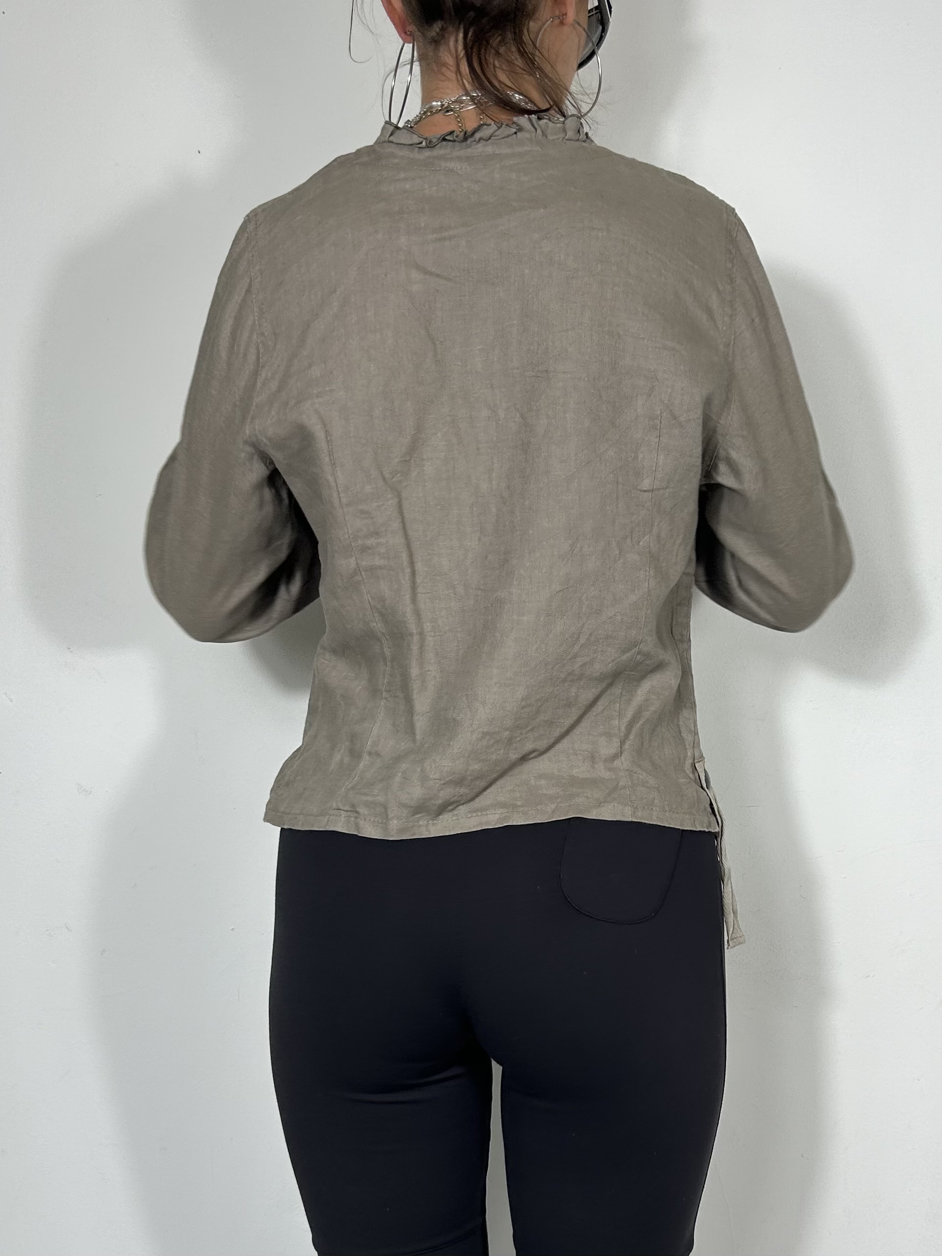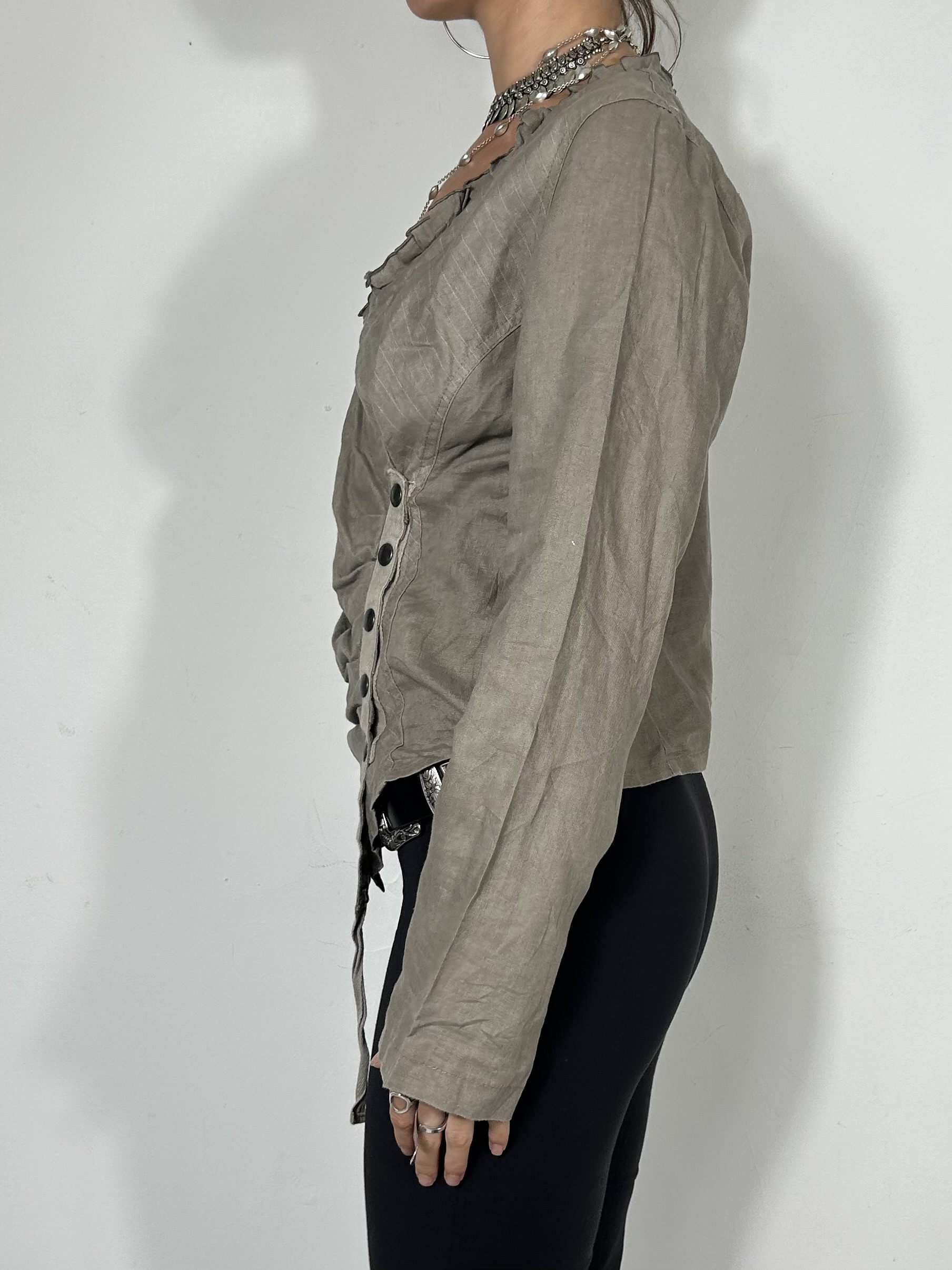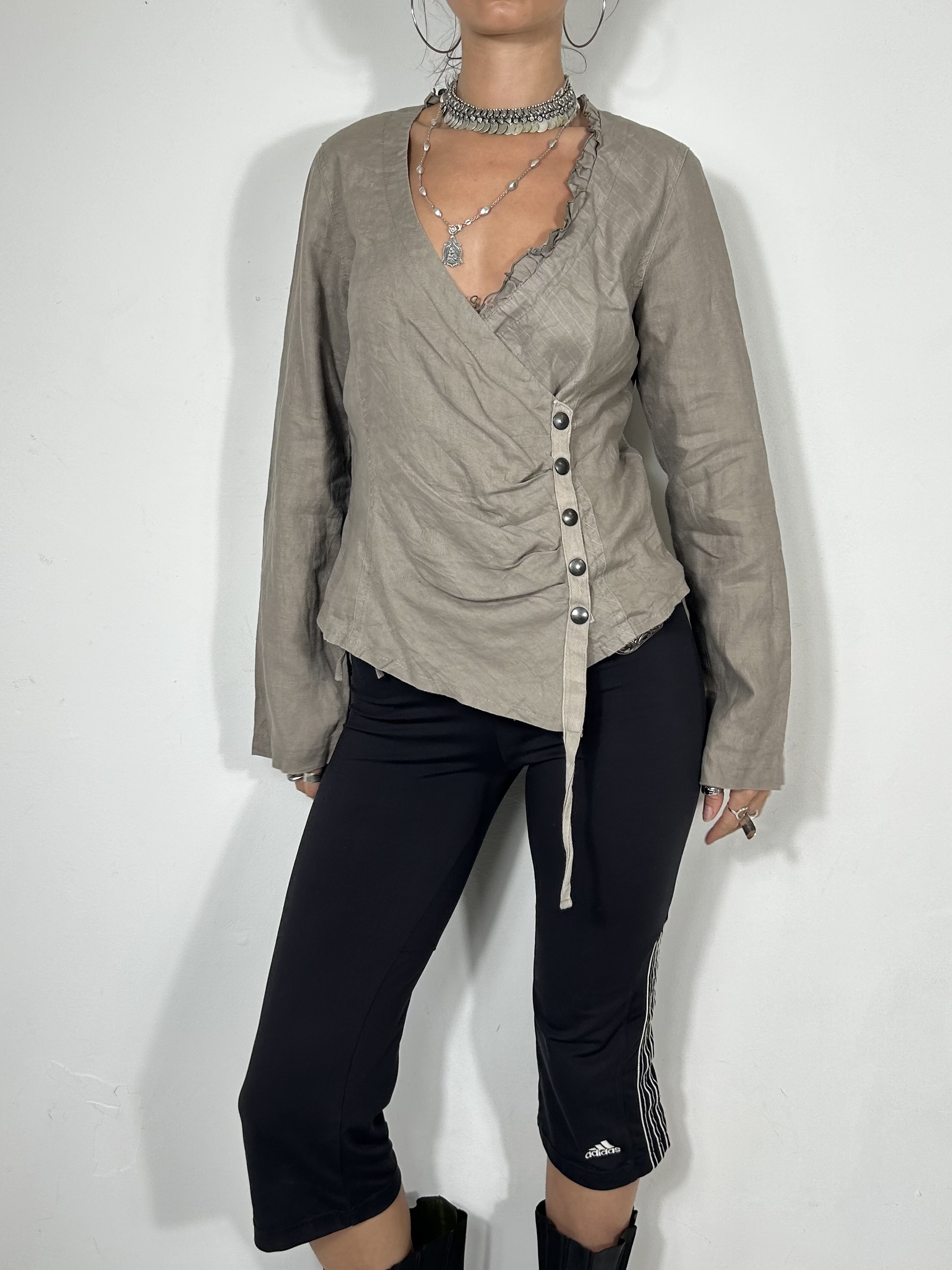 Grey canvas wrap shirt with asymmetric fastening and military button detailing