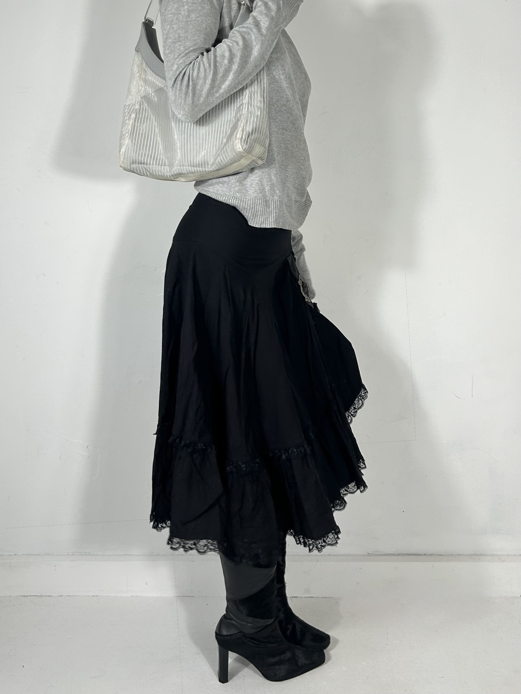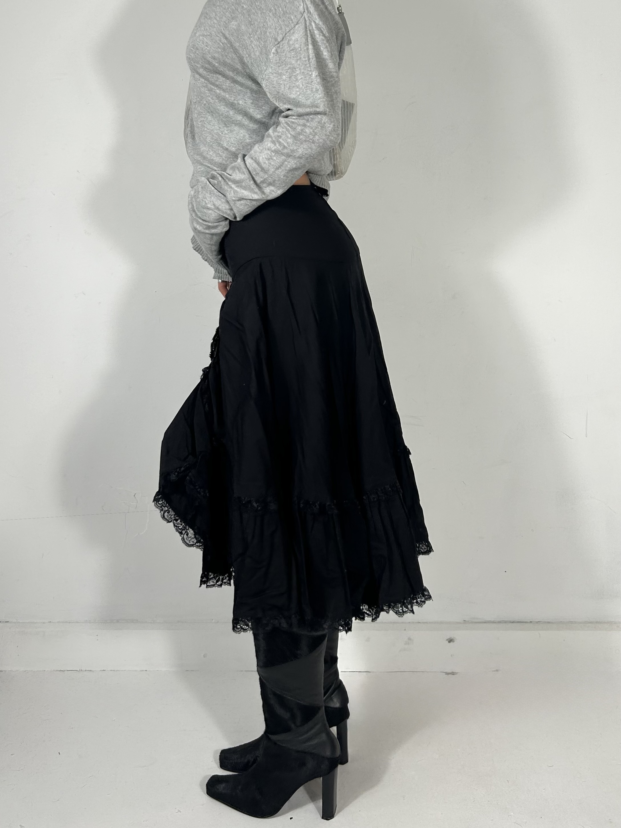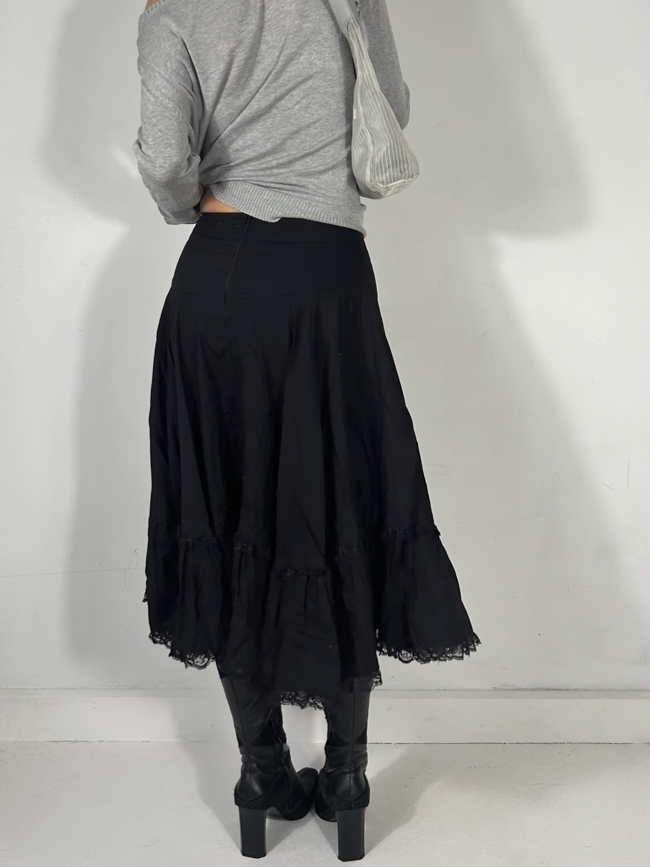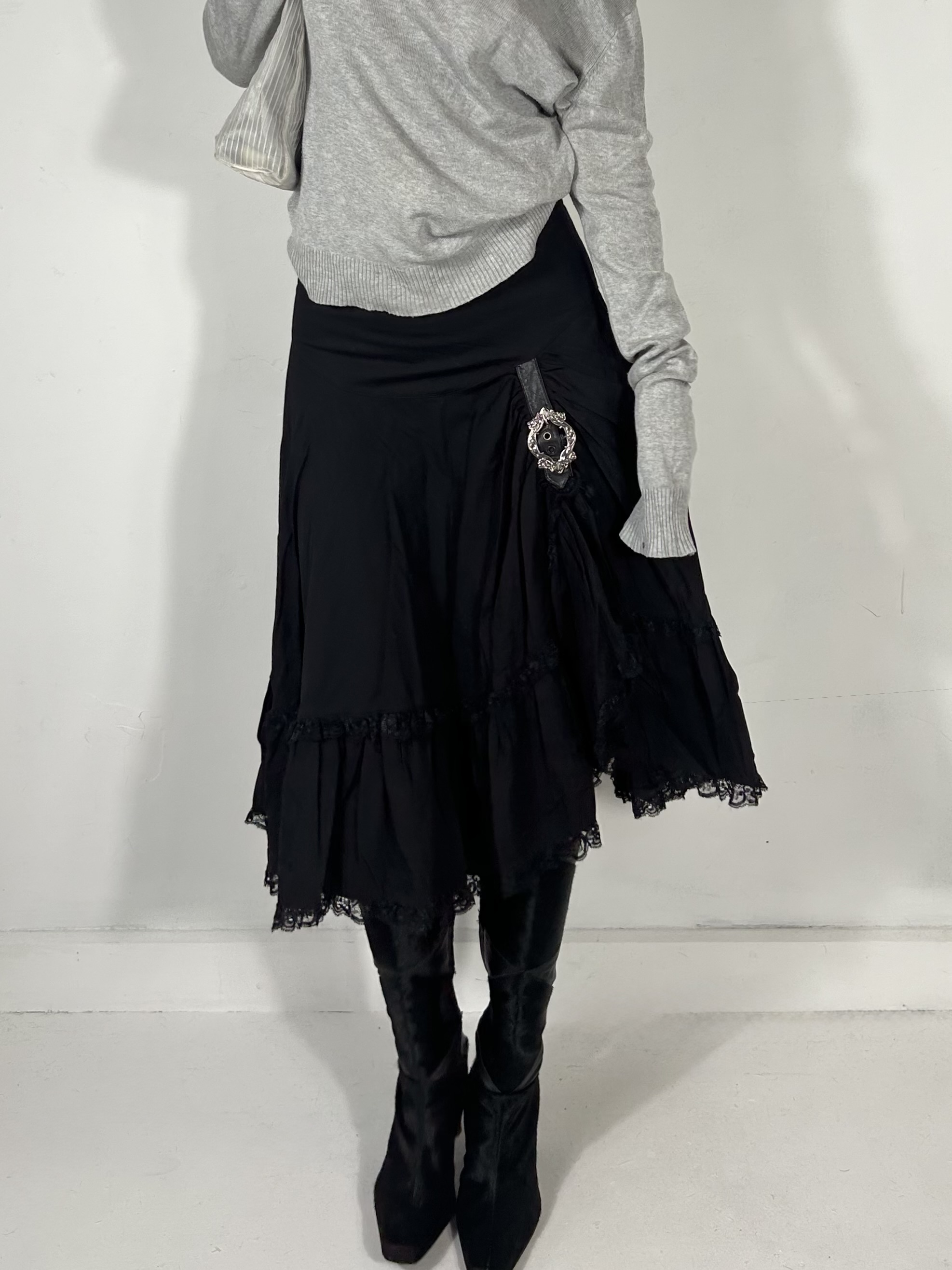 Black ruffle midi skirt with silver buckle detail. Size XS.