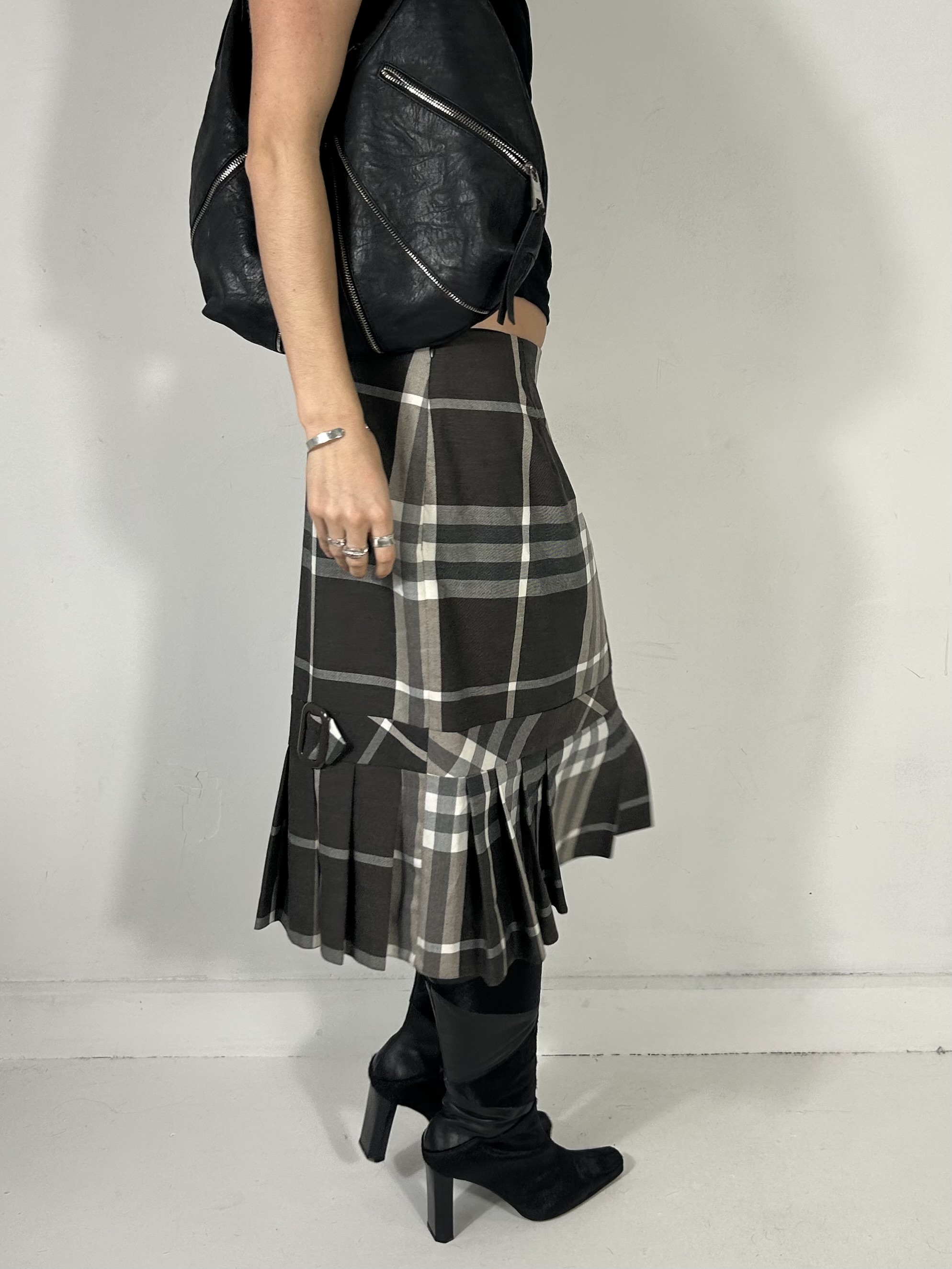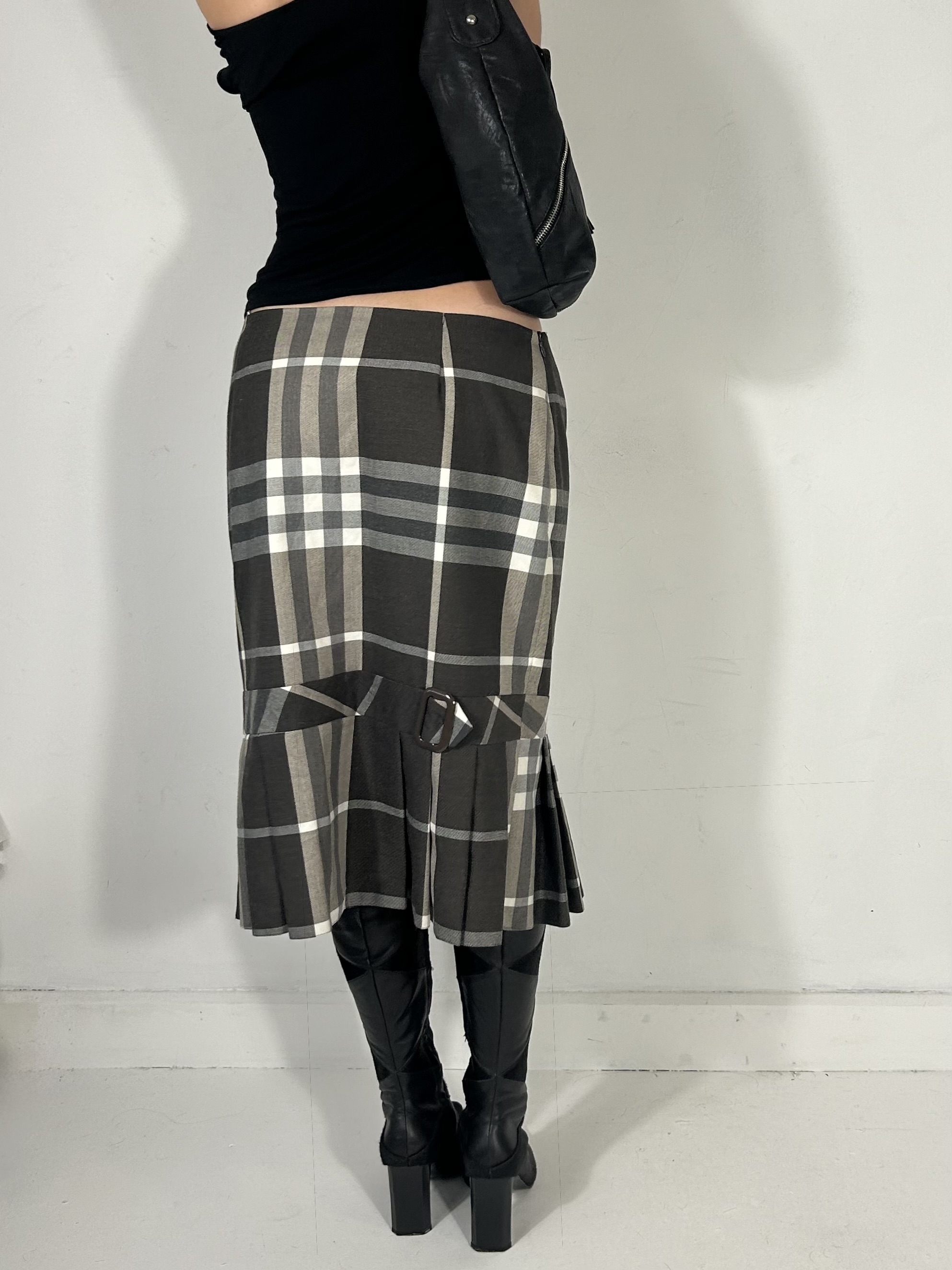 Charcoal grey tartan midi skirt with pleated hem. Best fit uk 10/12