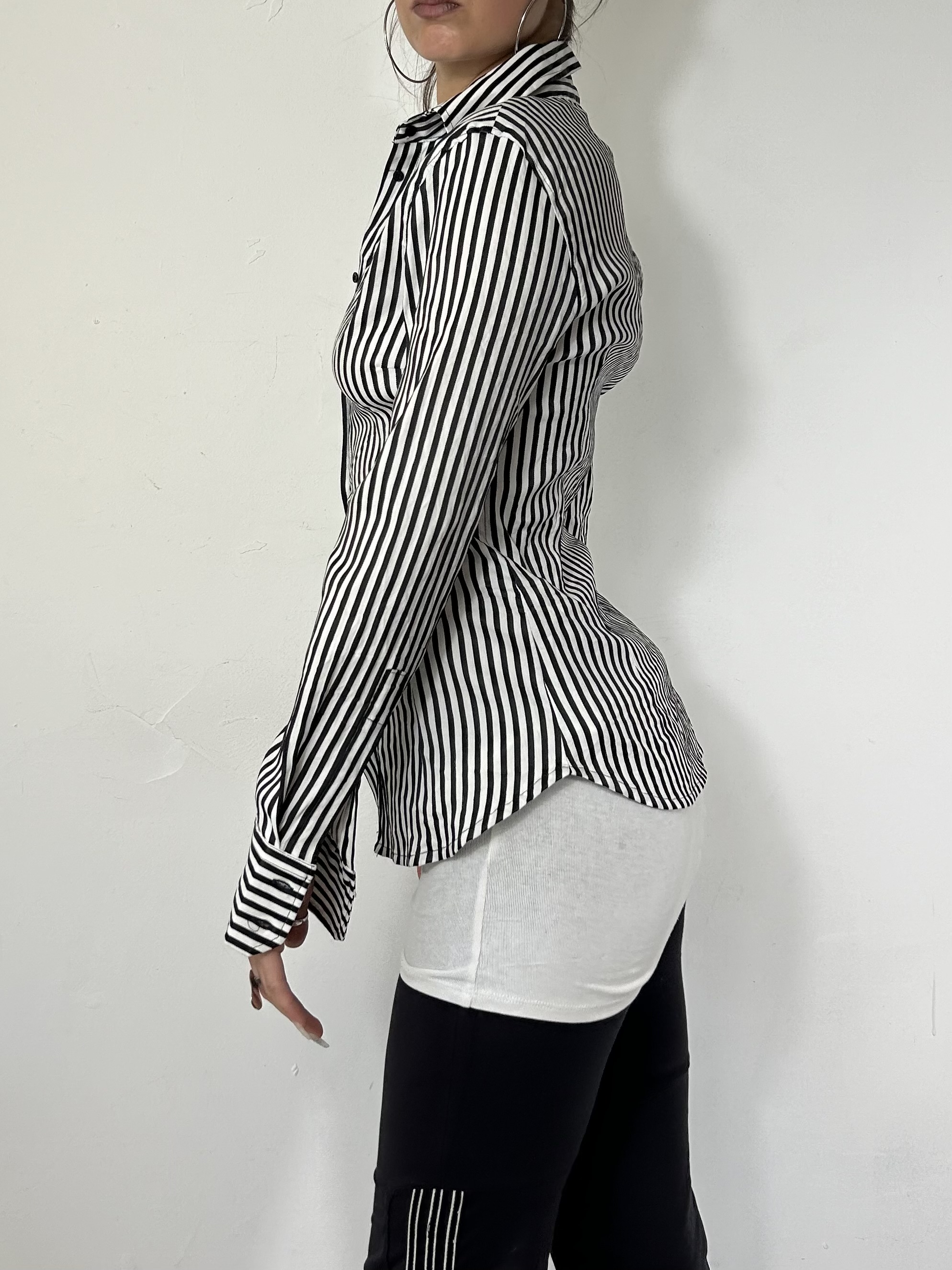 90’s tired button up striped stretch blouse