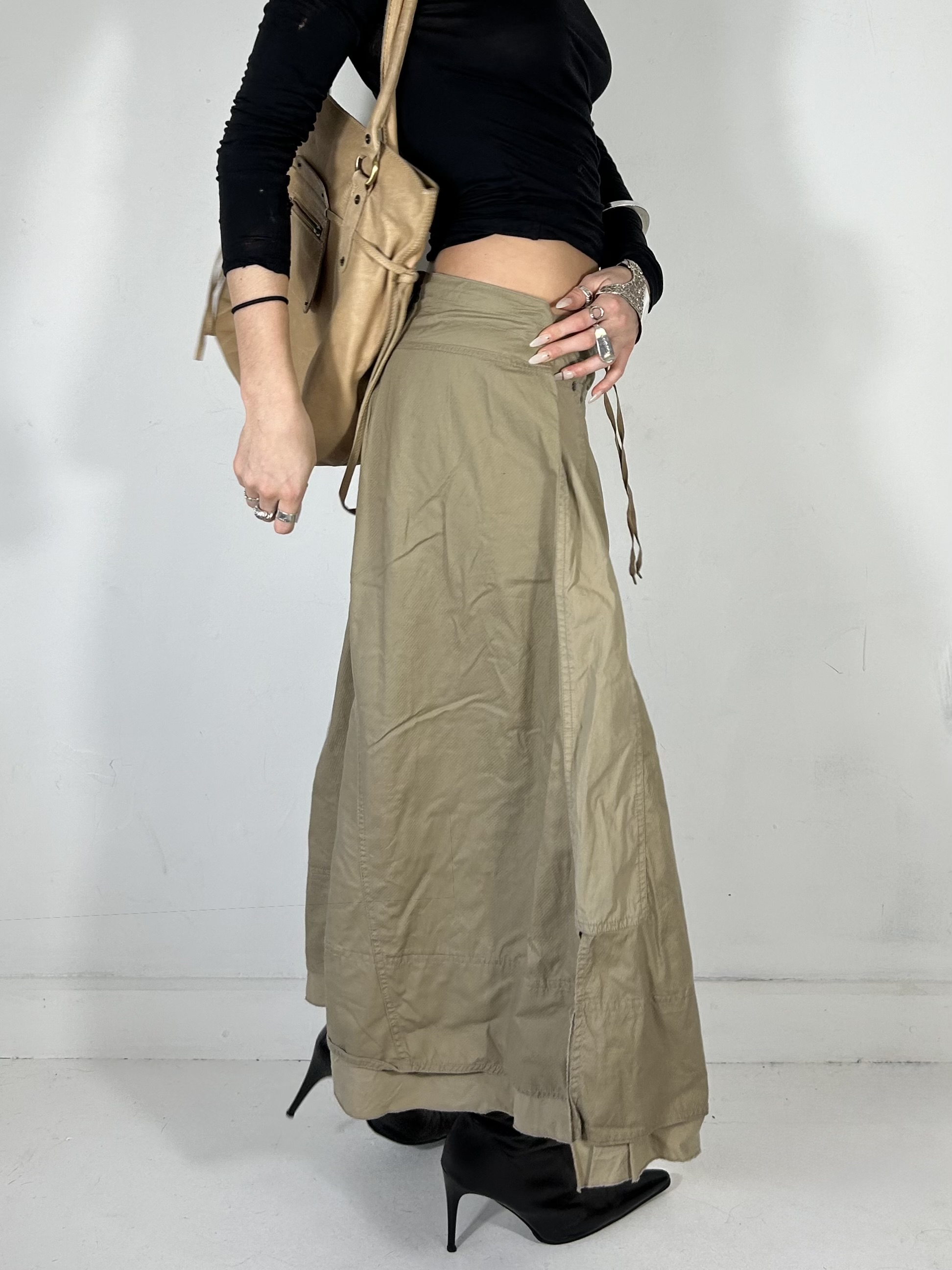 Khaki lace up maxi skirt with panelling. Waist 36 inch.