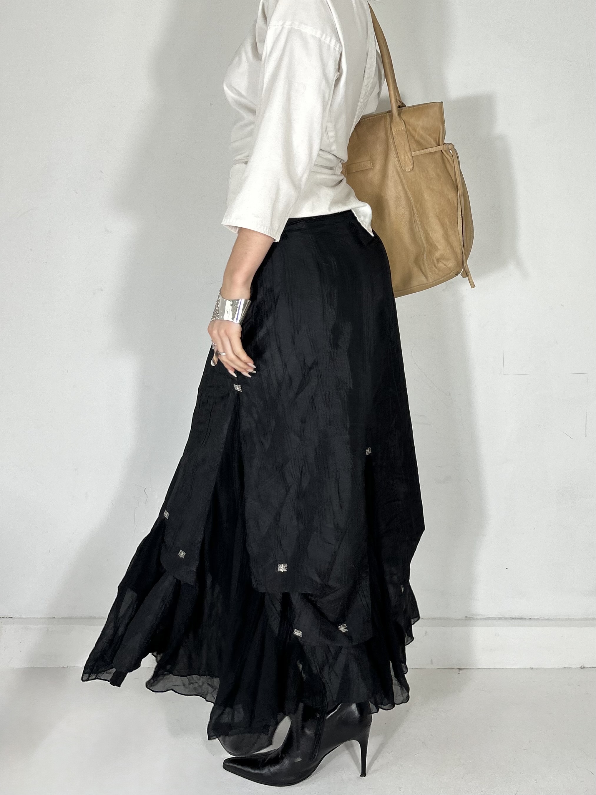 Black distressed maxi skirt with silver stitch detailing. Waist 29 inch.