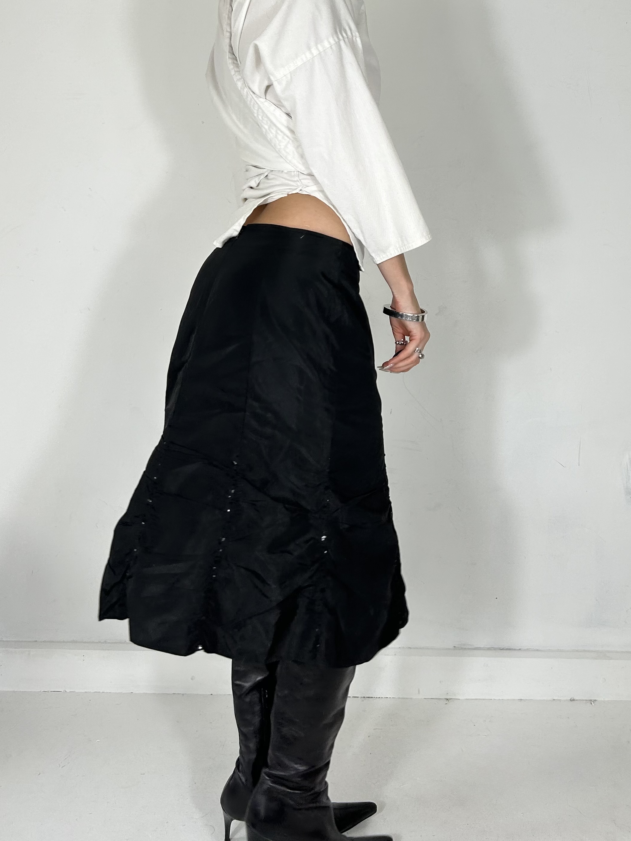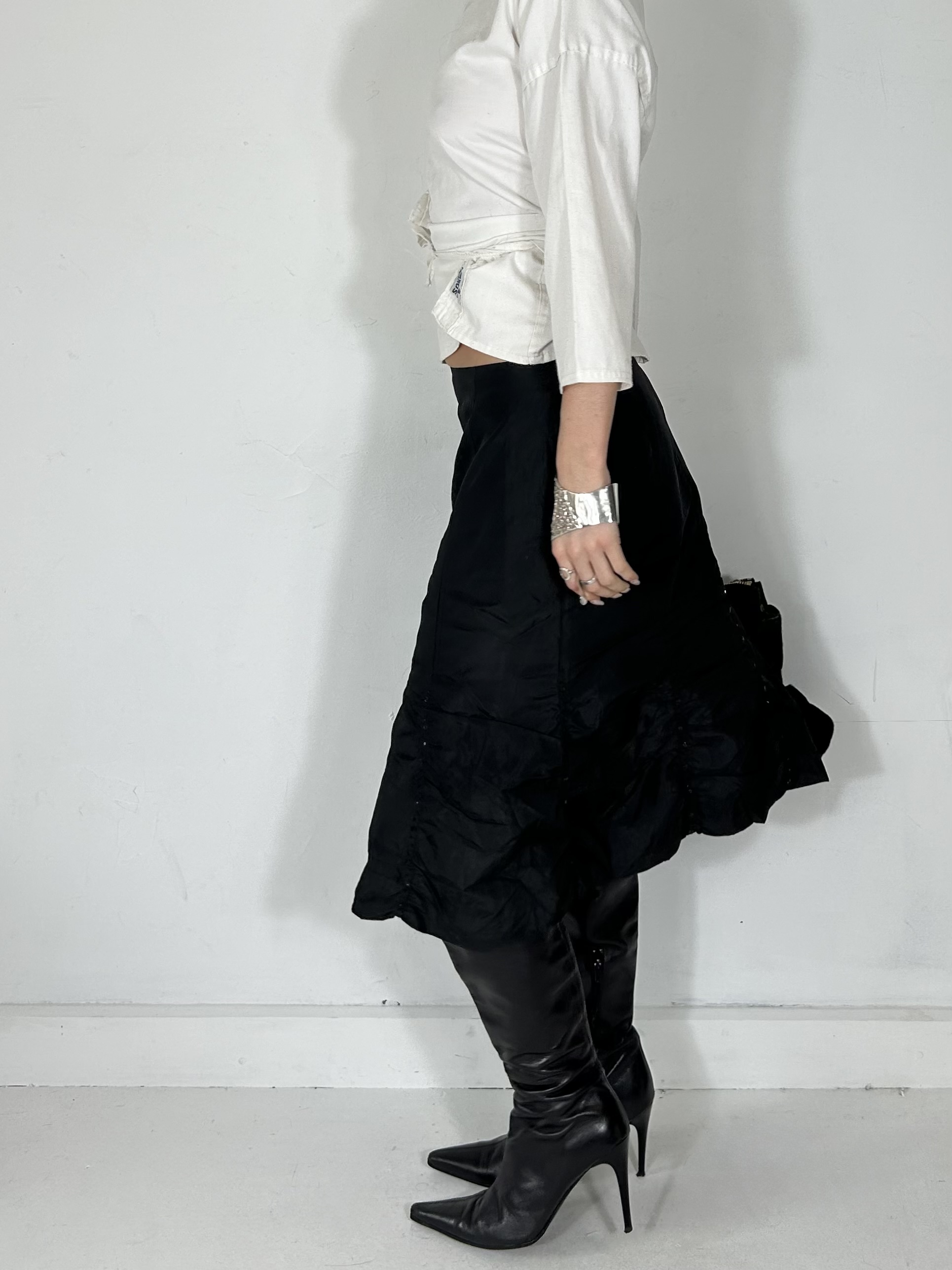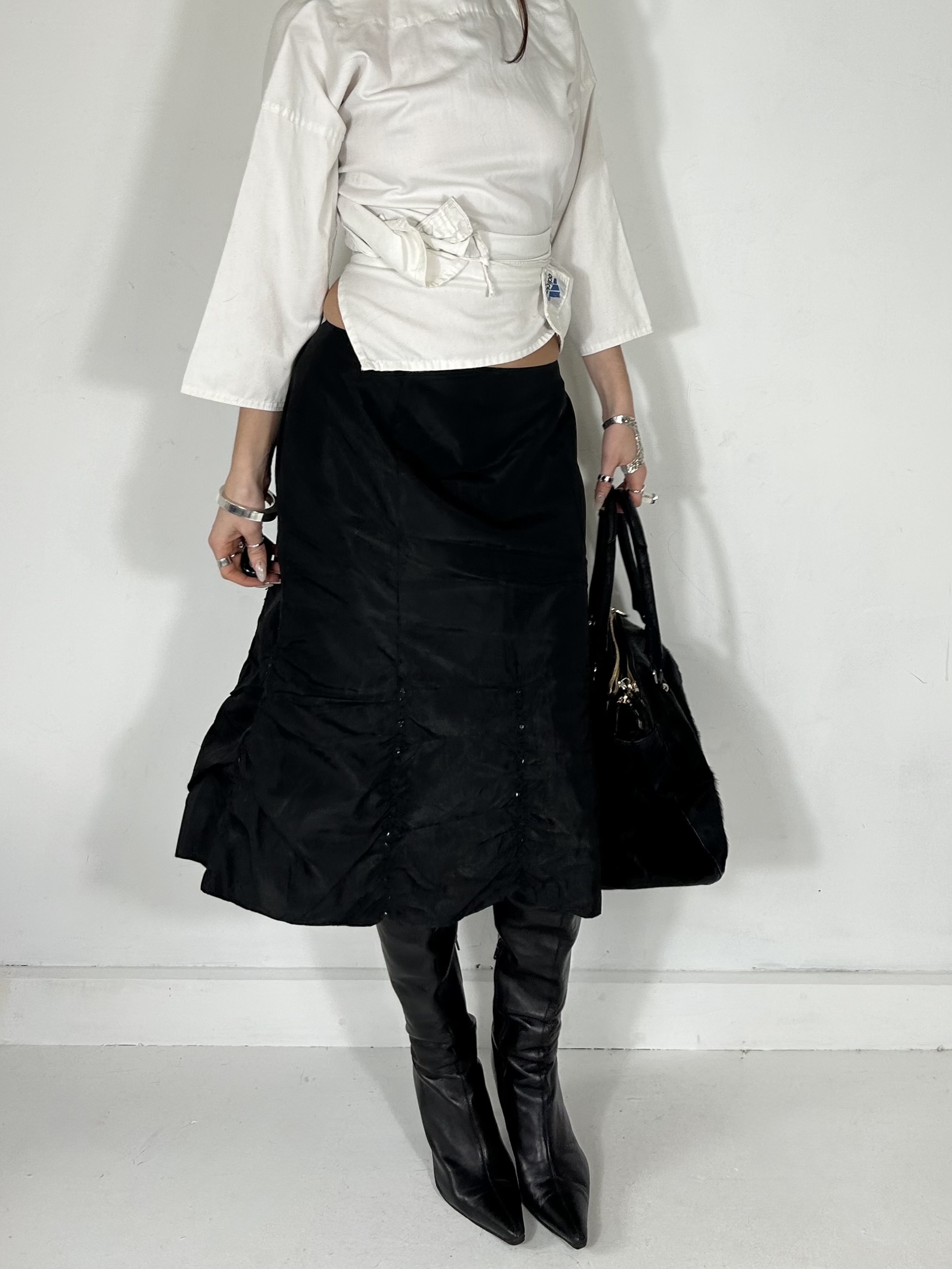 Black satin midi skirt with ruched detailing. Waist 30 inch.