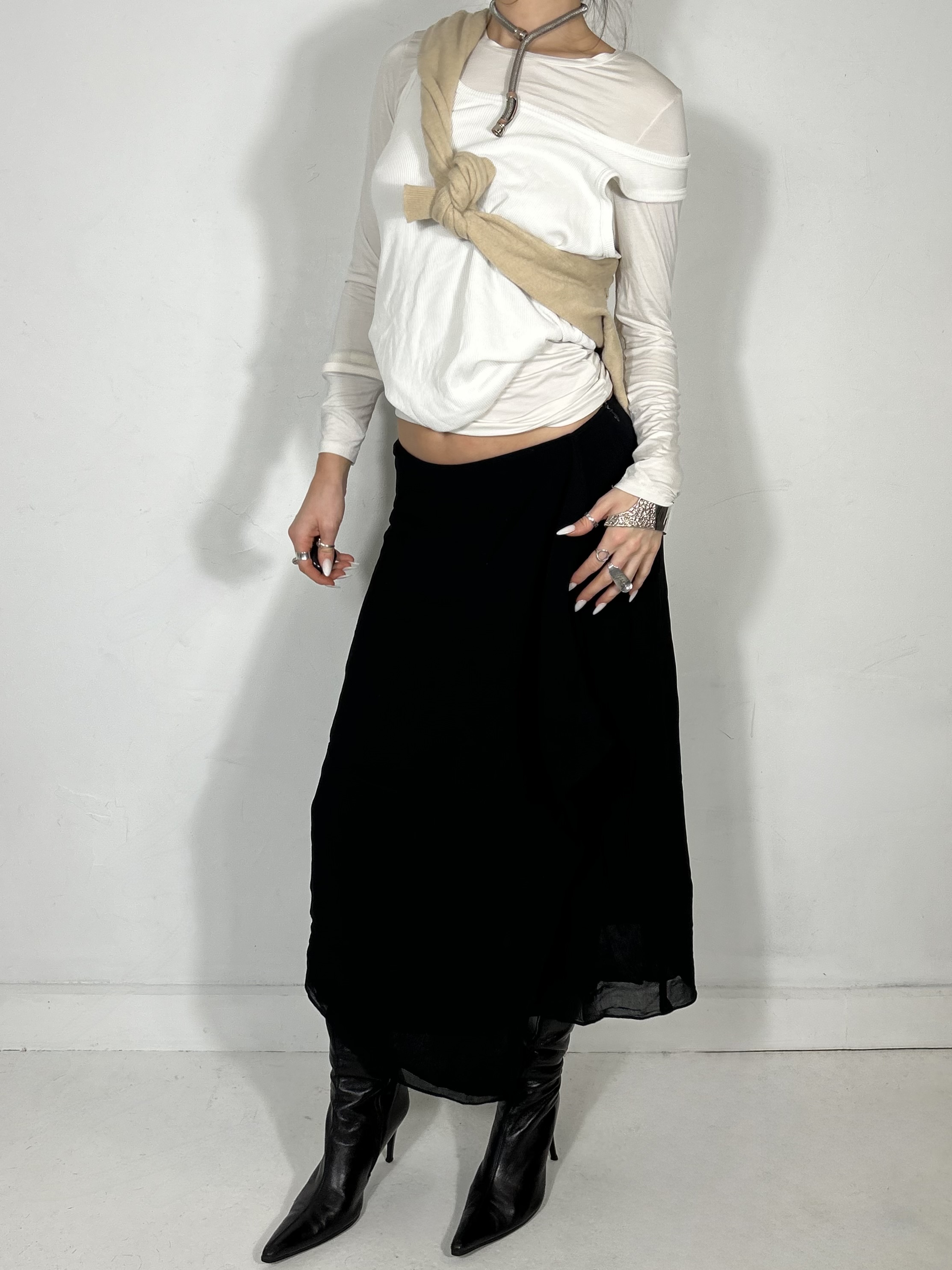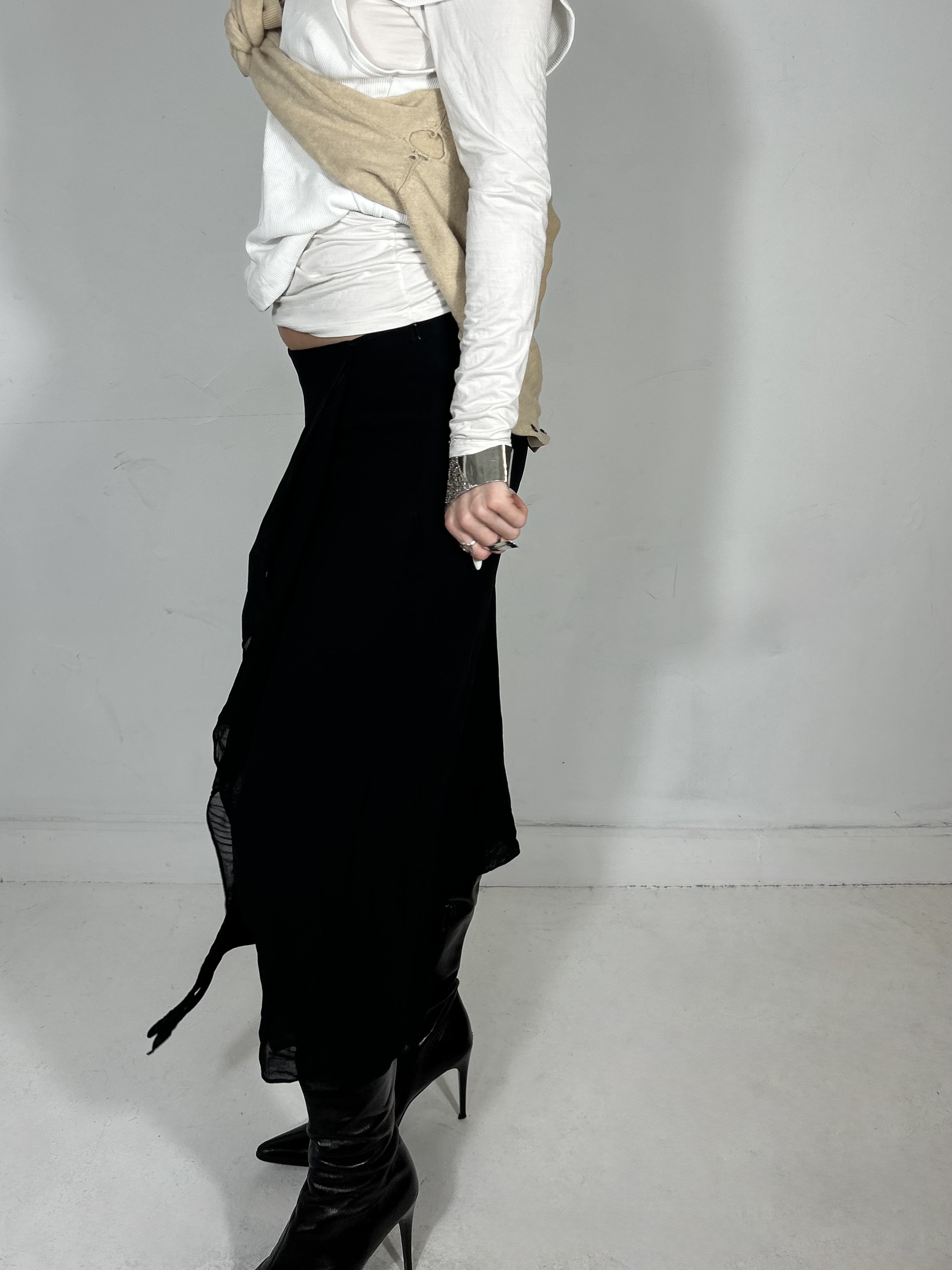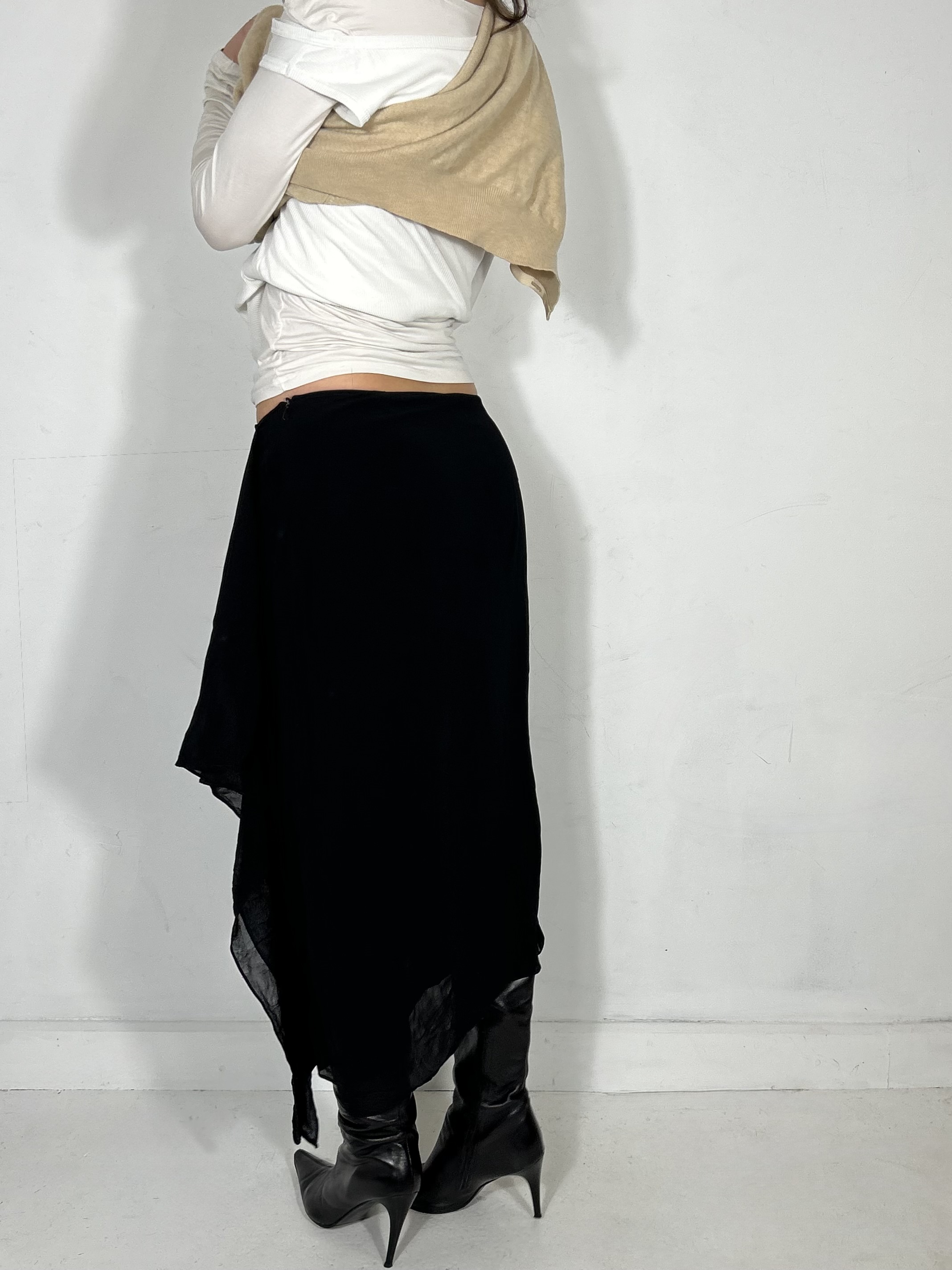 Black asymmetric chiffon maxi wrap-style skirt. Waist 30