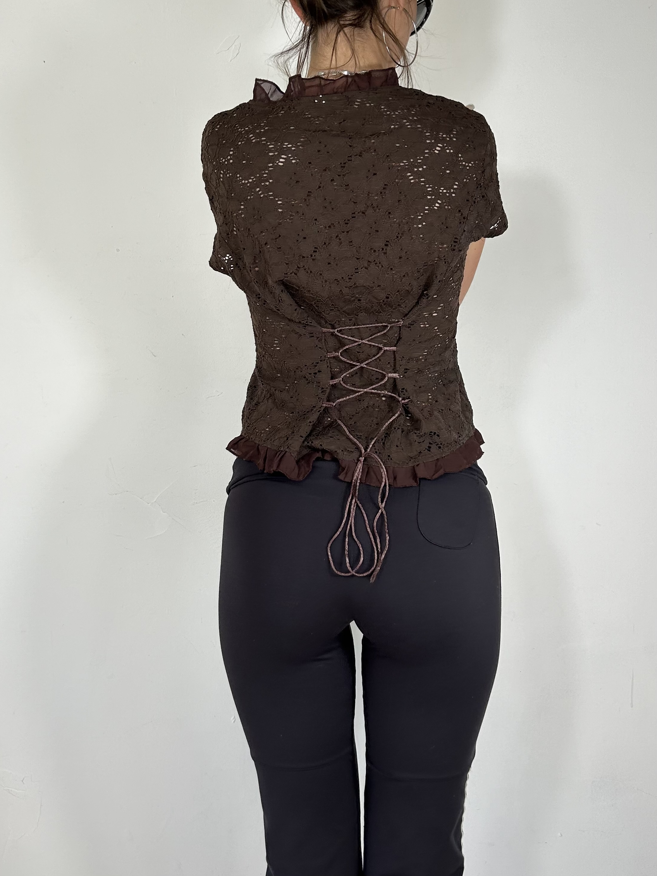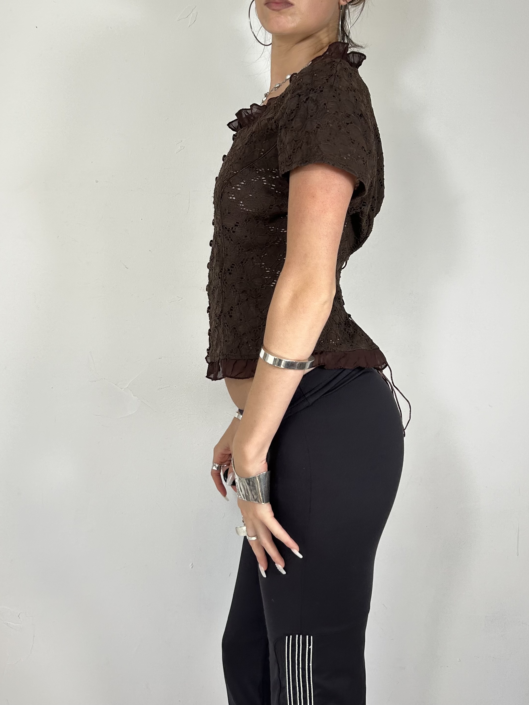 Brown lace ruffle button up top