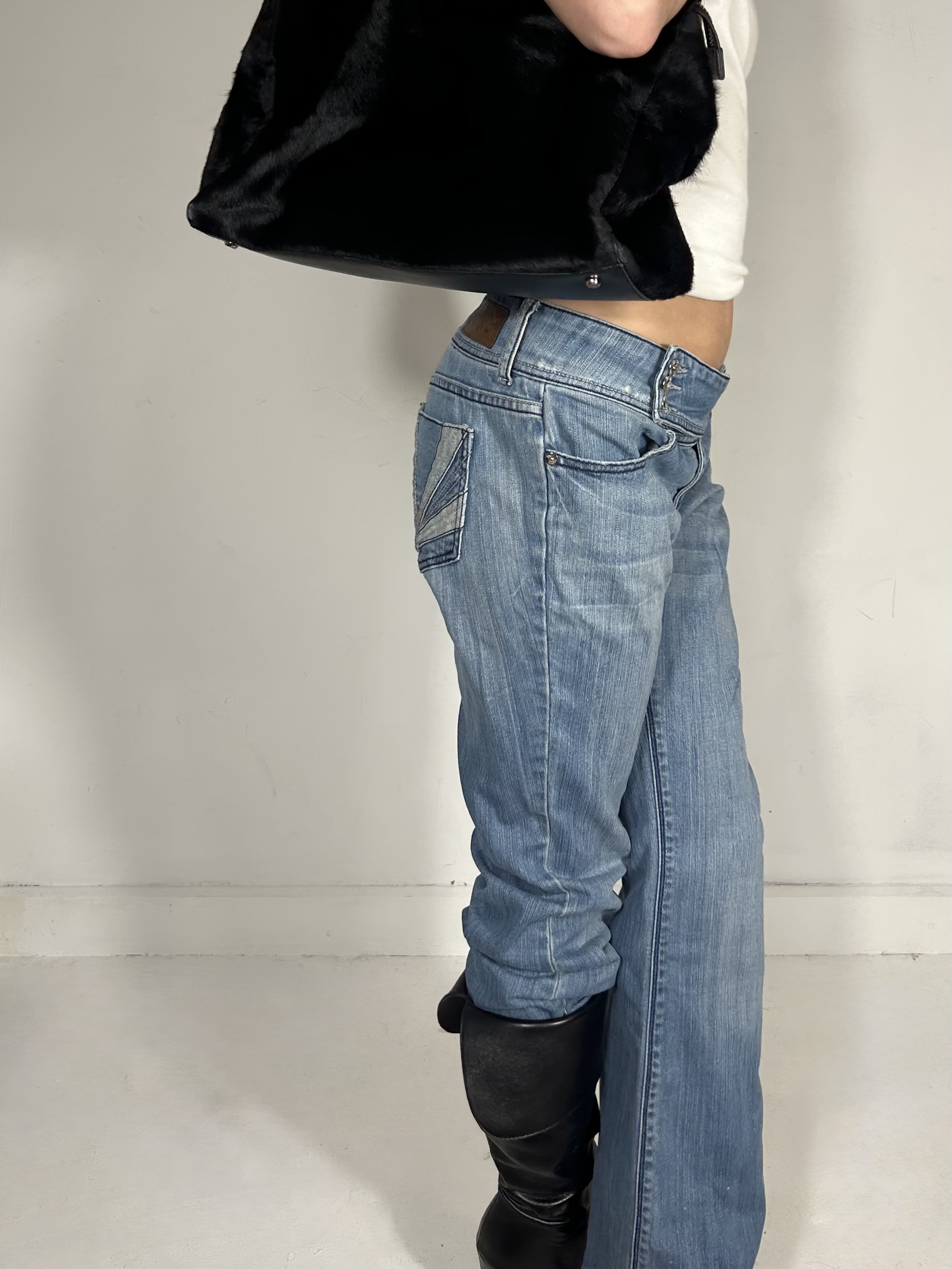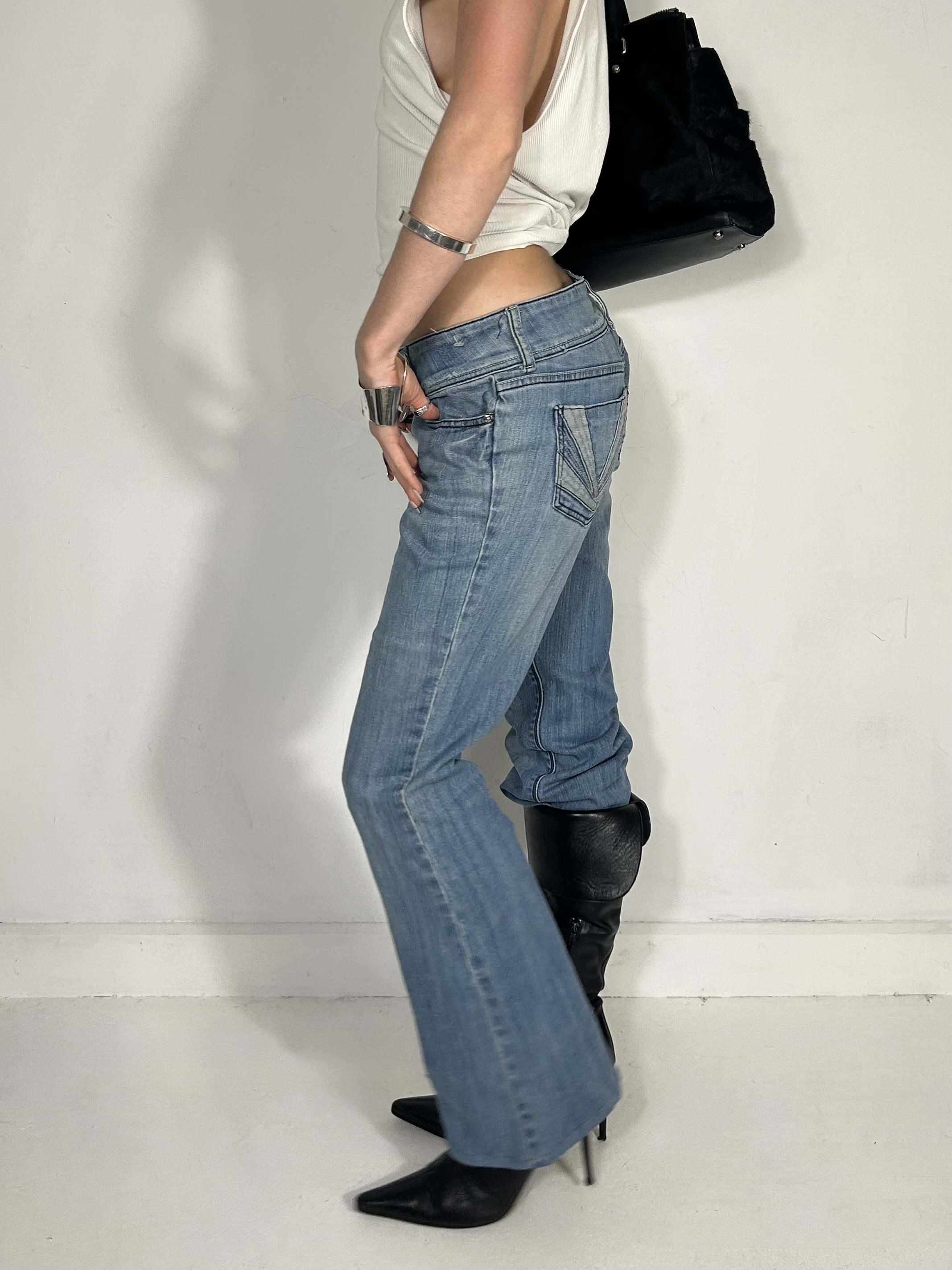 Low rise asymmetric waist light wash jeans with embroidered pockets.
