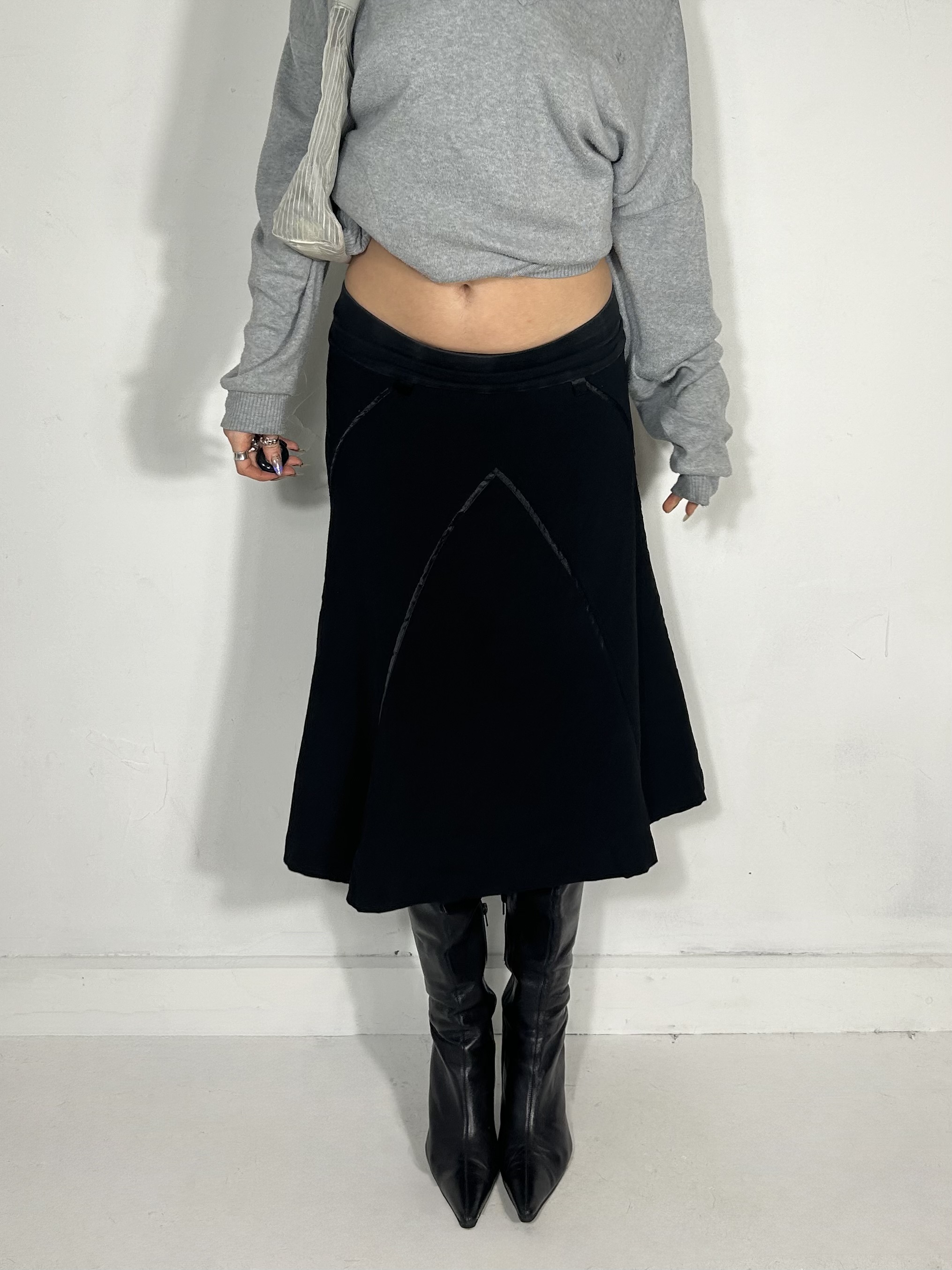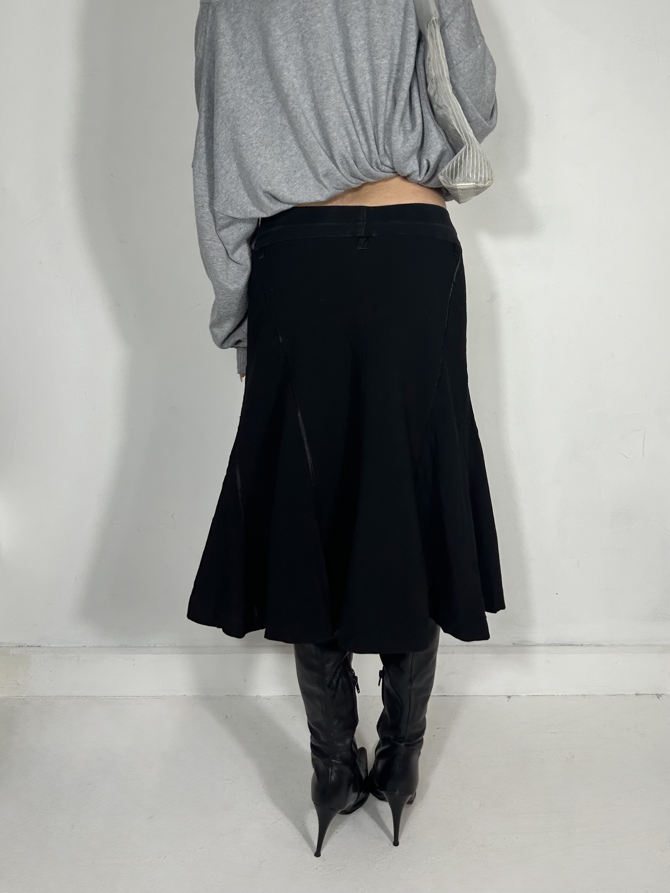Black low rise jersey midi skirt with satin detailing. Waist 30