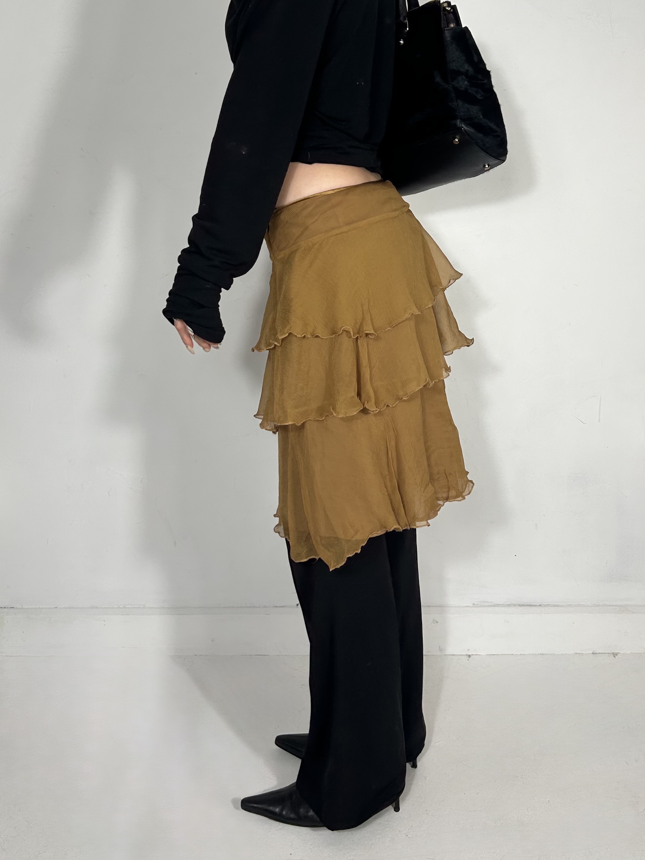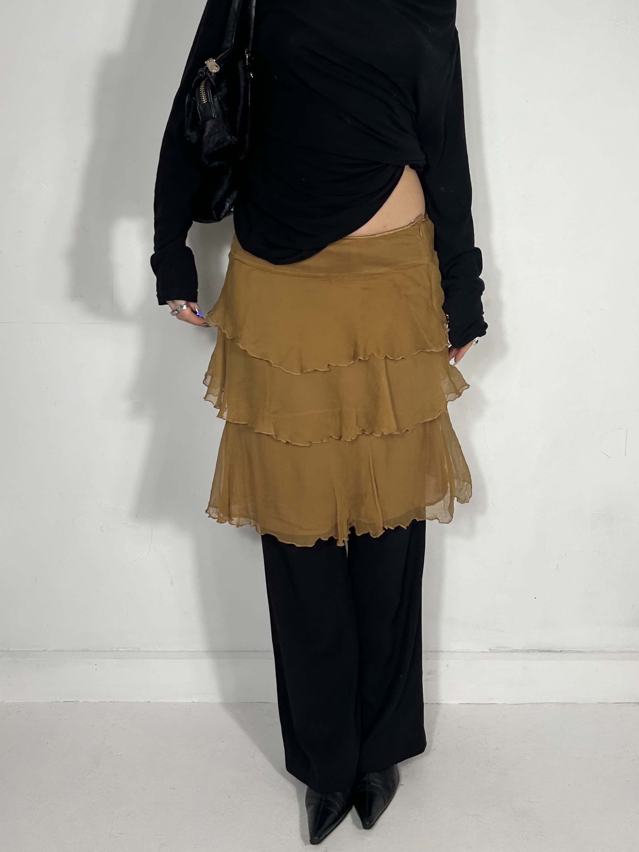Mustard tiered 100% silk mini skirt. Waist 30
