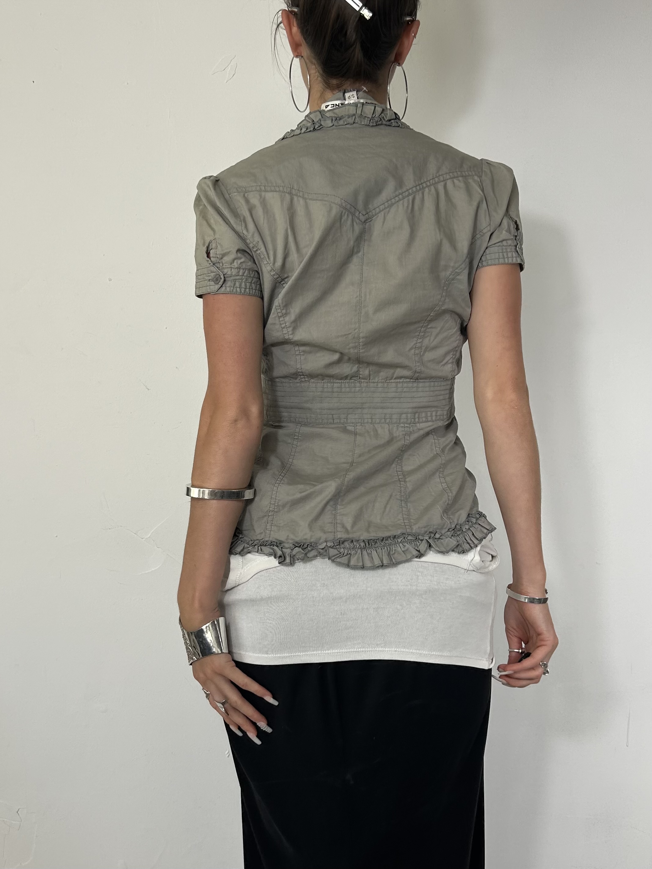 Earthy corset cinch top with ruffles and hook and eye closures