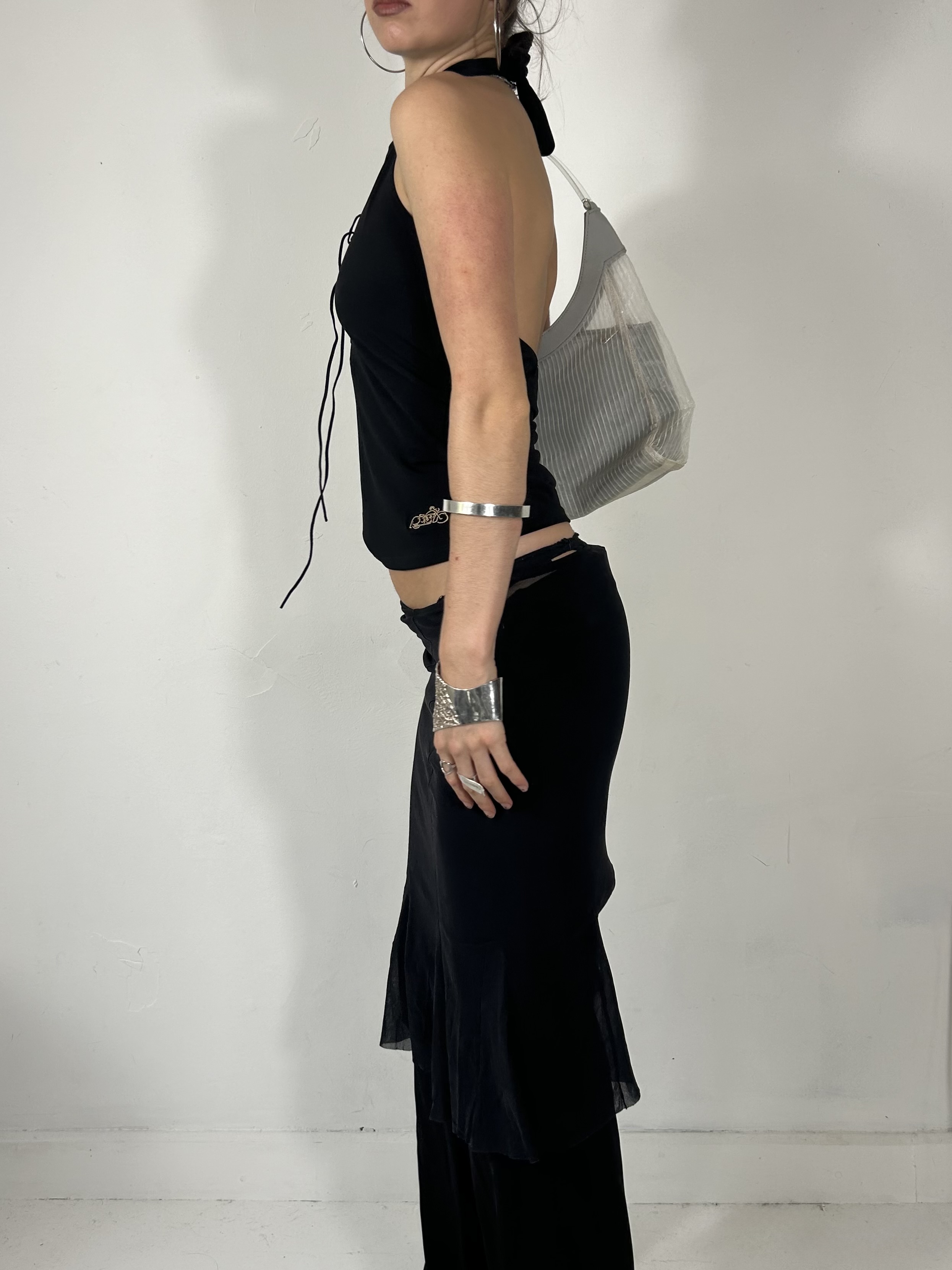 Black lace up halter neck cami with open back detail and silver eyelets