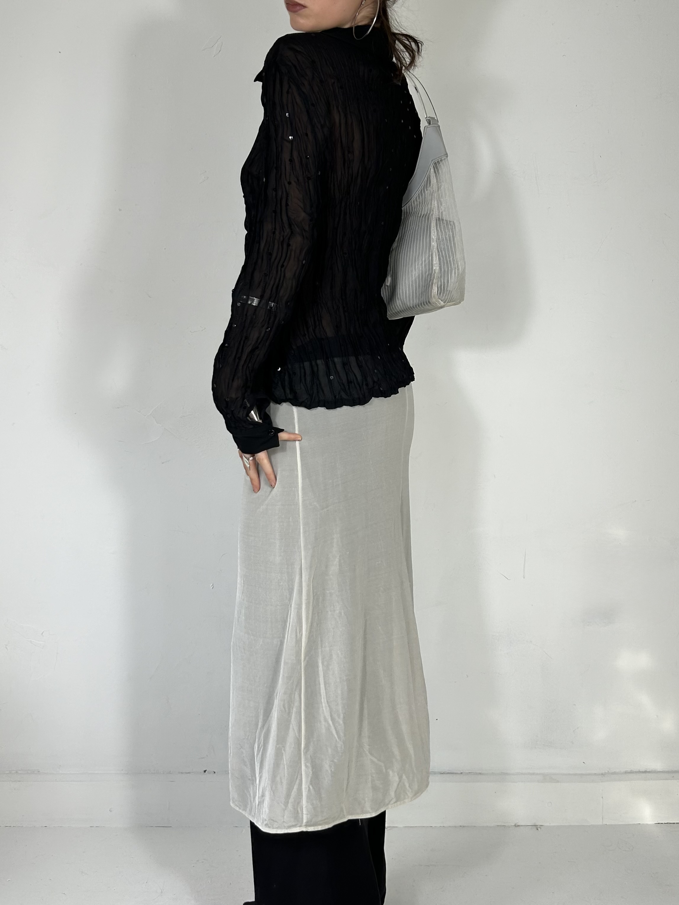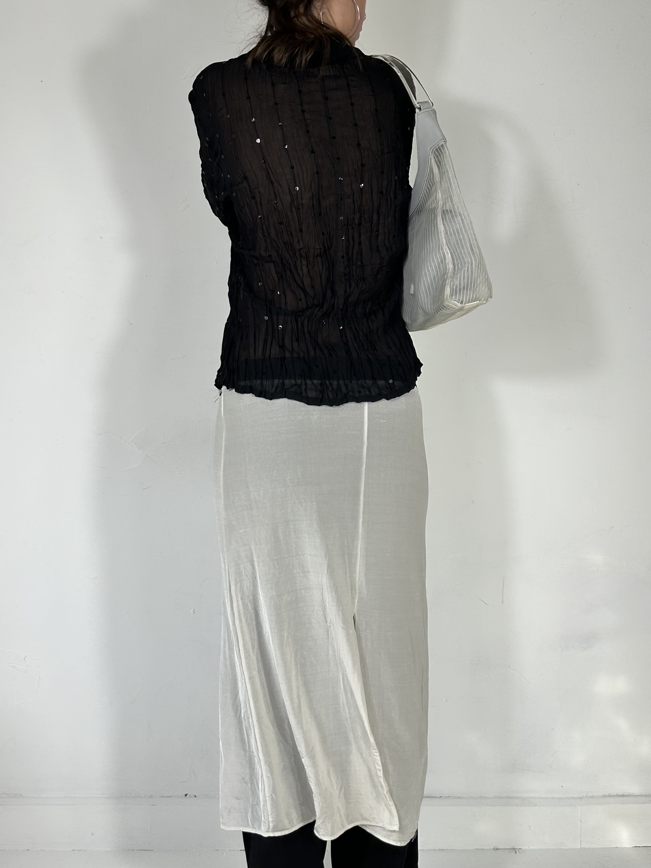 Black semi sheer pleated button up blouse with sequin detailing