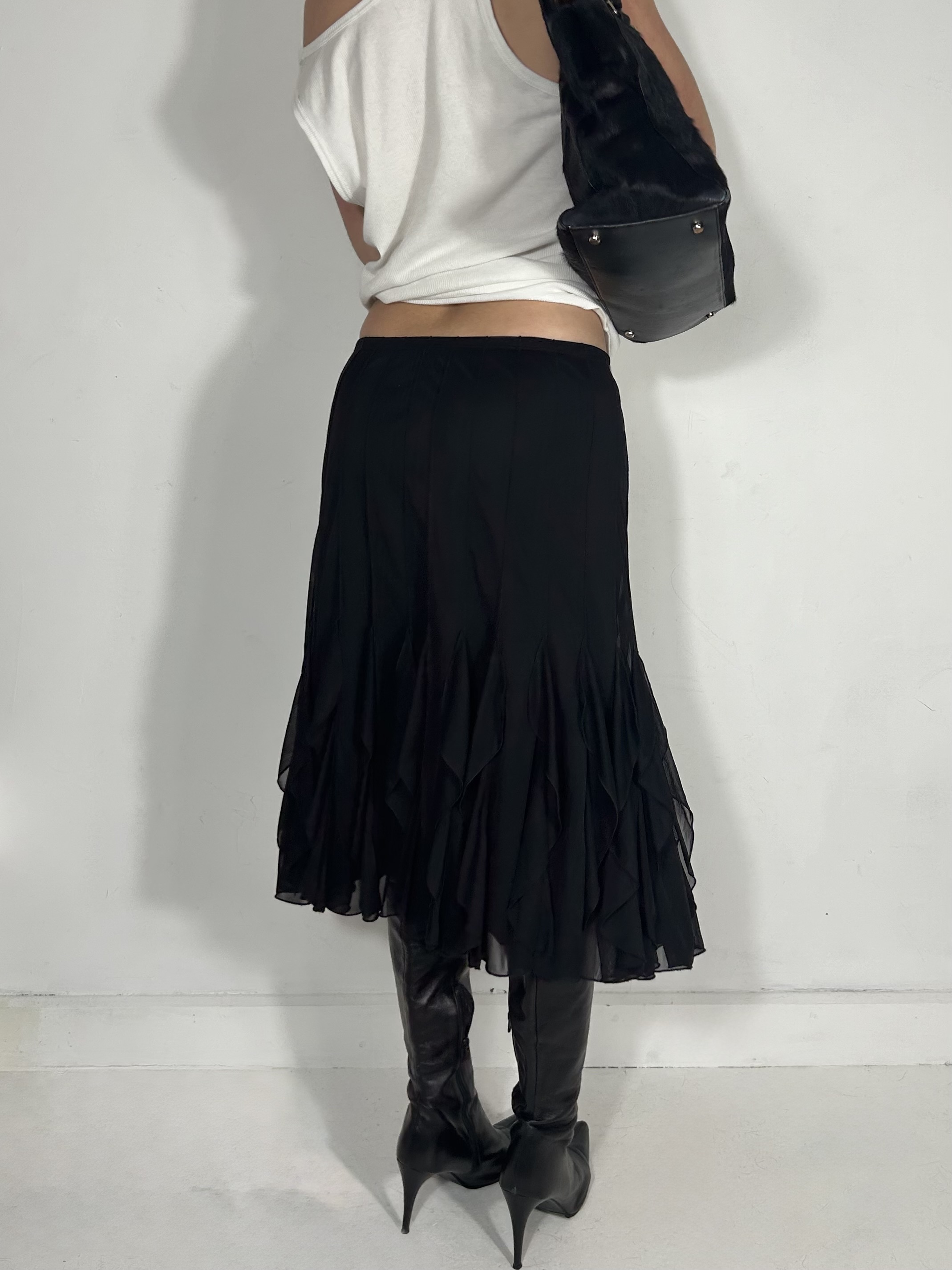 Black mesh layered midi skirt with textured detailing. Waist 28