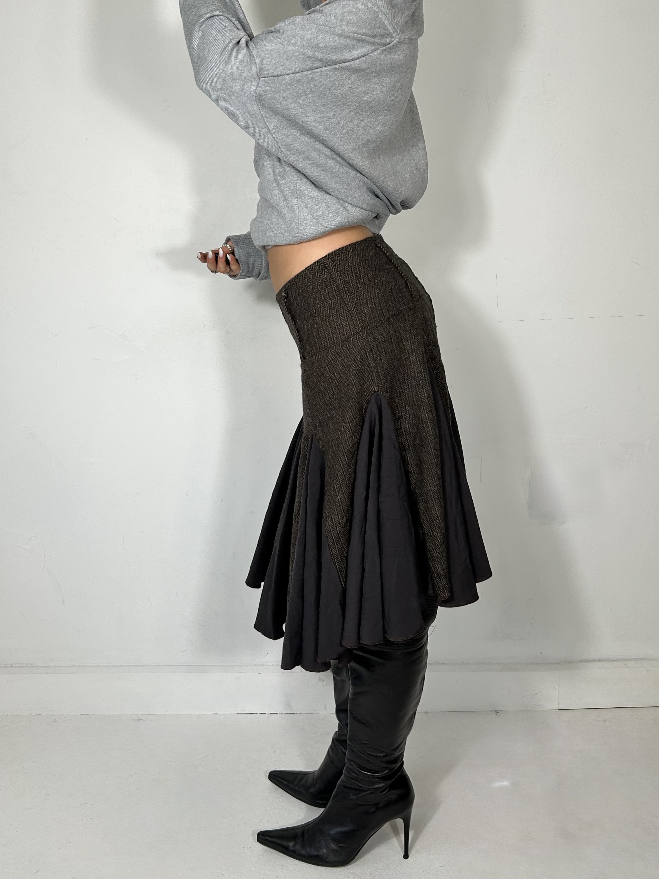 Brown tweed midi skirt with pleats and drop waist detail. Waist 30