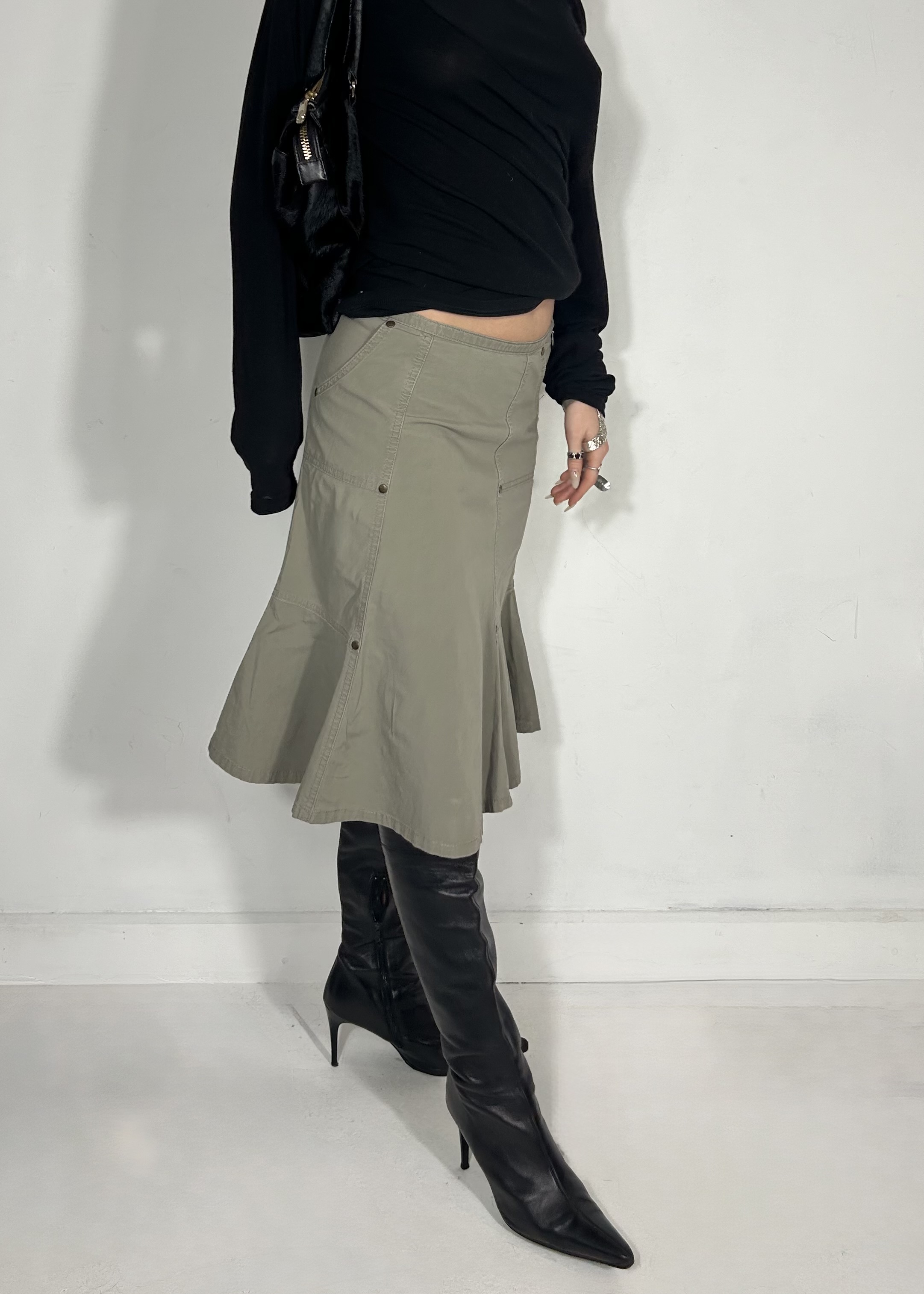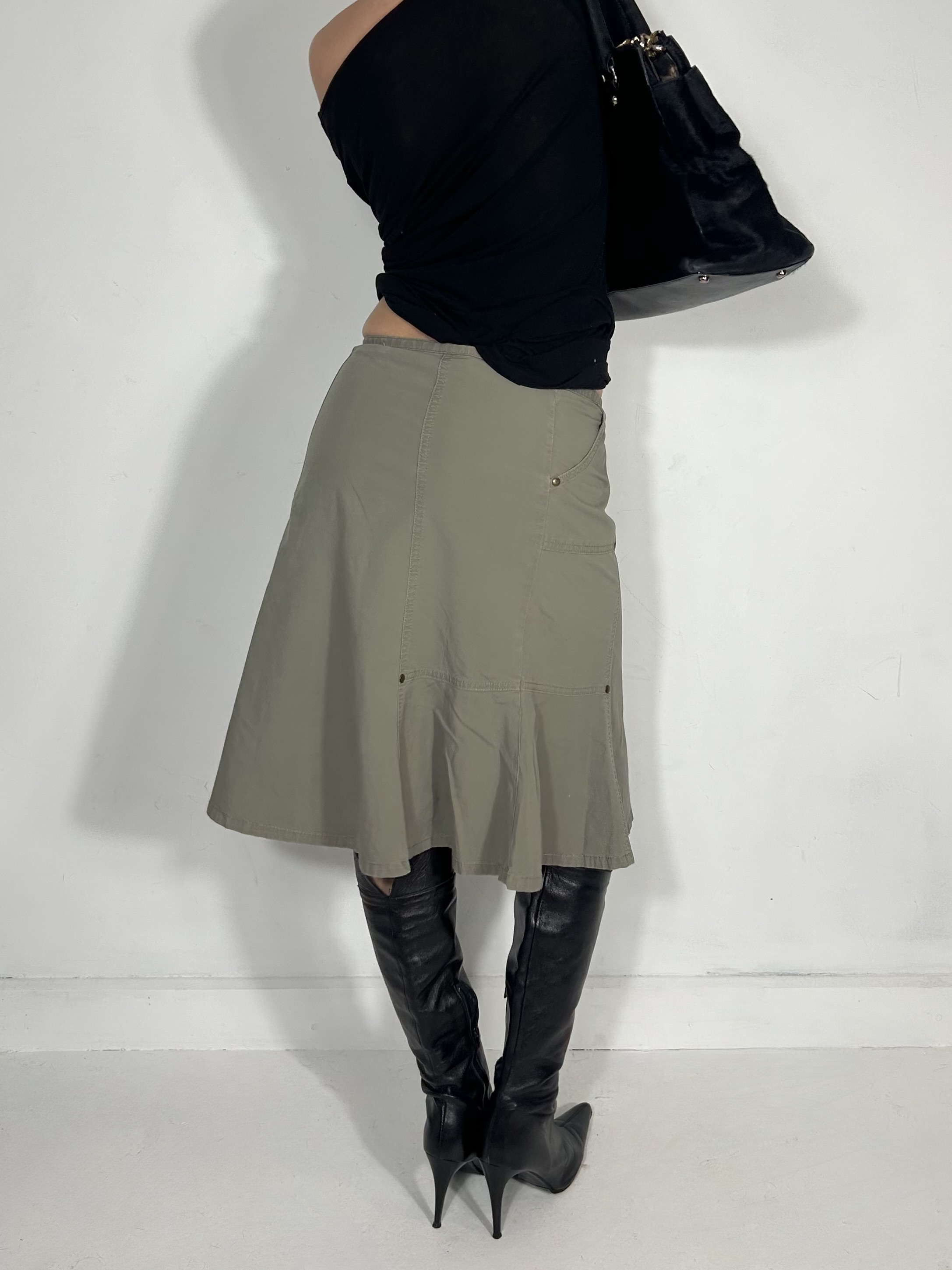 Khaki utility midi skirt with silver stud detailing. Waist 30