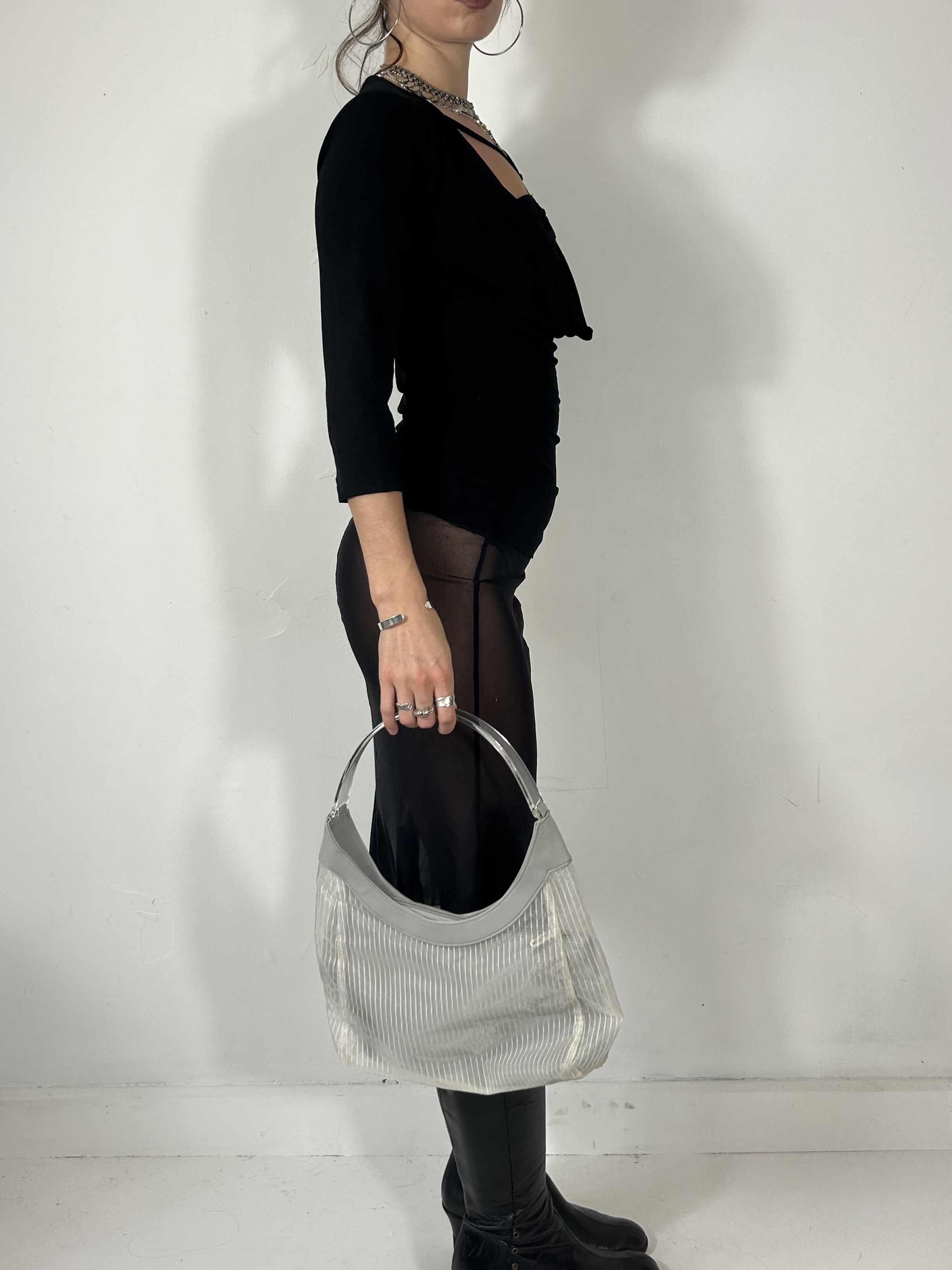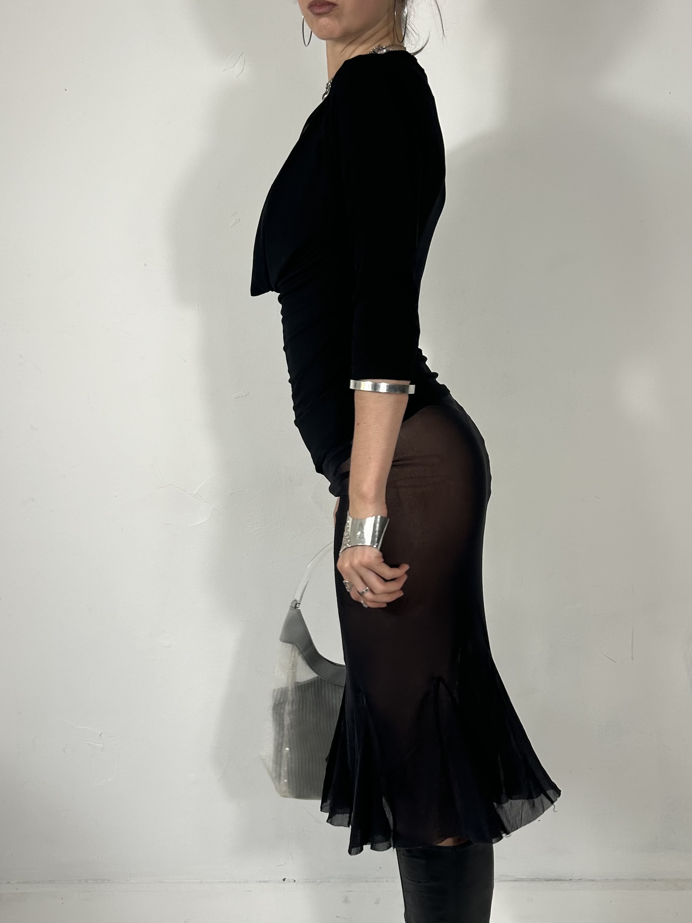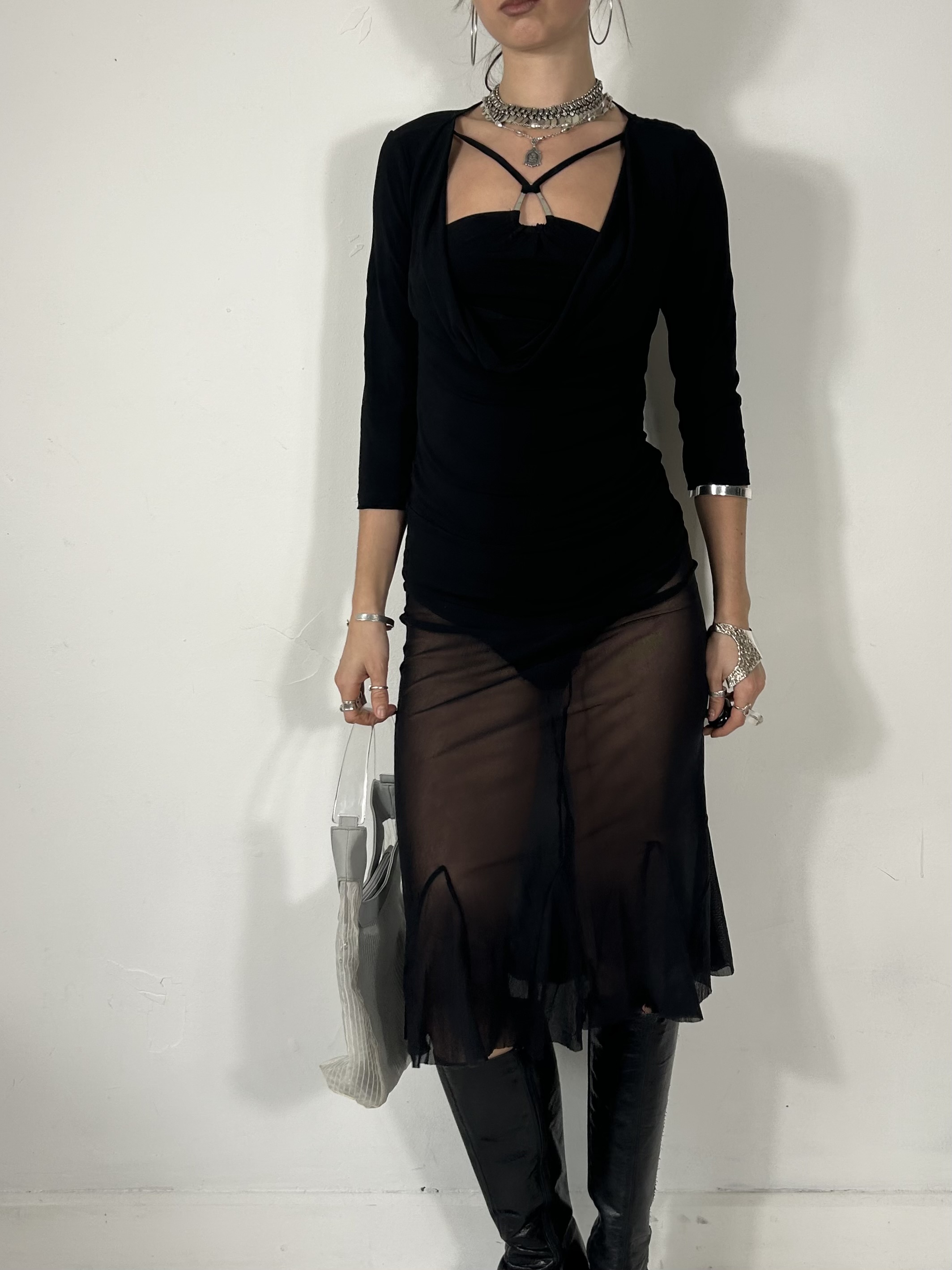 Black 3/4 sleeve with drape top and silver chrome sculptural detail