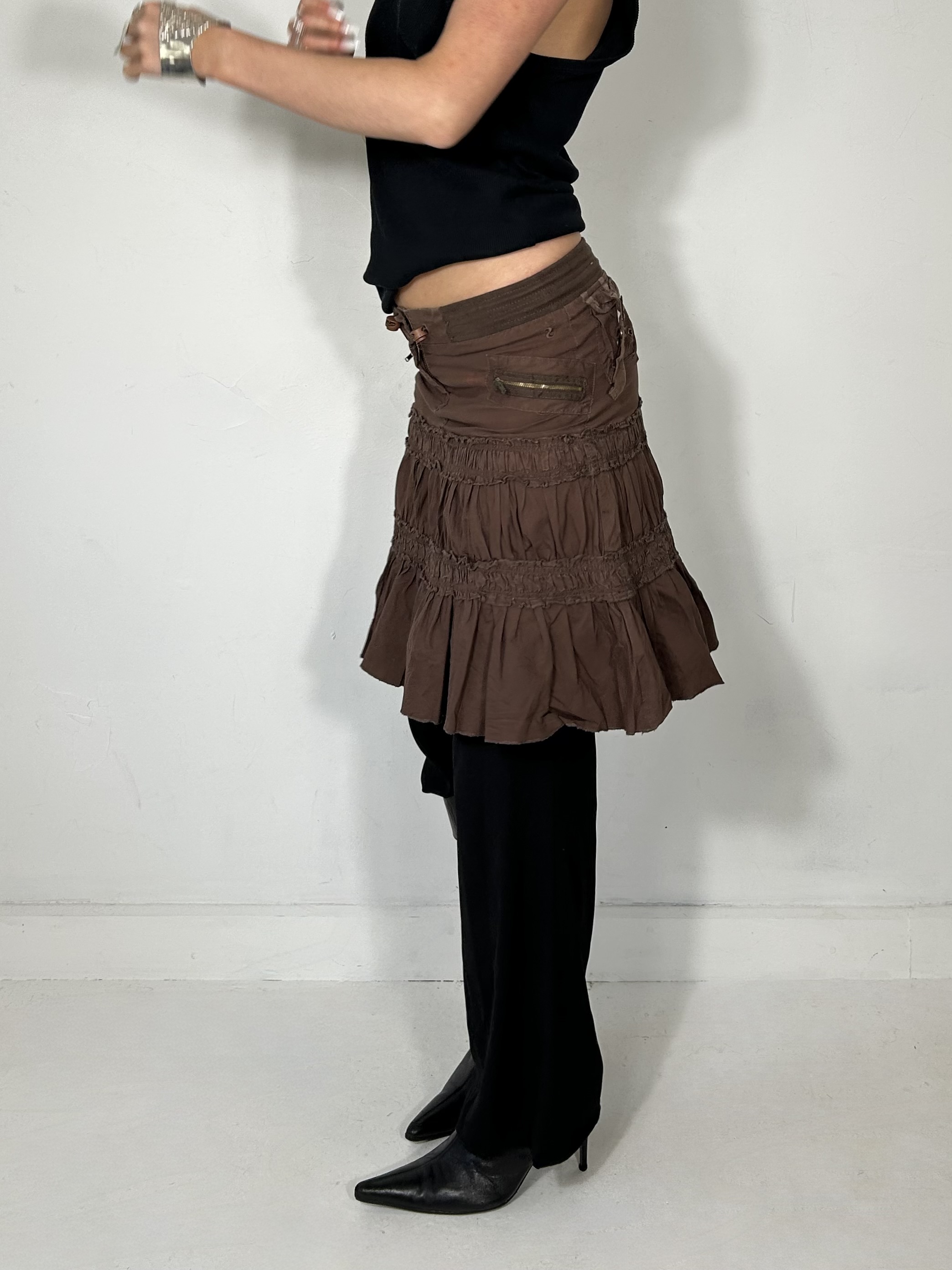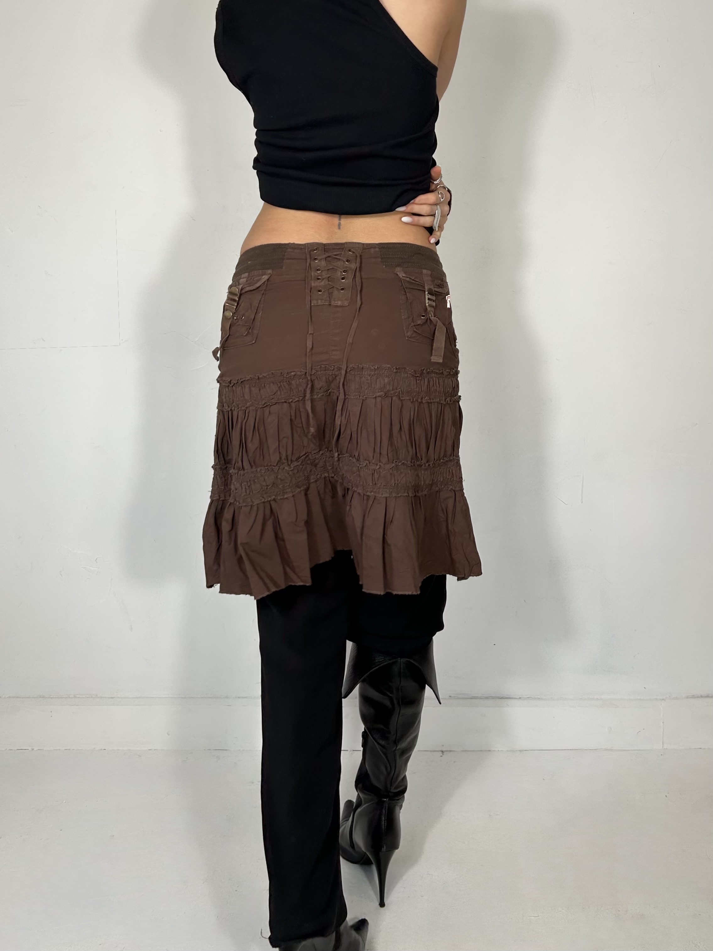 Chocolate brown ruffle Mini skirt with utility toggle detailing. Waist 30