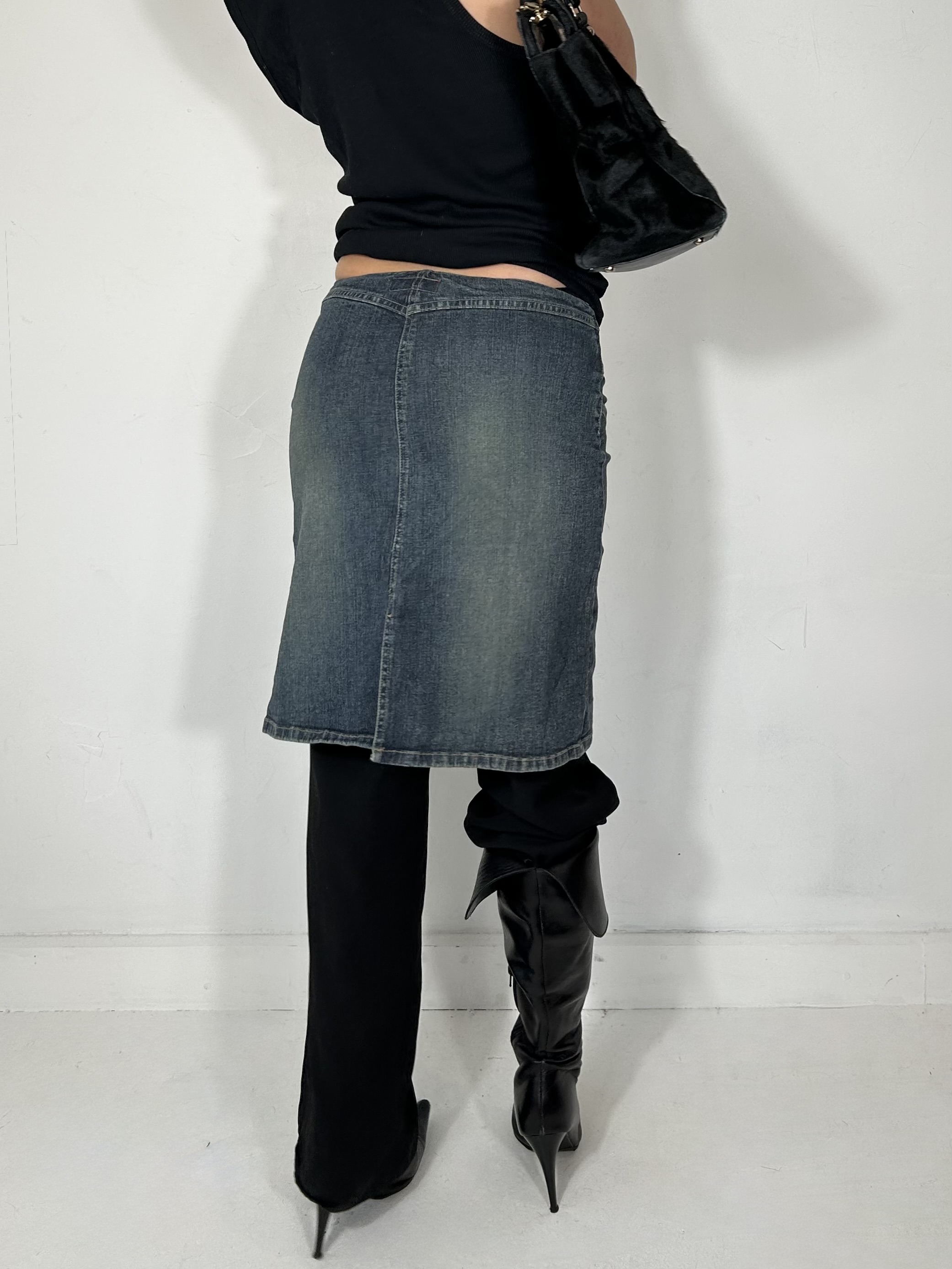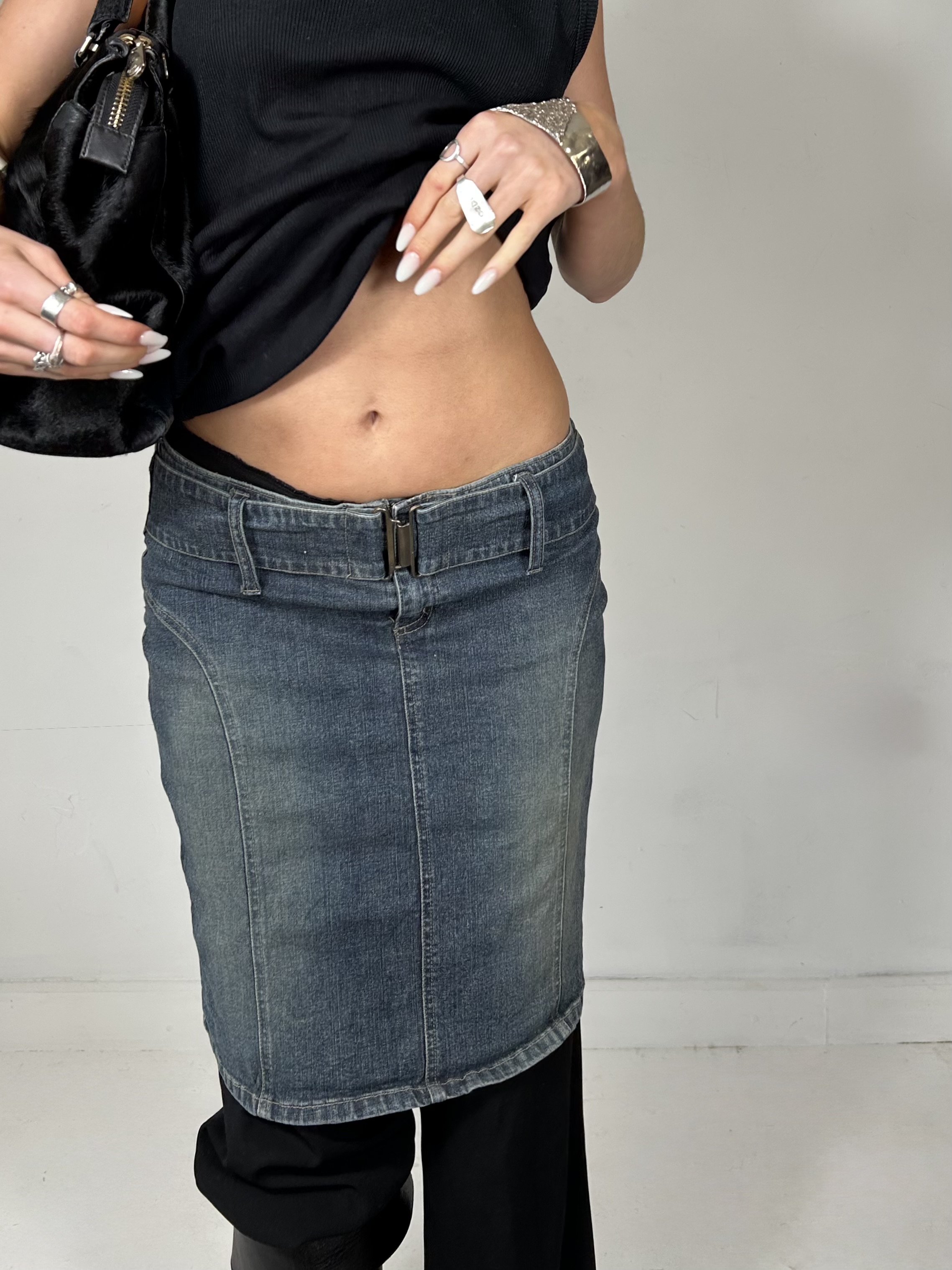 Faded denim midi skirt with metal clasp detailing. Waist 31