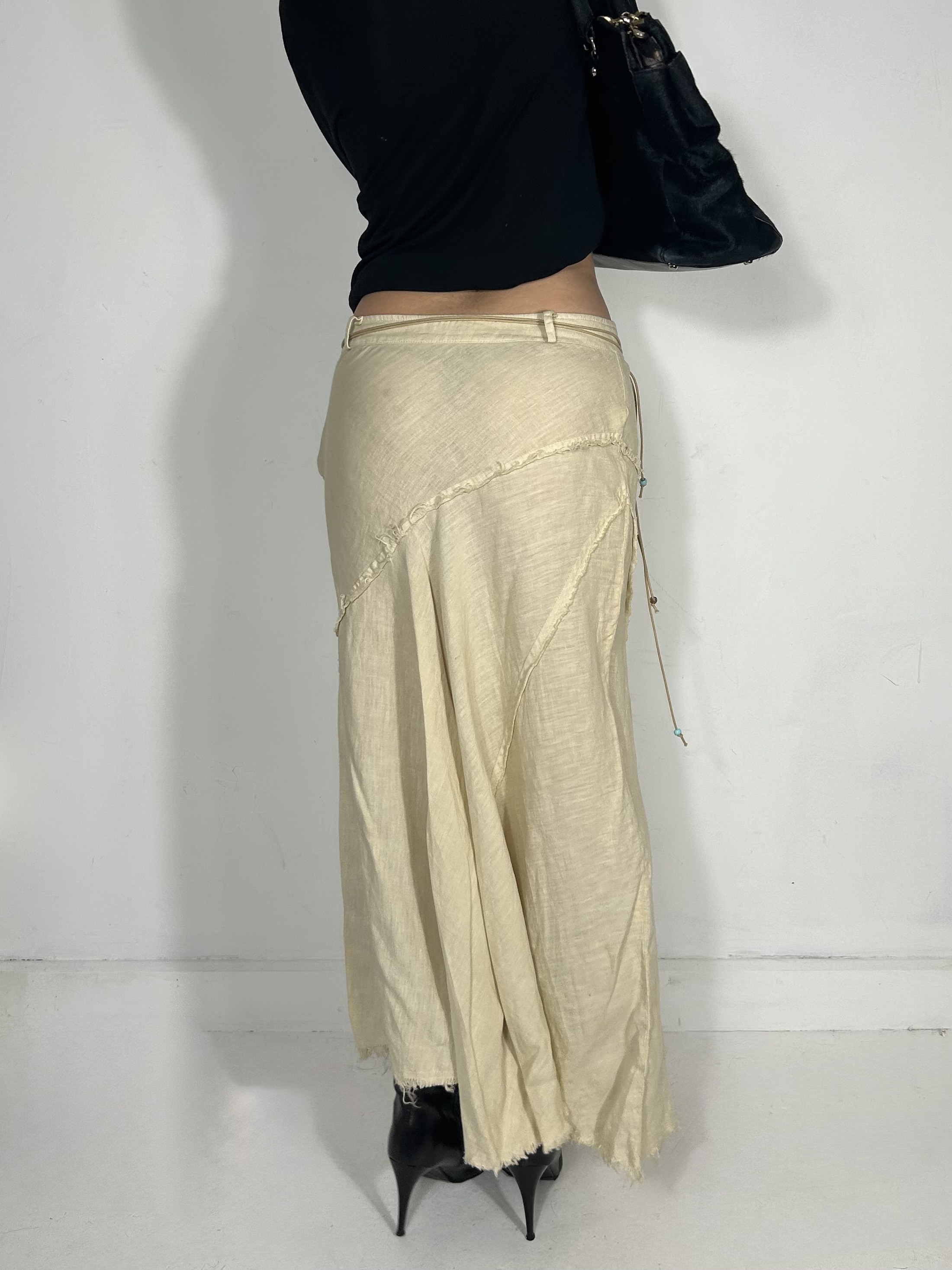 Cream linen style maxi skirt with embellished belt detailing. Waist 30