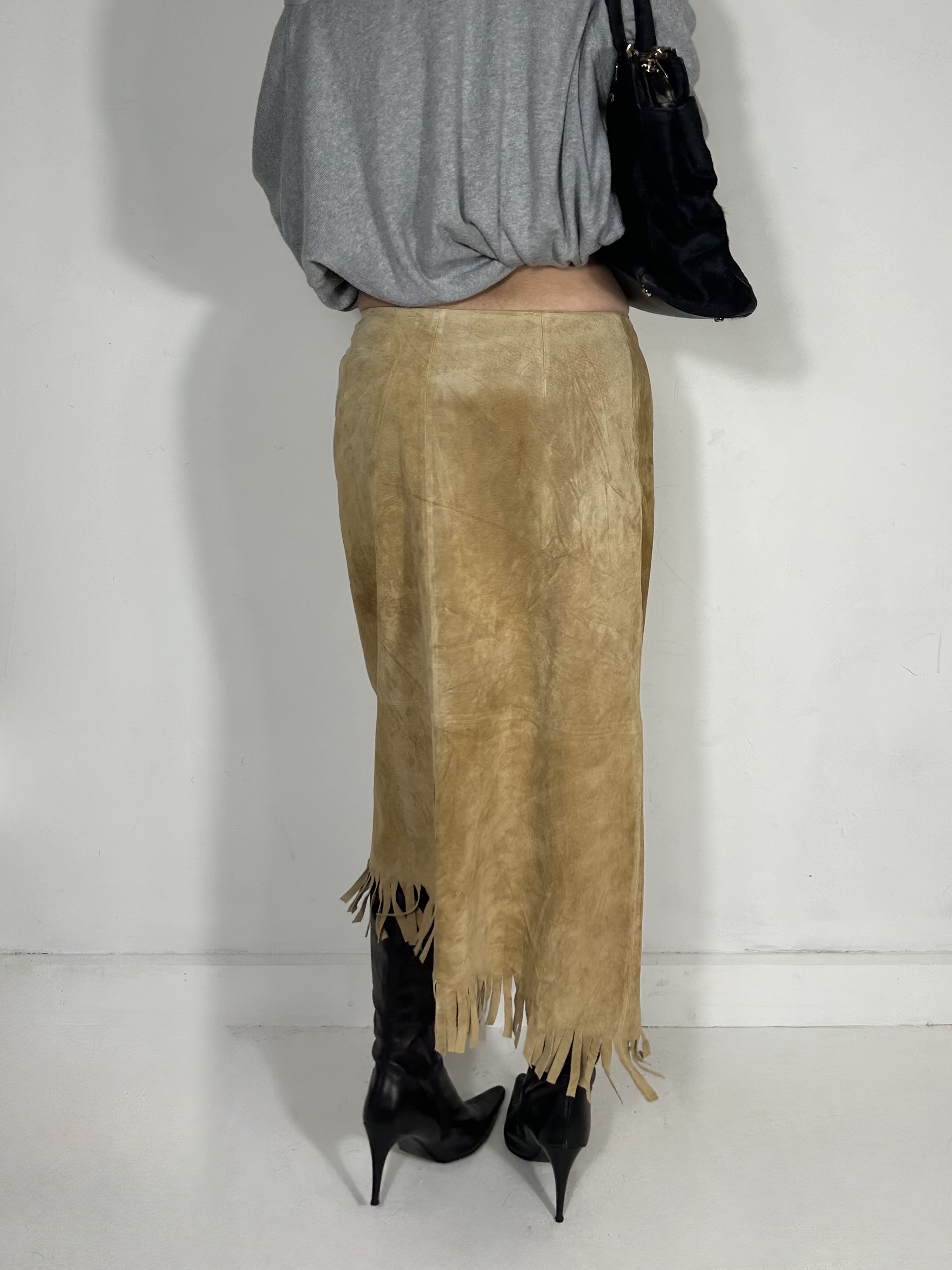 Tan suede maxi skirt with fringe hem detailing. Waist 30