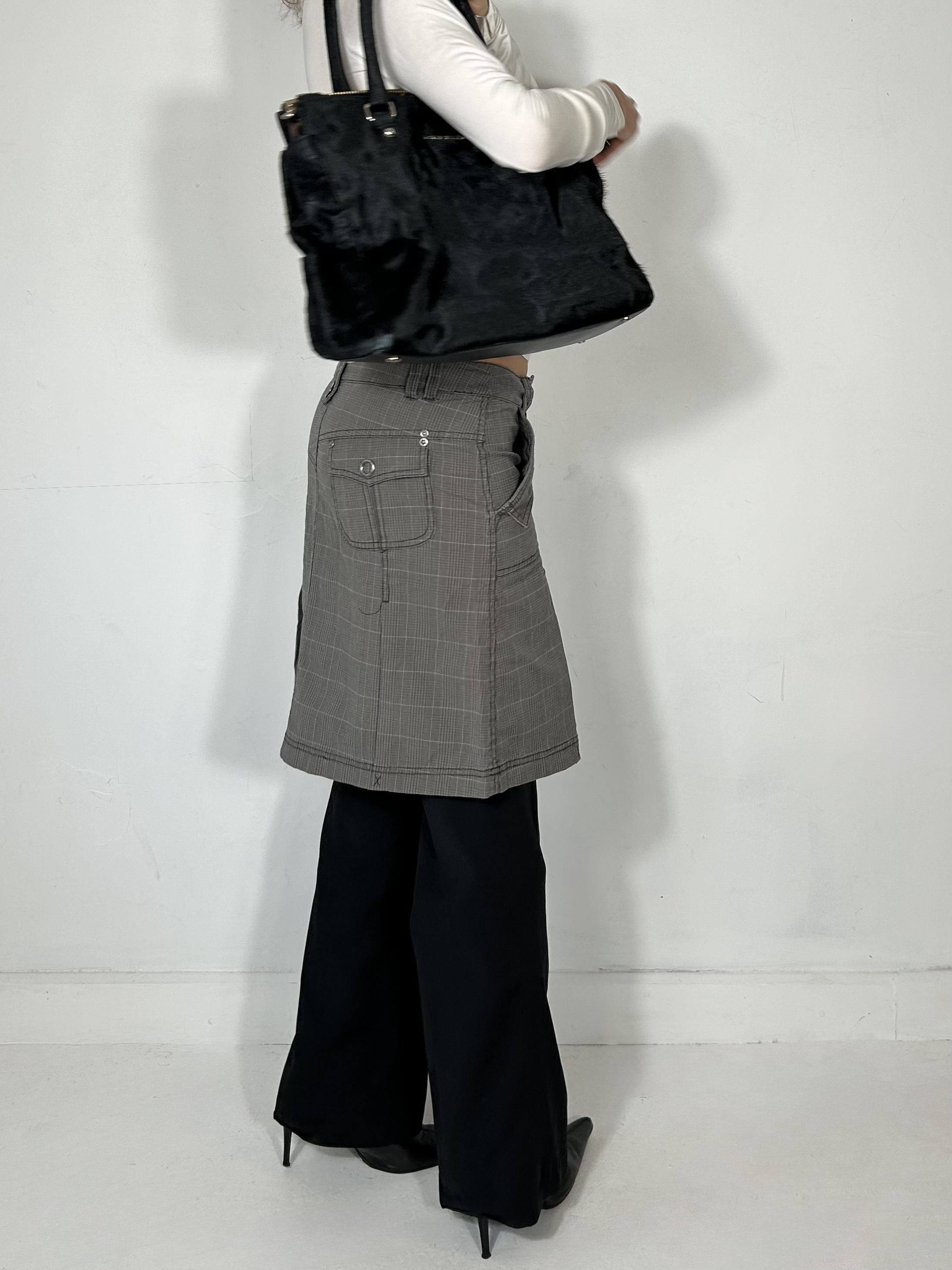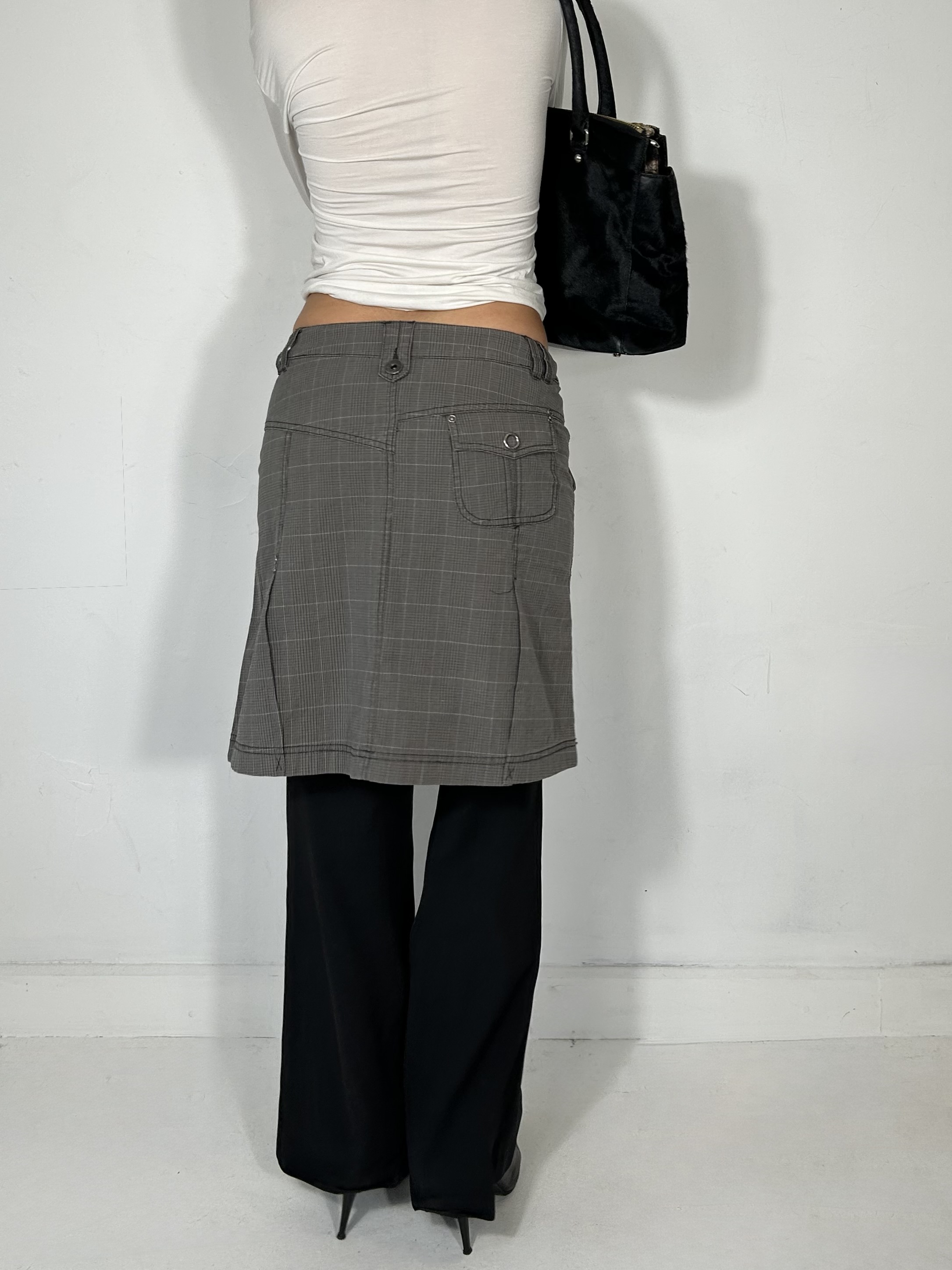 Charcoal grey checkered midi skirt with silver detailing. Waist 31