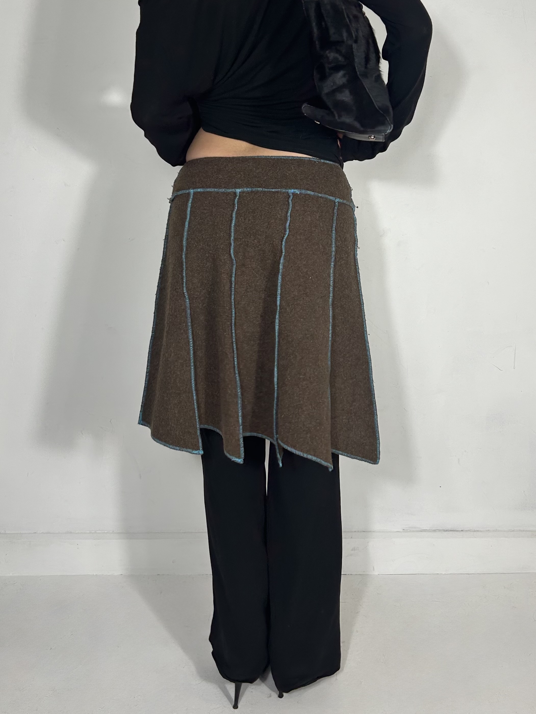 Chocolate brown wool midi skirt with asymmetric hem detail. Waist 28