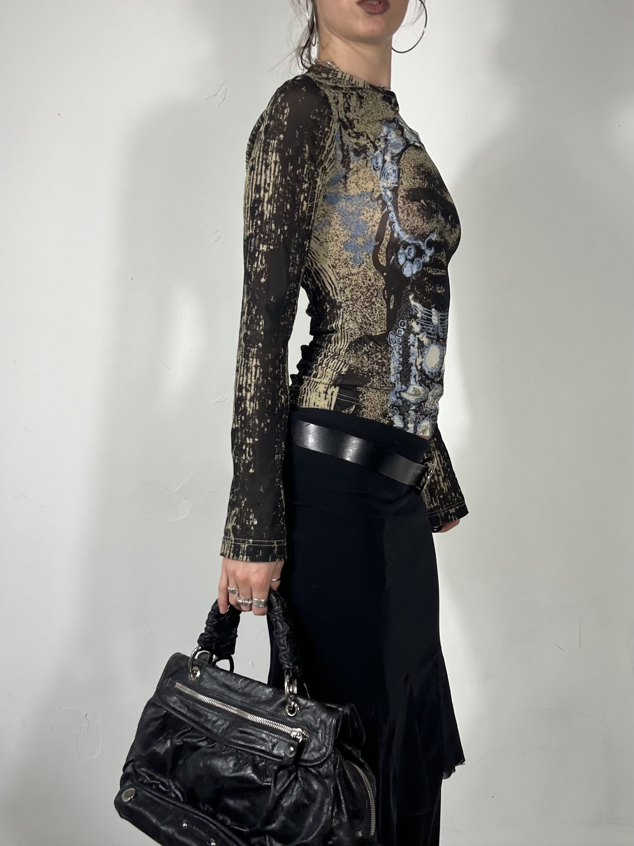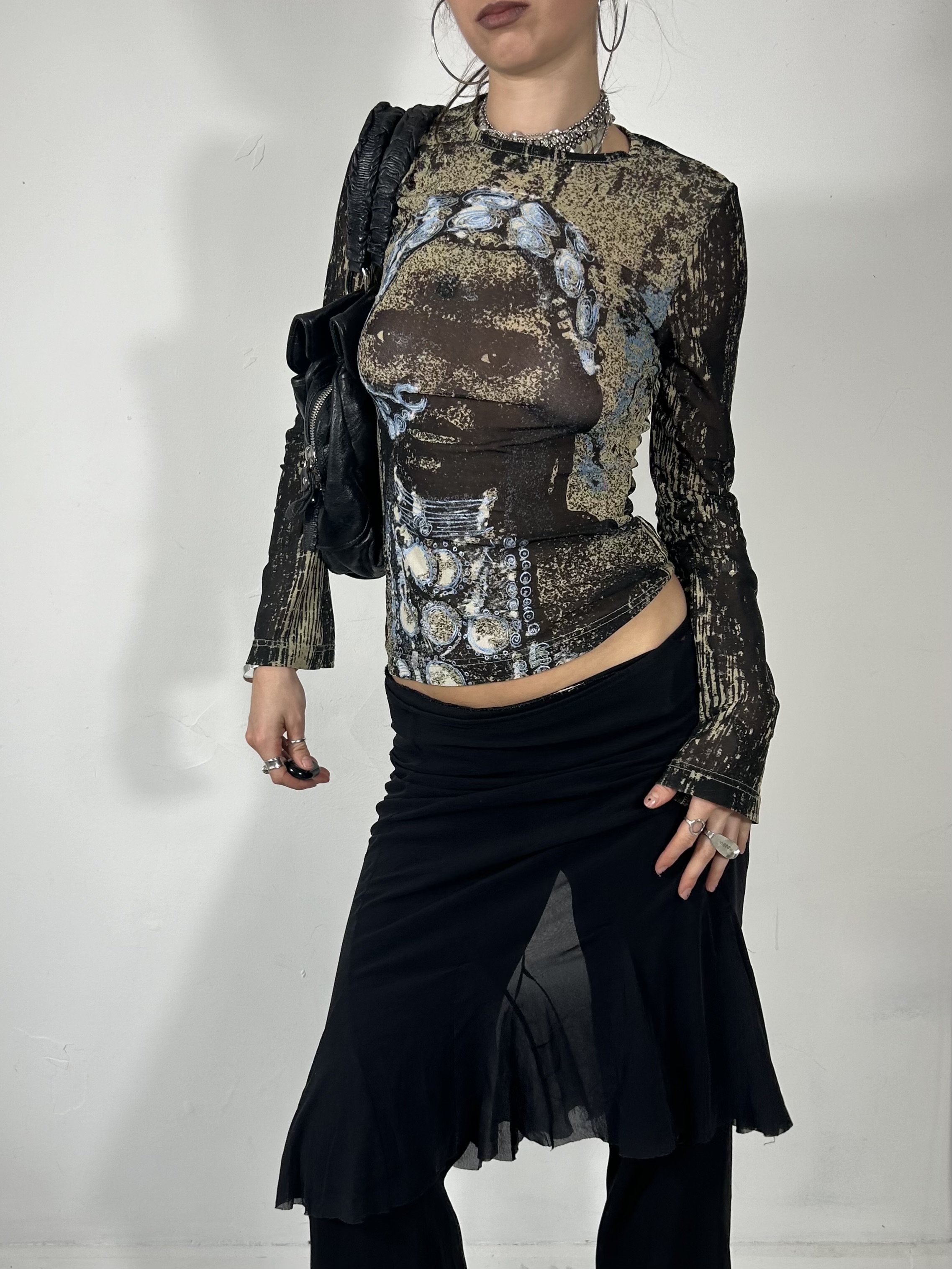 Earth tone long sleeve mesh top with graphic face motif detailing