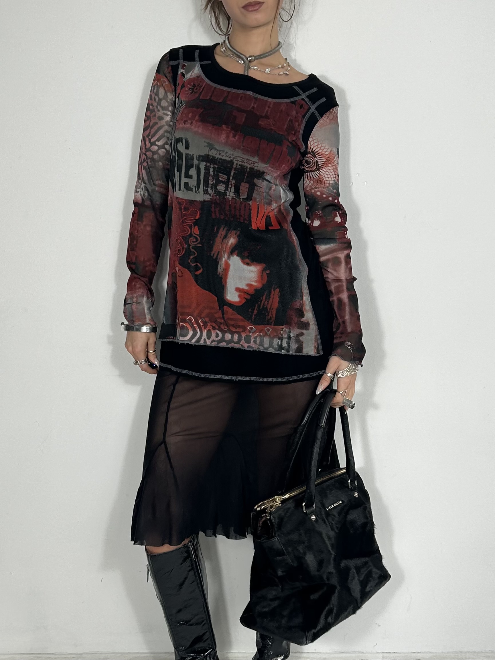 Red graphic long sleeve tee with contrast stitch back detailing