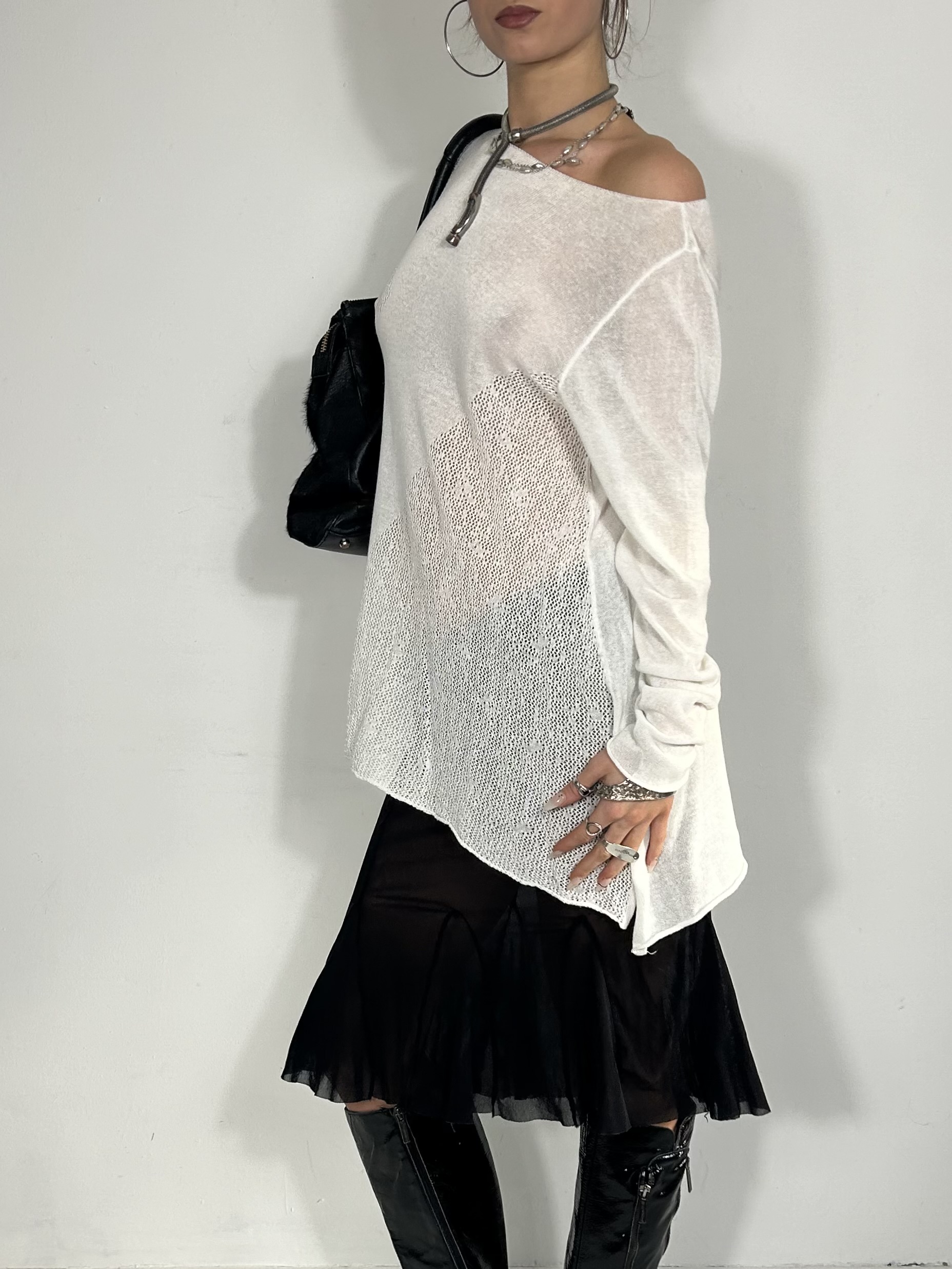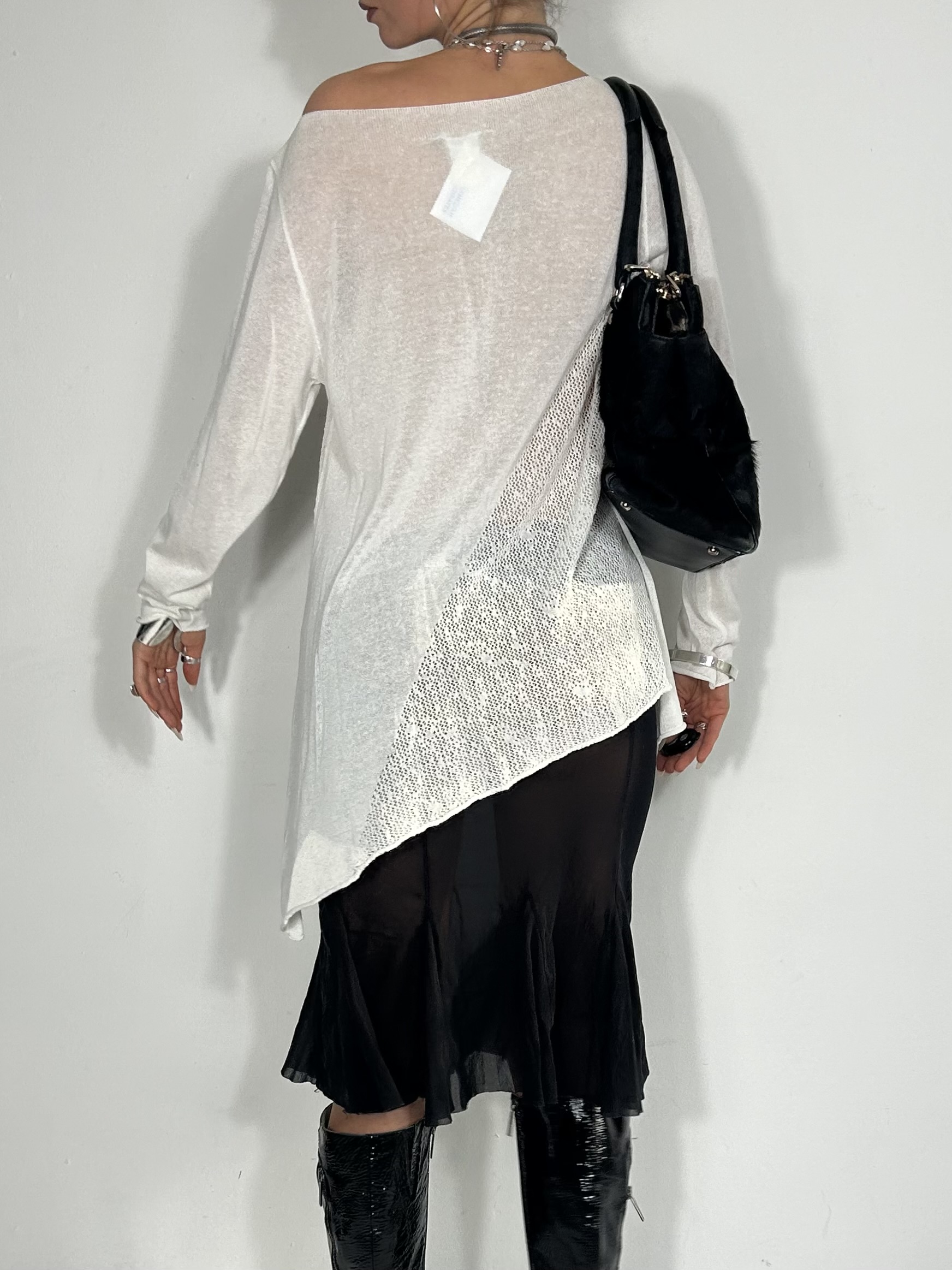 White semi sheer Sarah Pacini fine knit drape top with asymmetrical hem