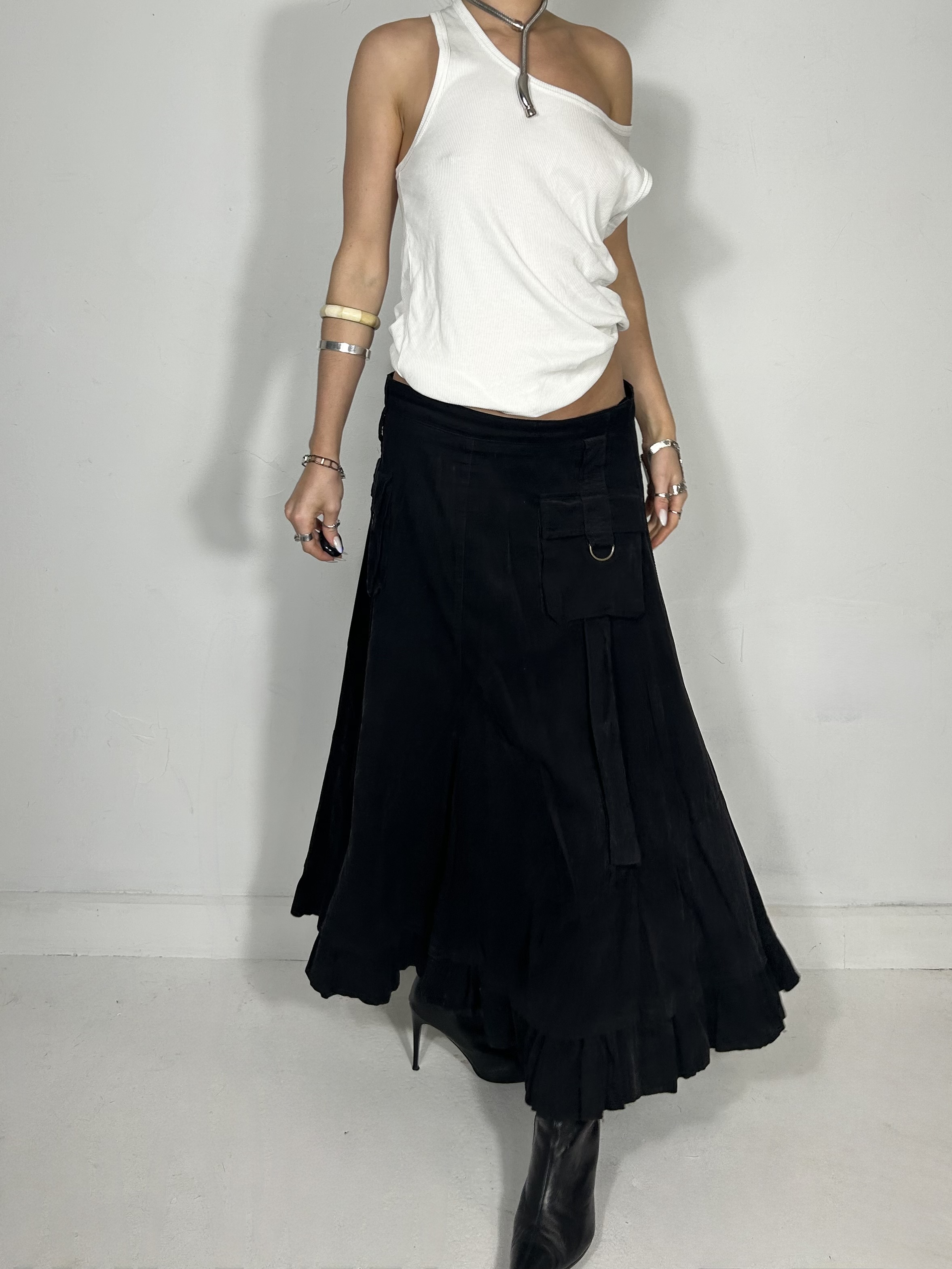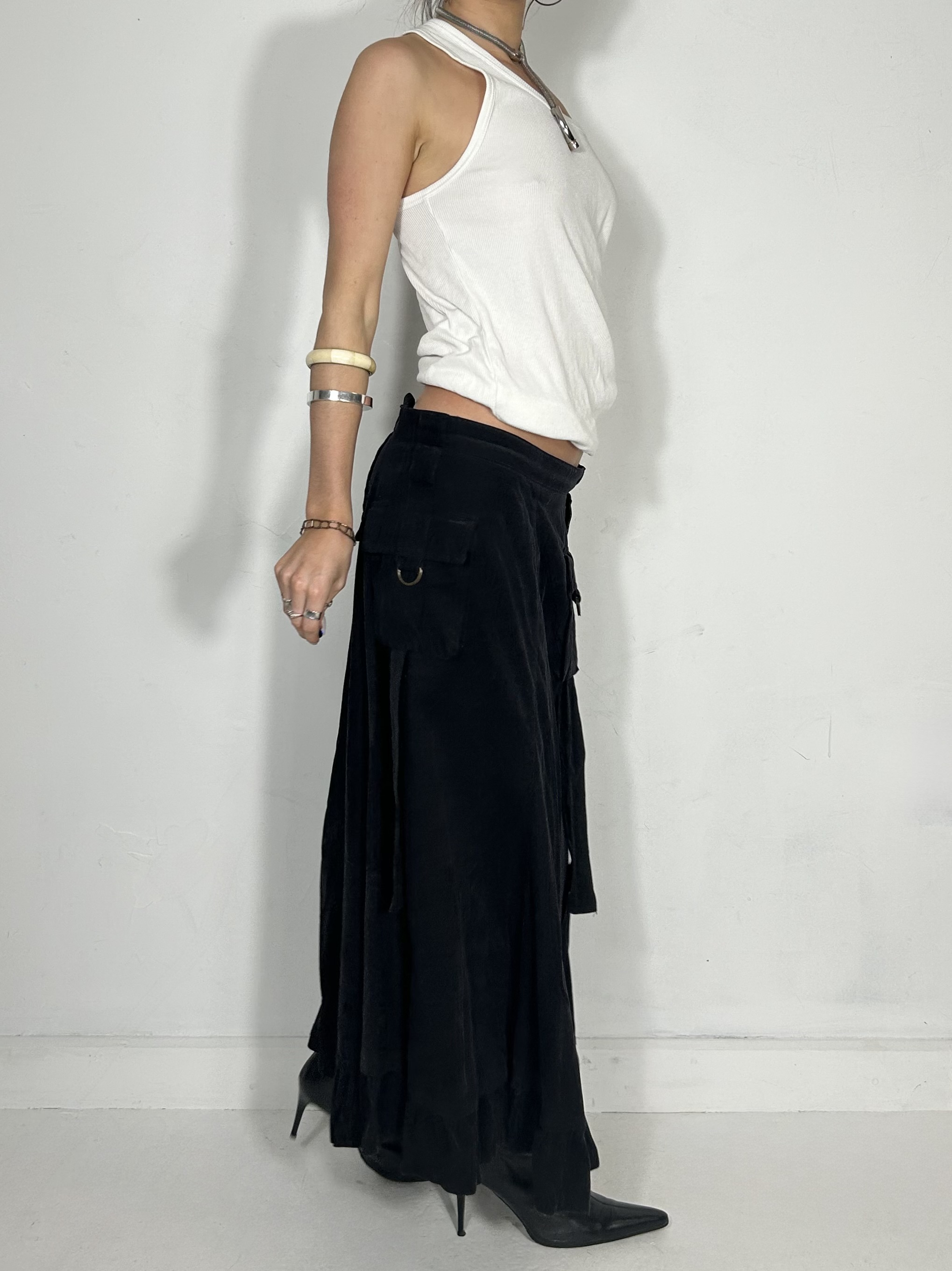 Midnight blue corduroy maxi skirt with utility pocket detailing. Waist 33