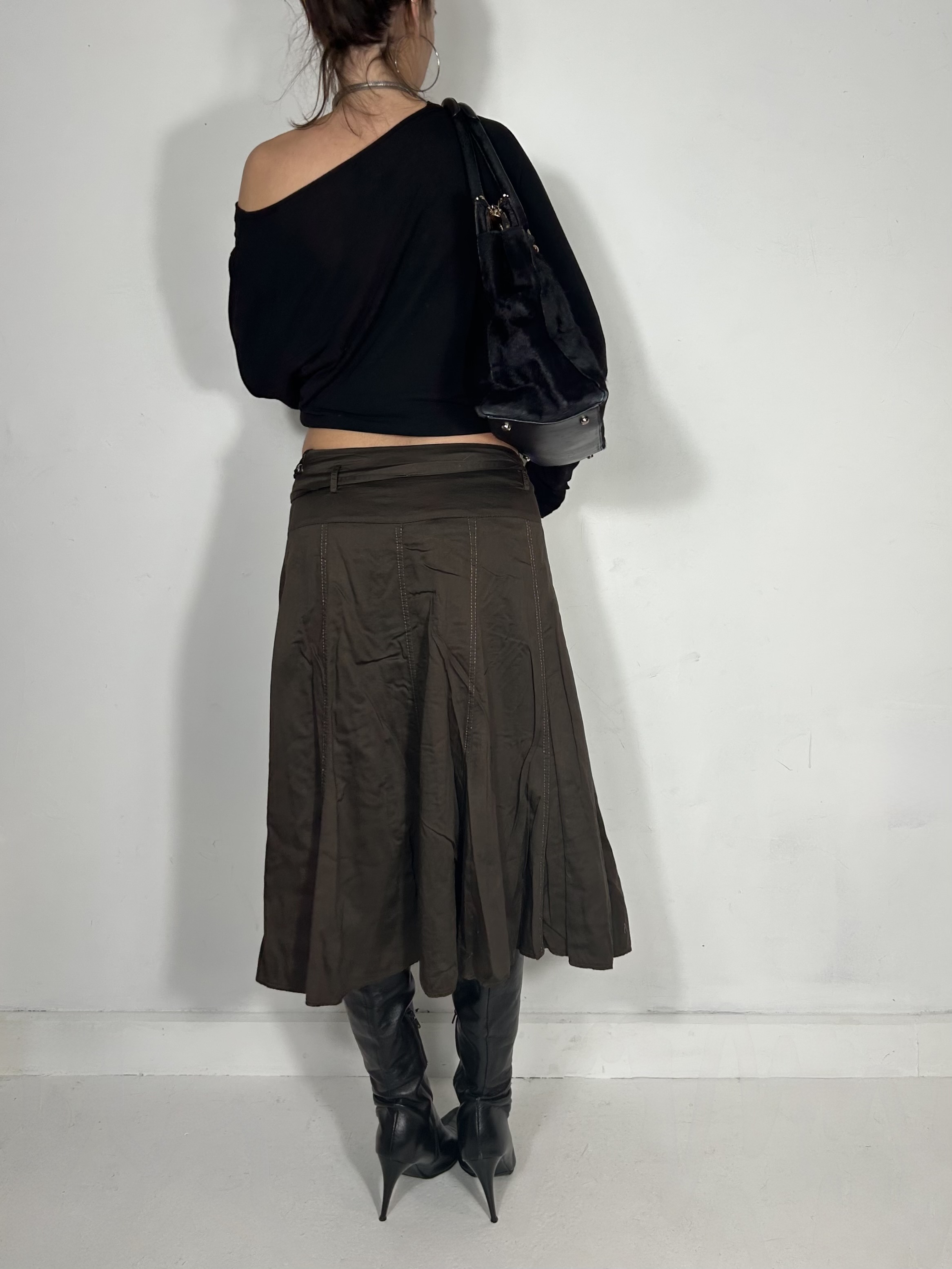 Earthy drop waist midi skirt with belt detailing. Waist 30