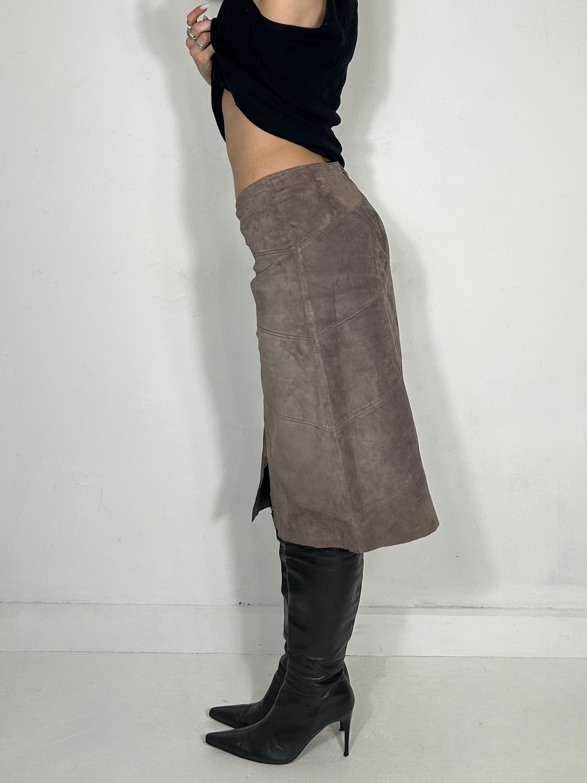 Earthy suede low rise pencil skirt with slit detailing. Waist 30