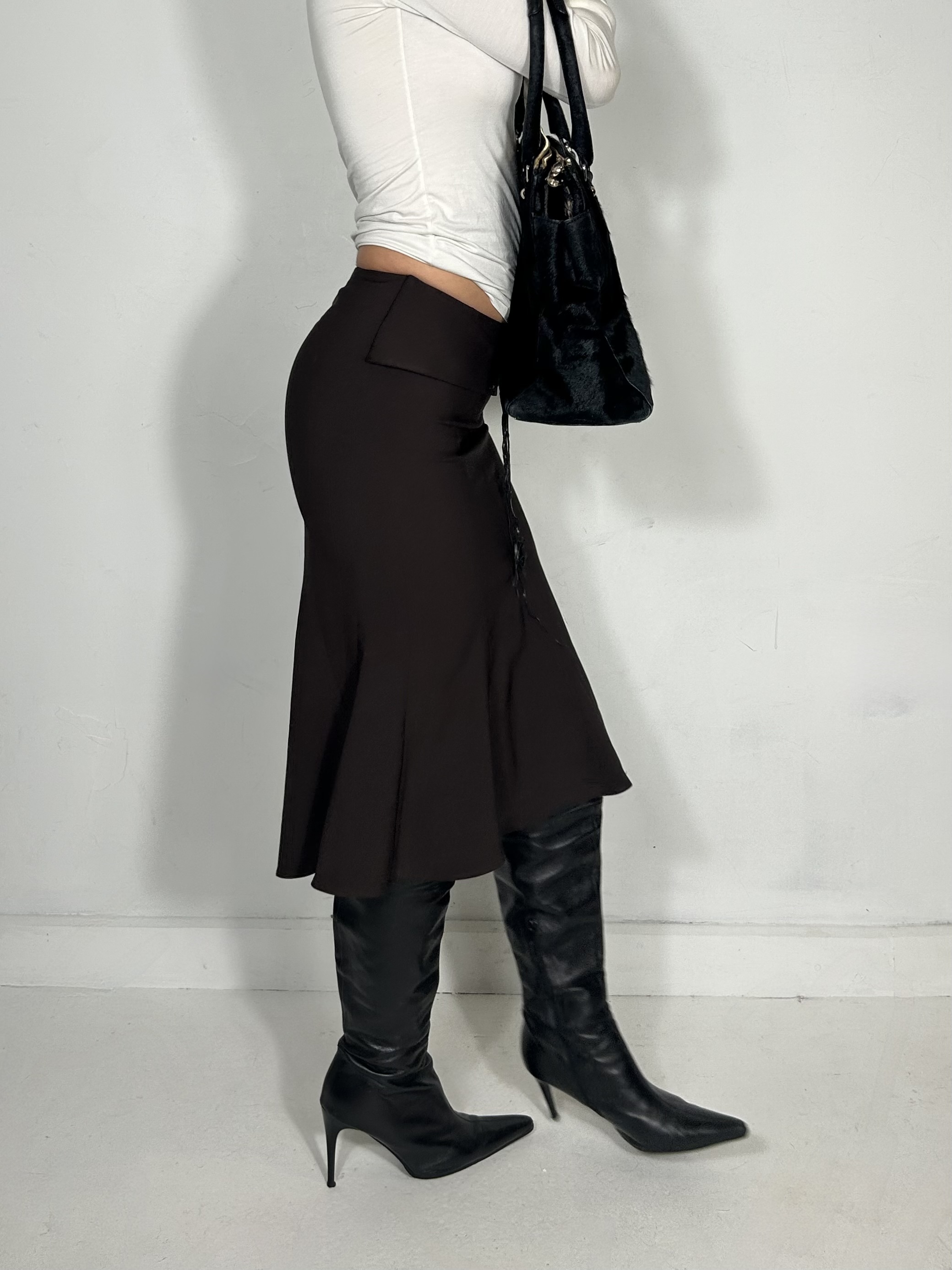 Chocolate brown stretch midi skirt with belted detailing. Waist 30