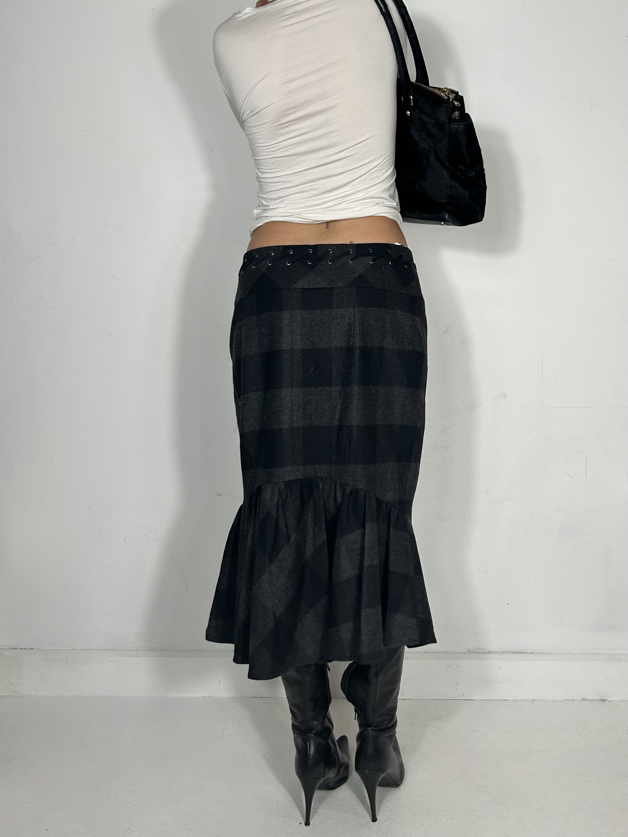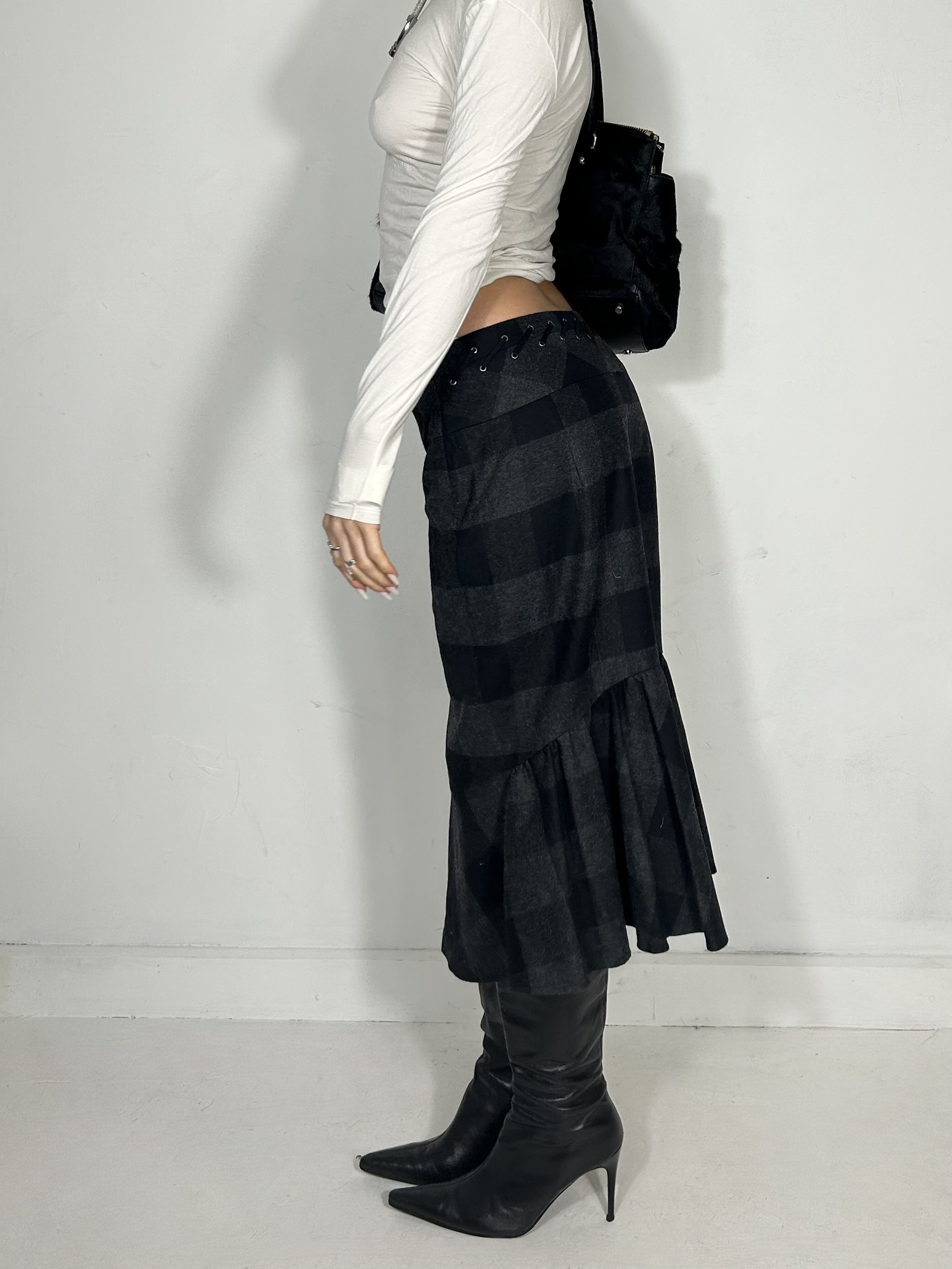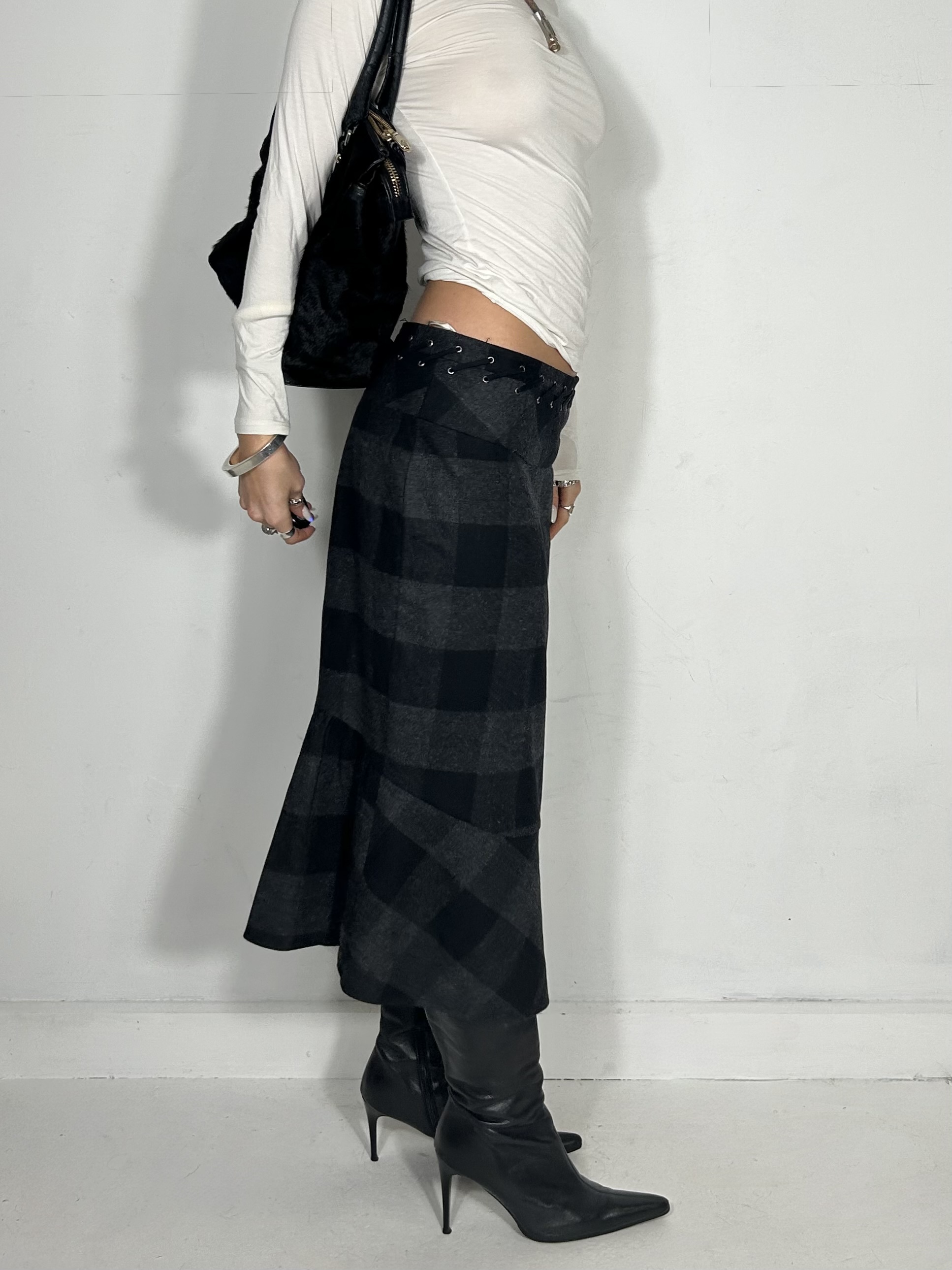 Charcoal grey plaid maxi skirt with lace up waist detailing. Waist 32