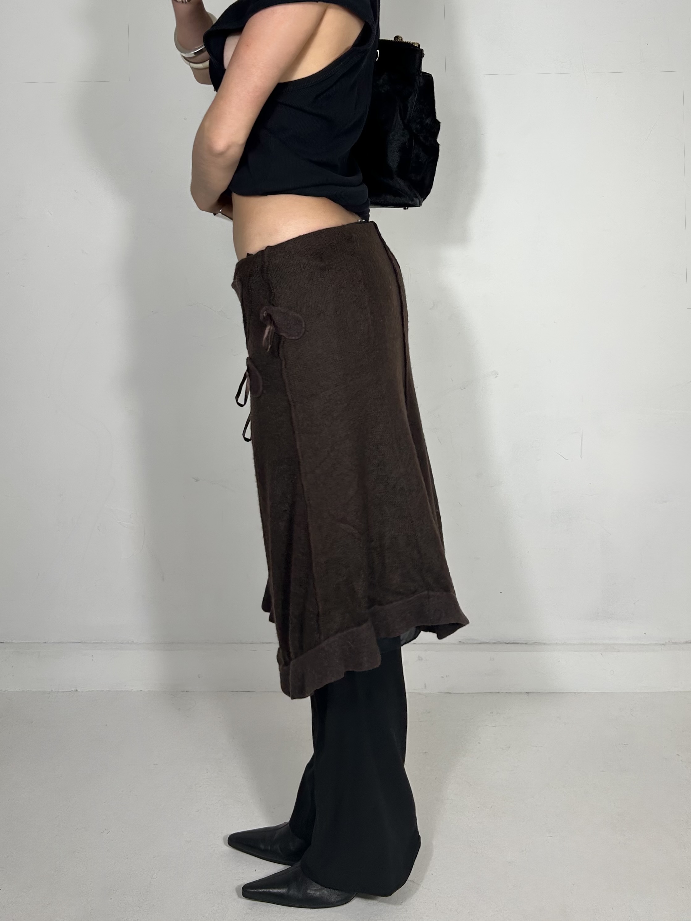 Chocolate brown knit midi skirt with asymmetric detailing. Waist 28