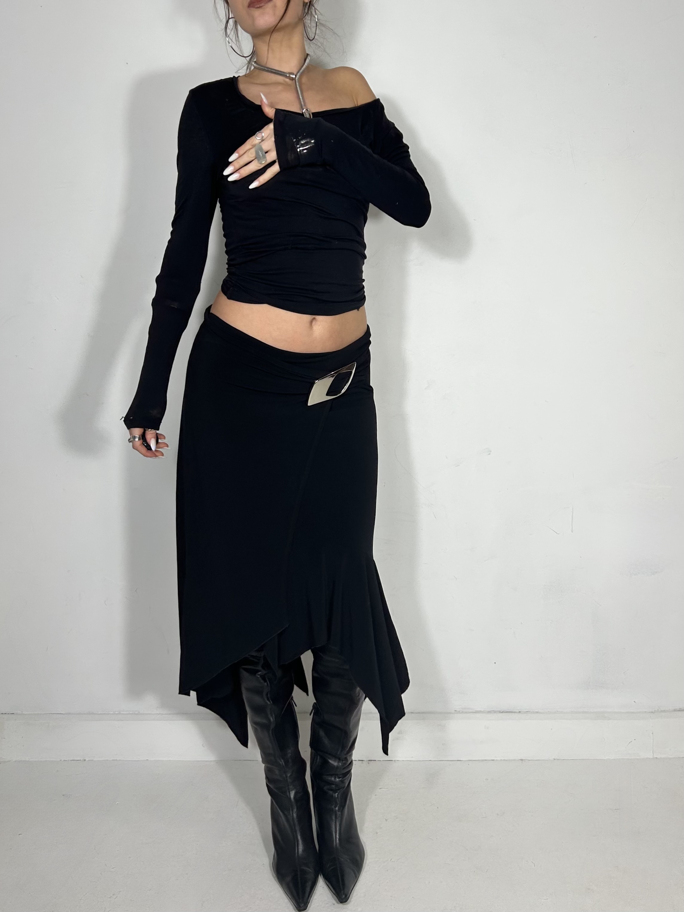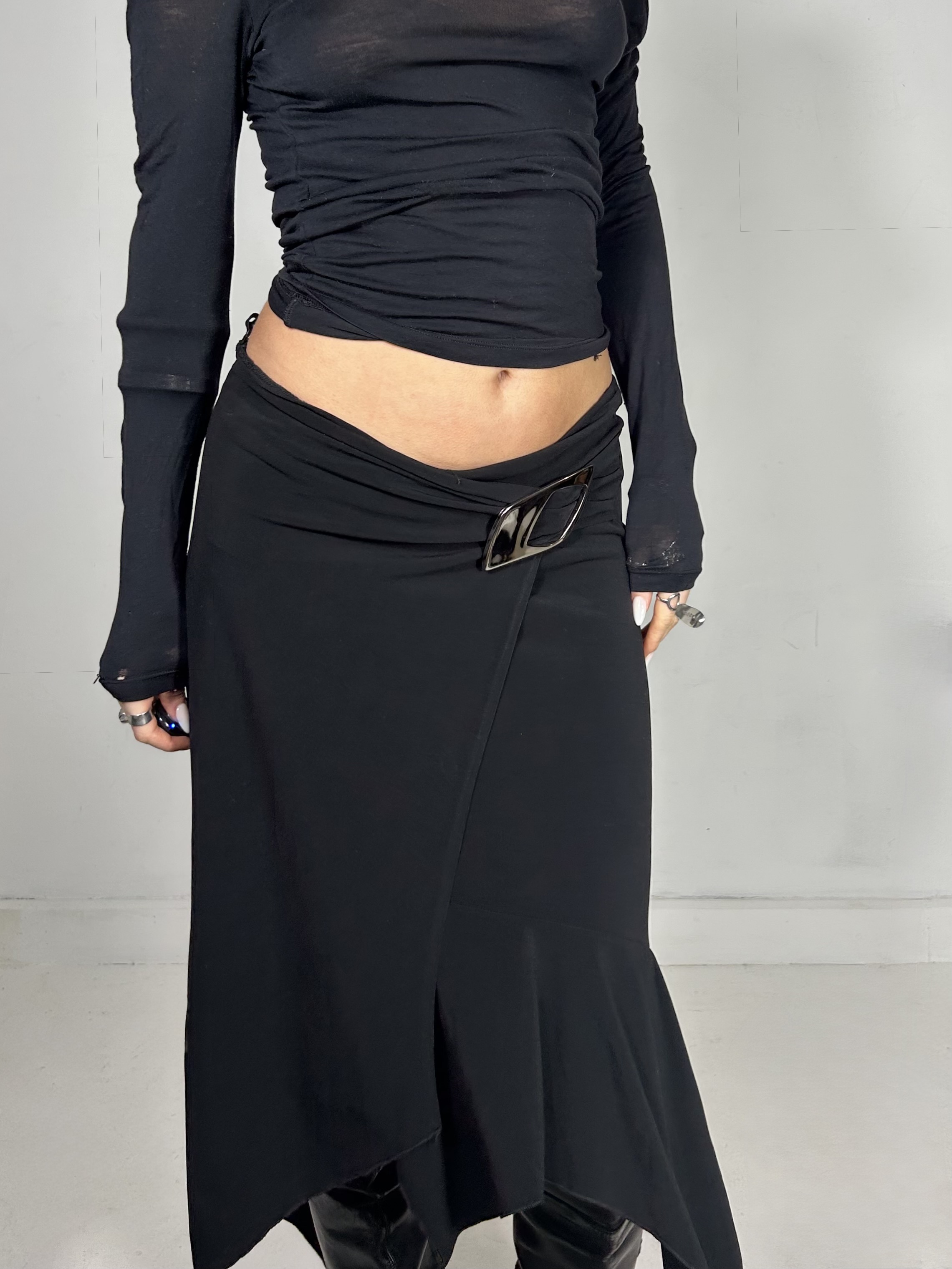 Black asymmetrical midi skirt with silver chrome buckle detailing. Waist 30