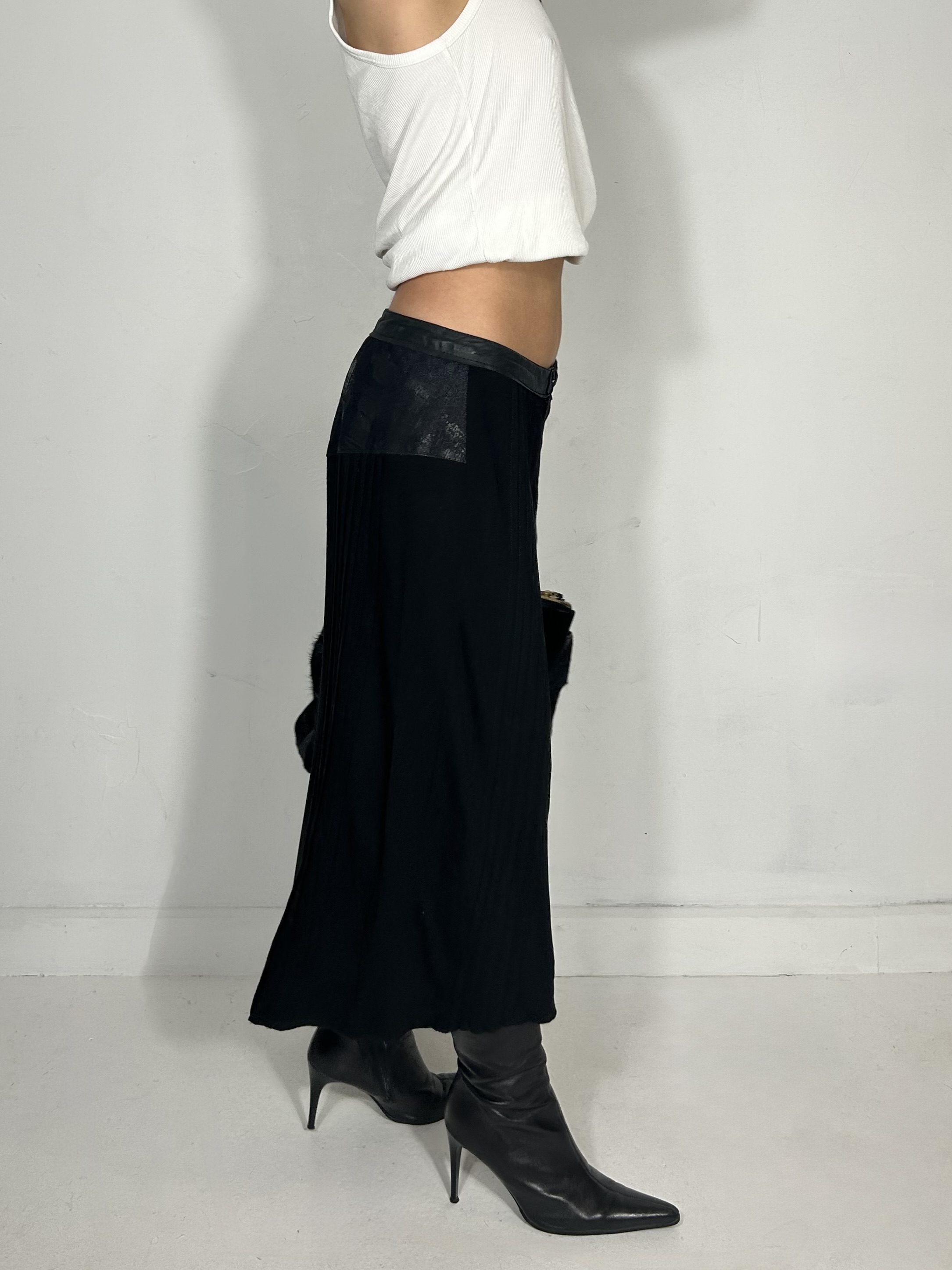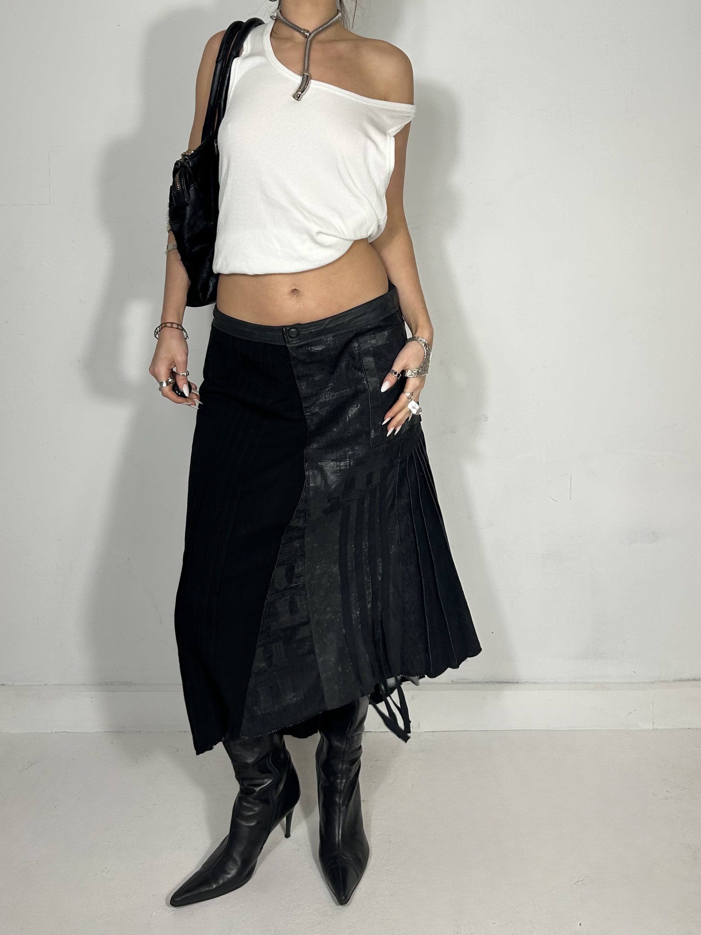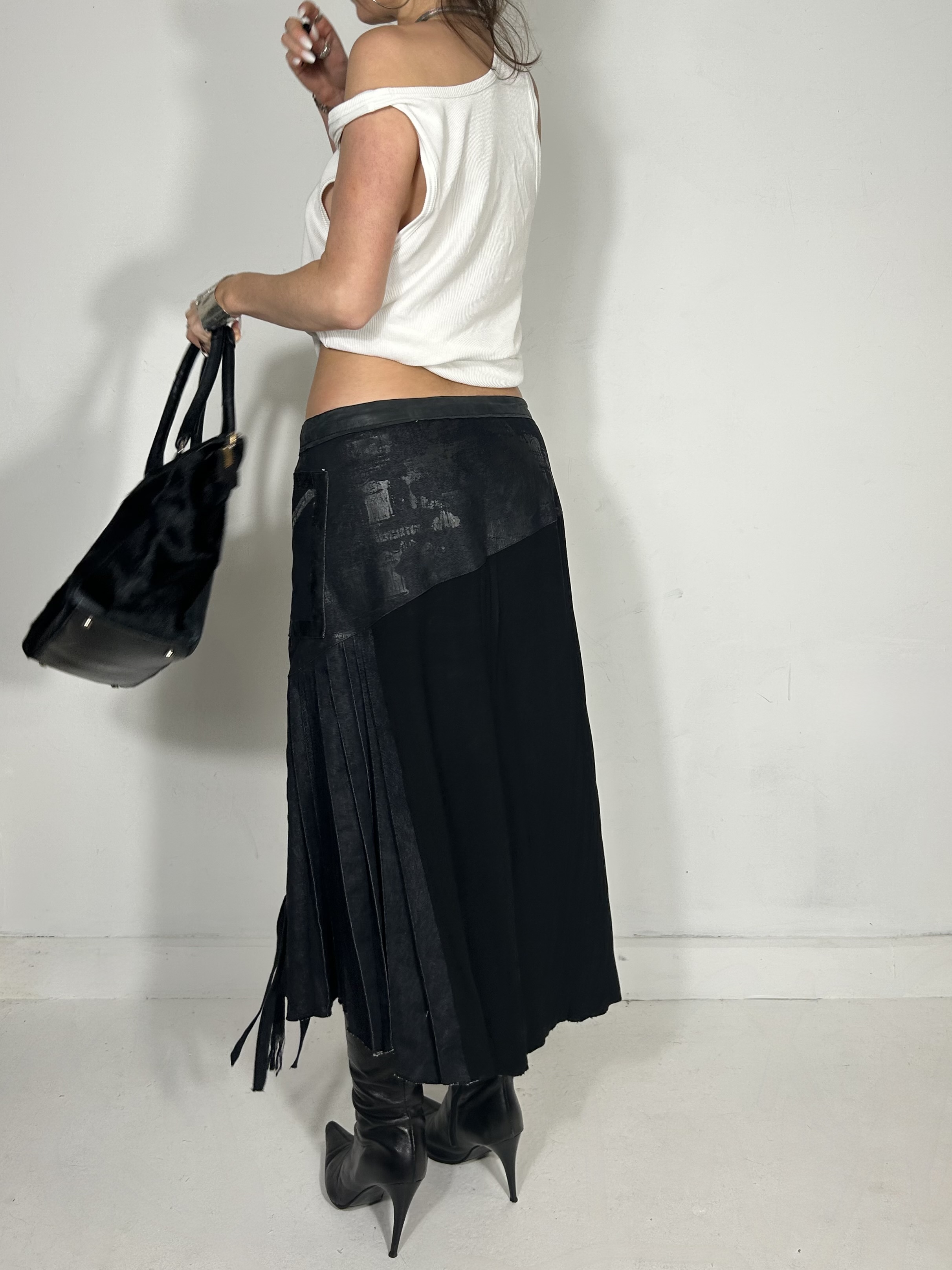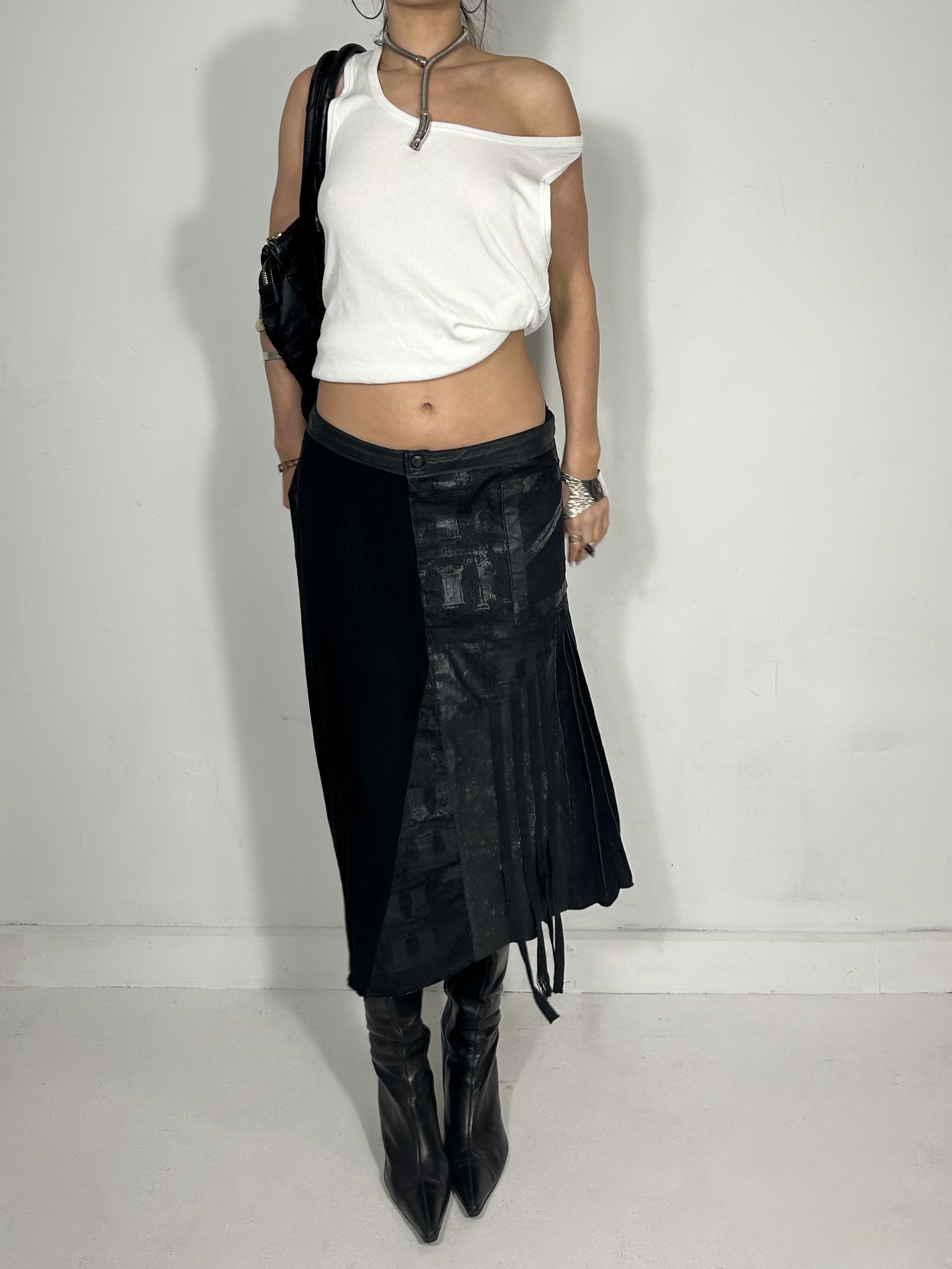 Midnight blue and black asymmetrical mixed texture midi skirt with asymmetrical detailing. Waist 32