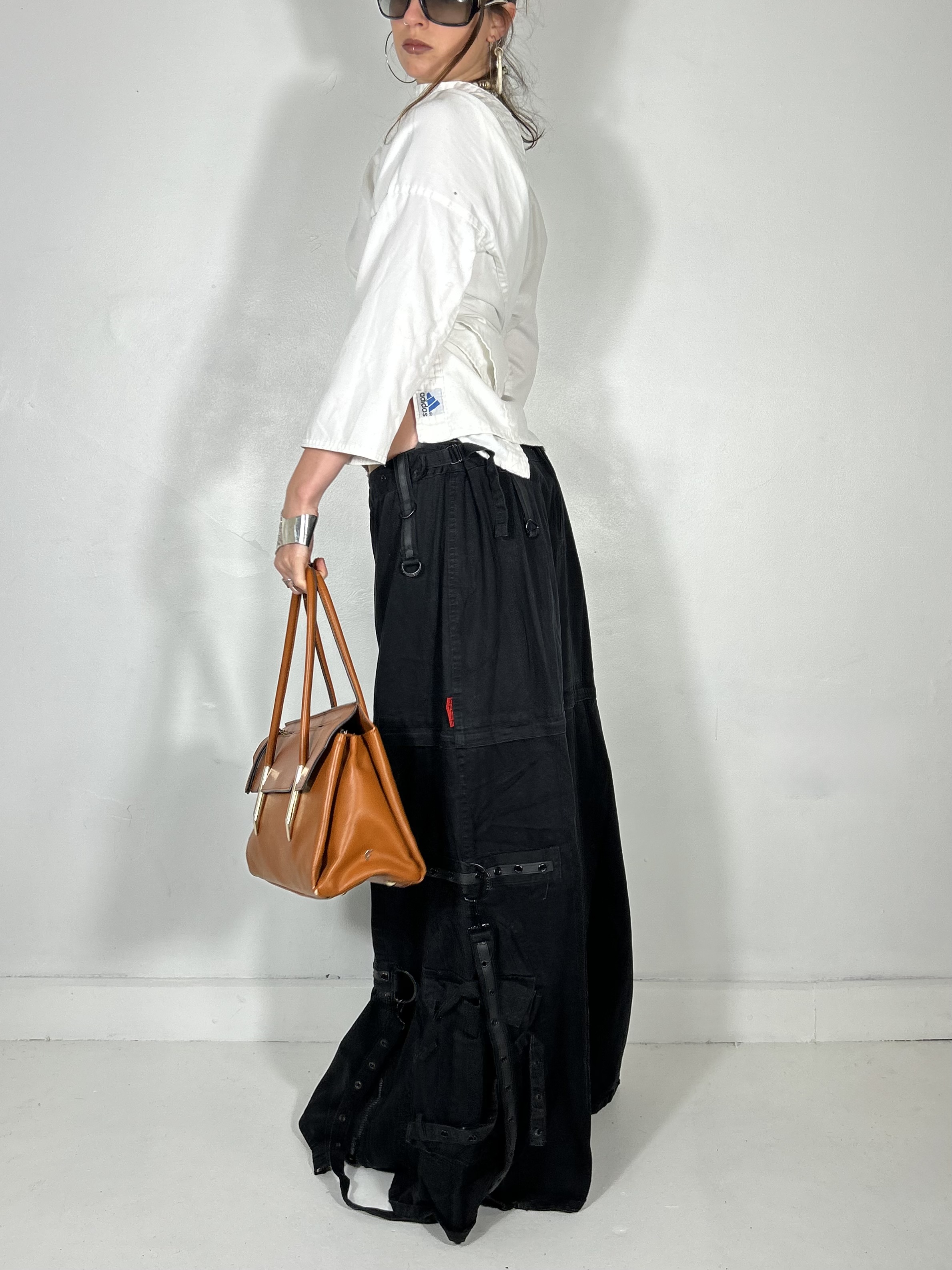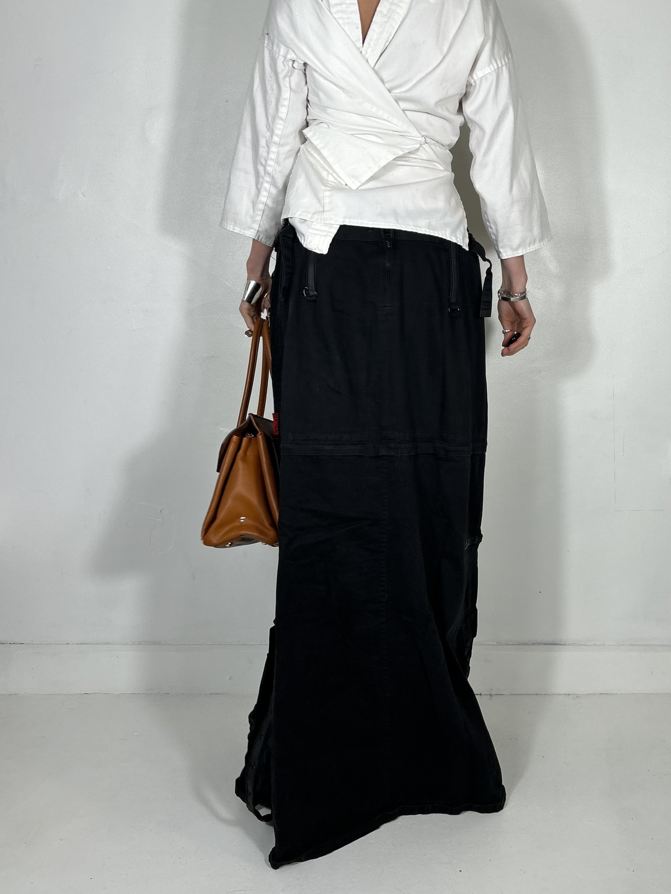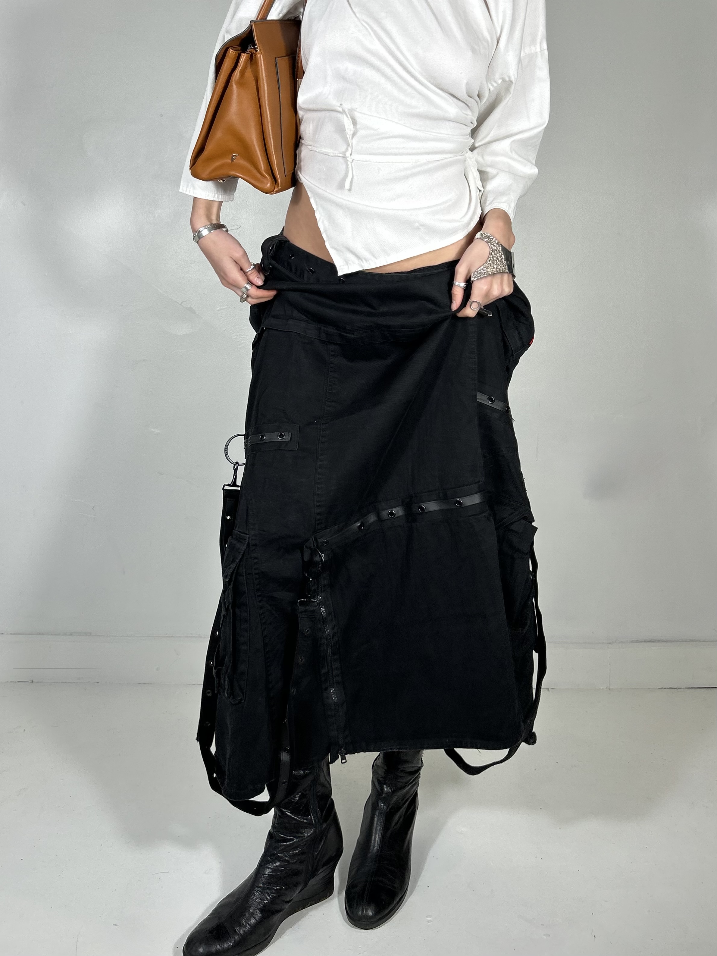 Black adjustable waist utility maxi skirt with multi way zip detailing. Waist 34-38
