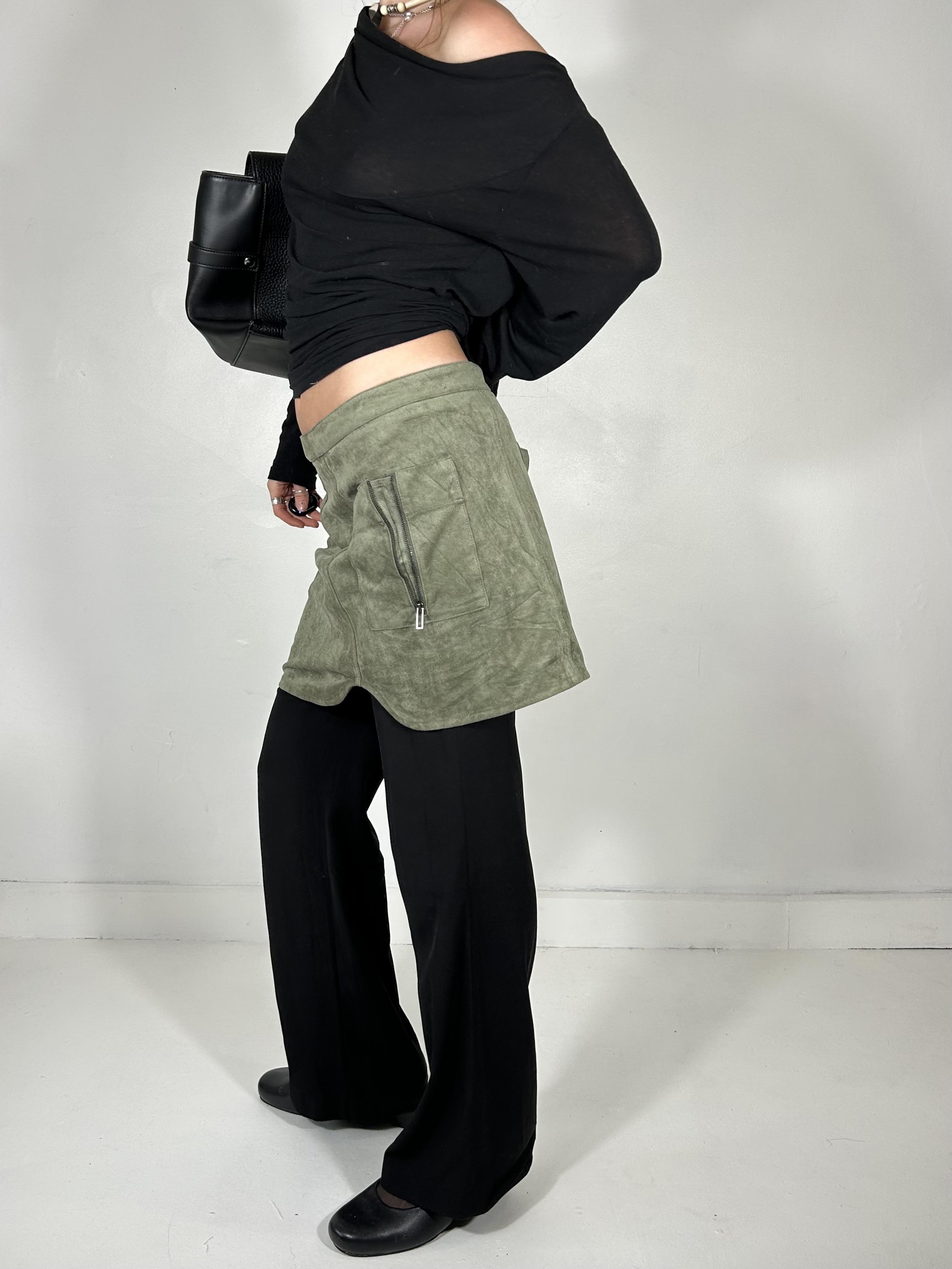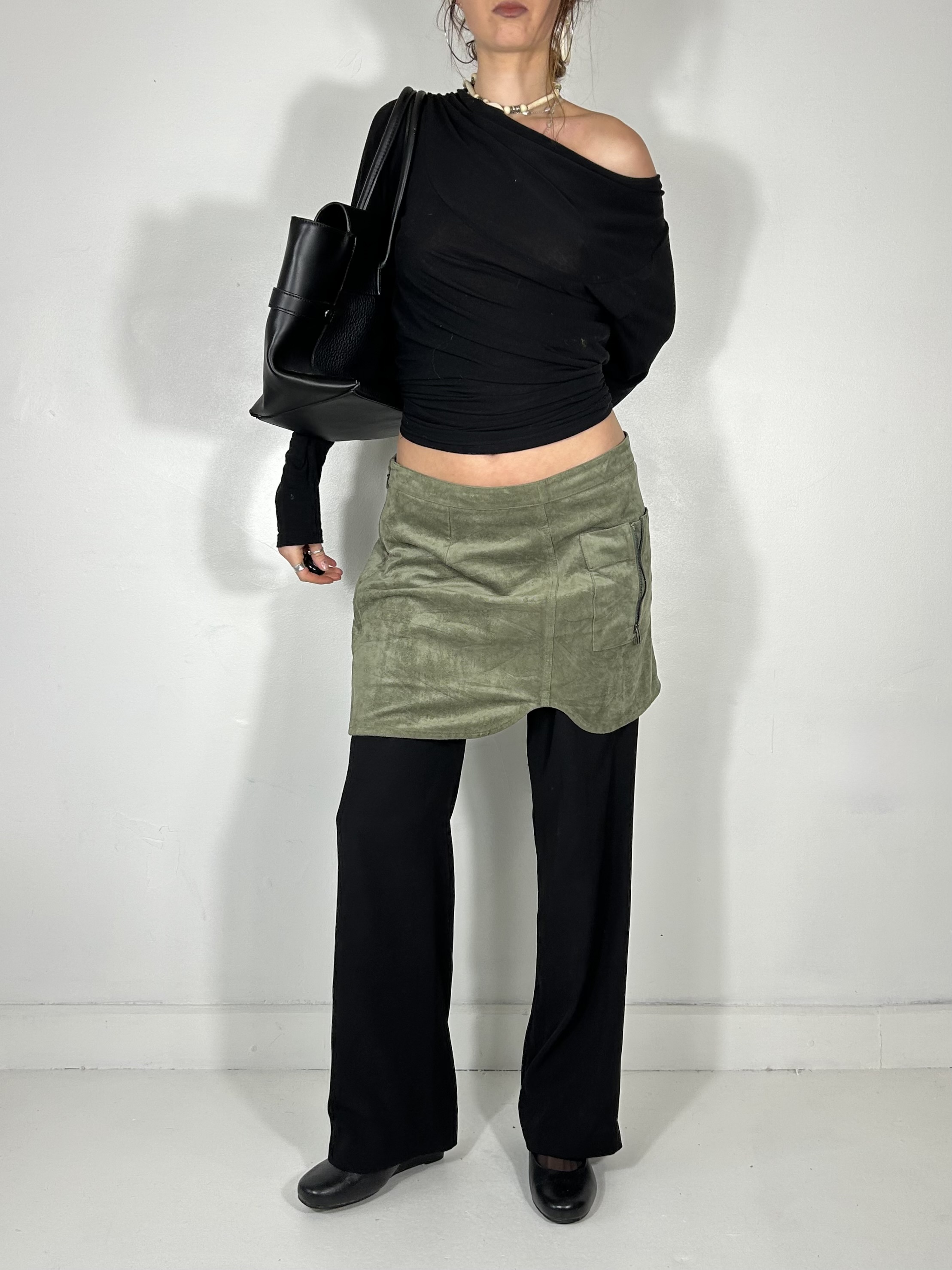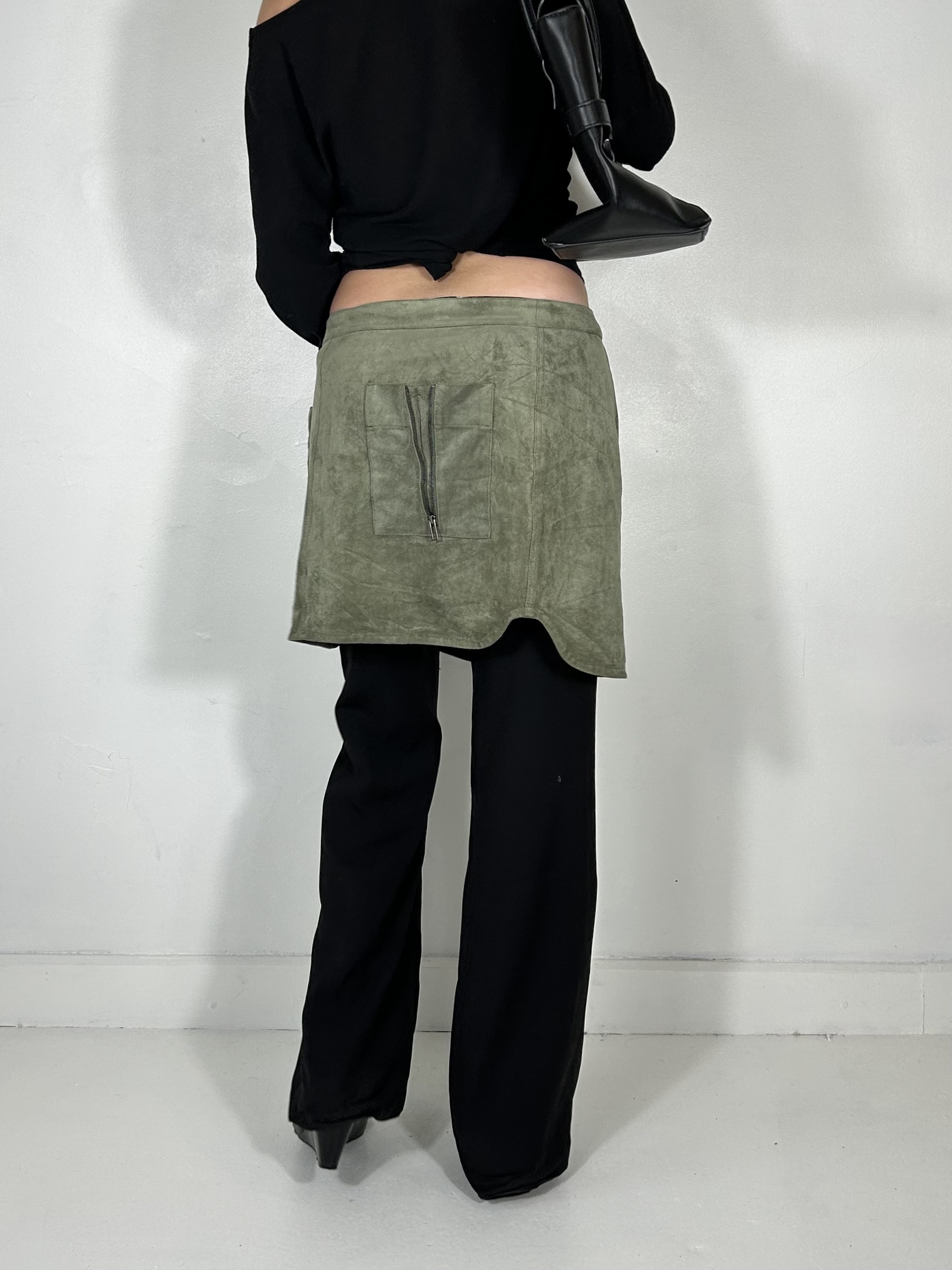 Khaki green suede feel utility mini skirt with zip detailing. Waist 37