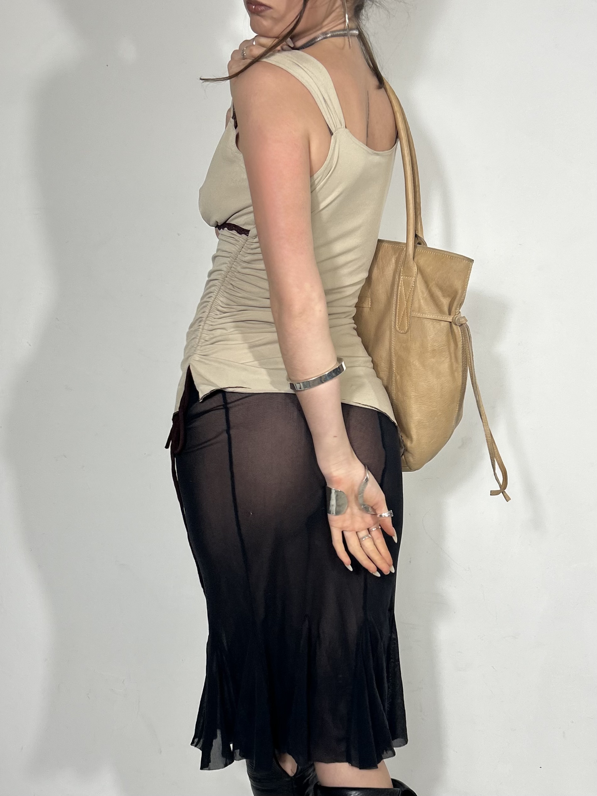 Cream and brown wrap style cami with side cinch detailing and lace trim