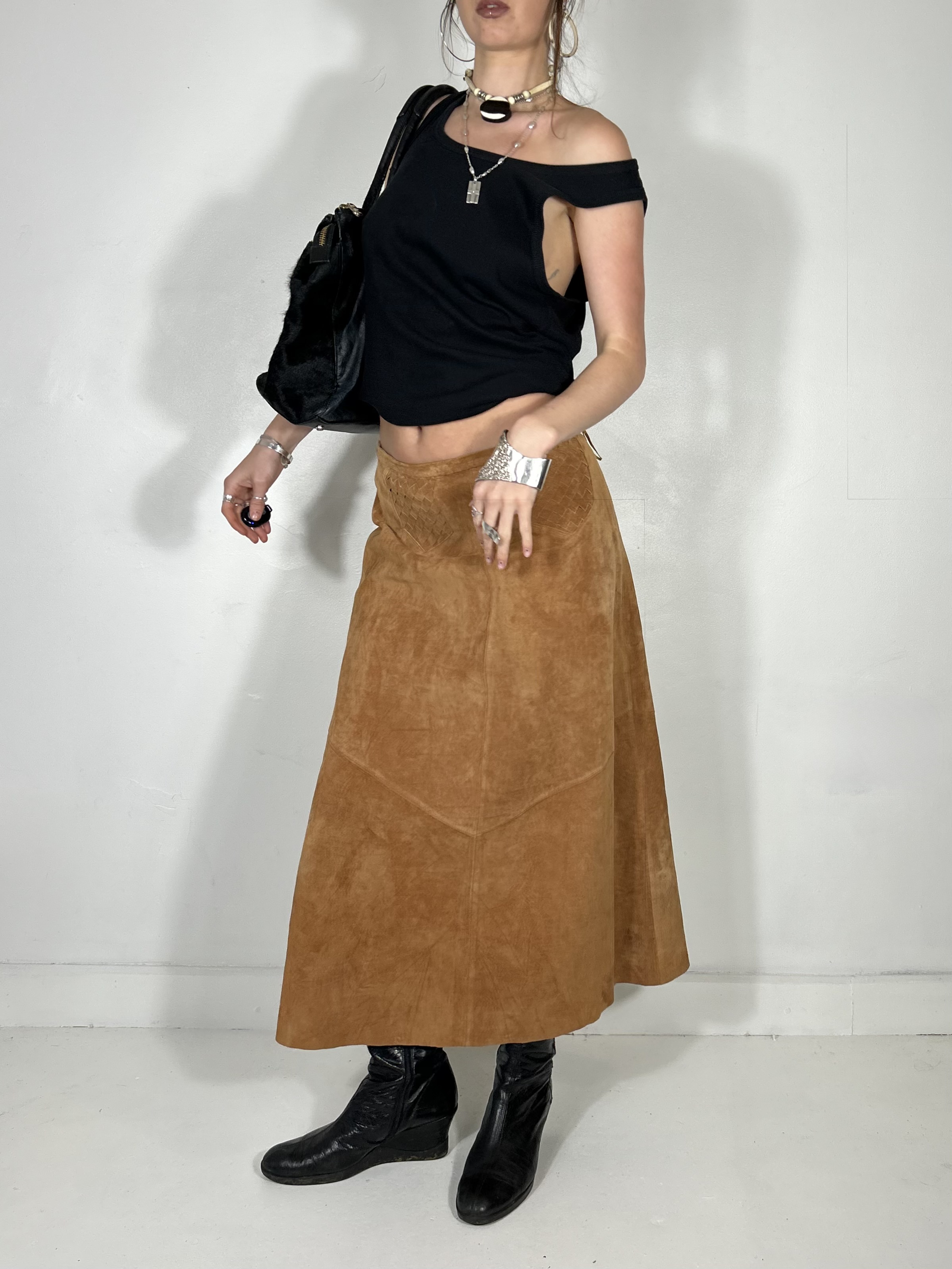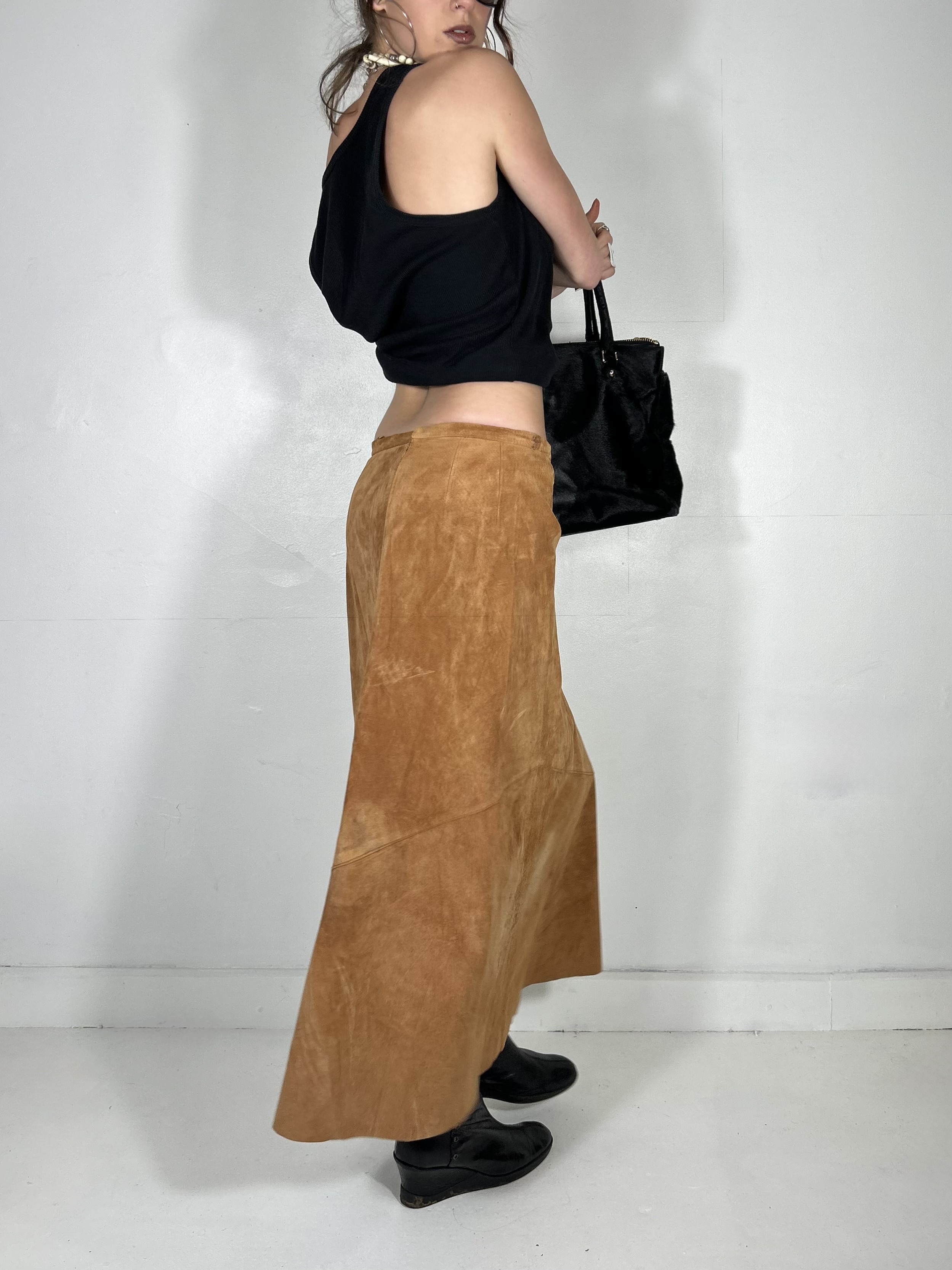 Tan suede maxi skirt with woven pockets. Waist 30