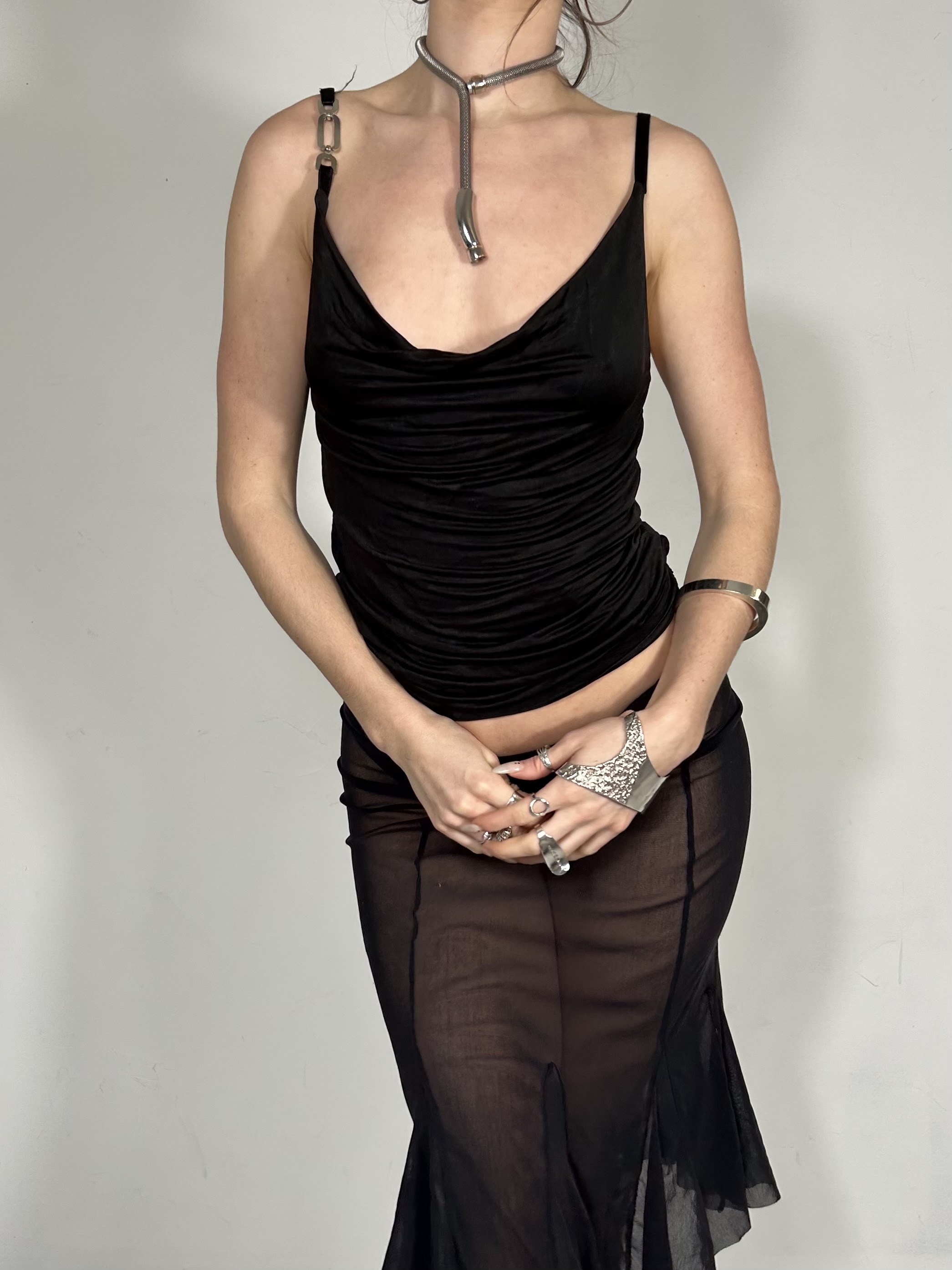 Black drape cowl neck cami with silver chrome shoulder detail