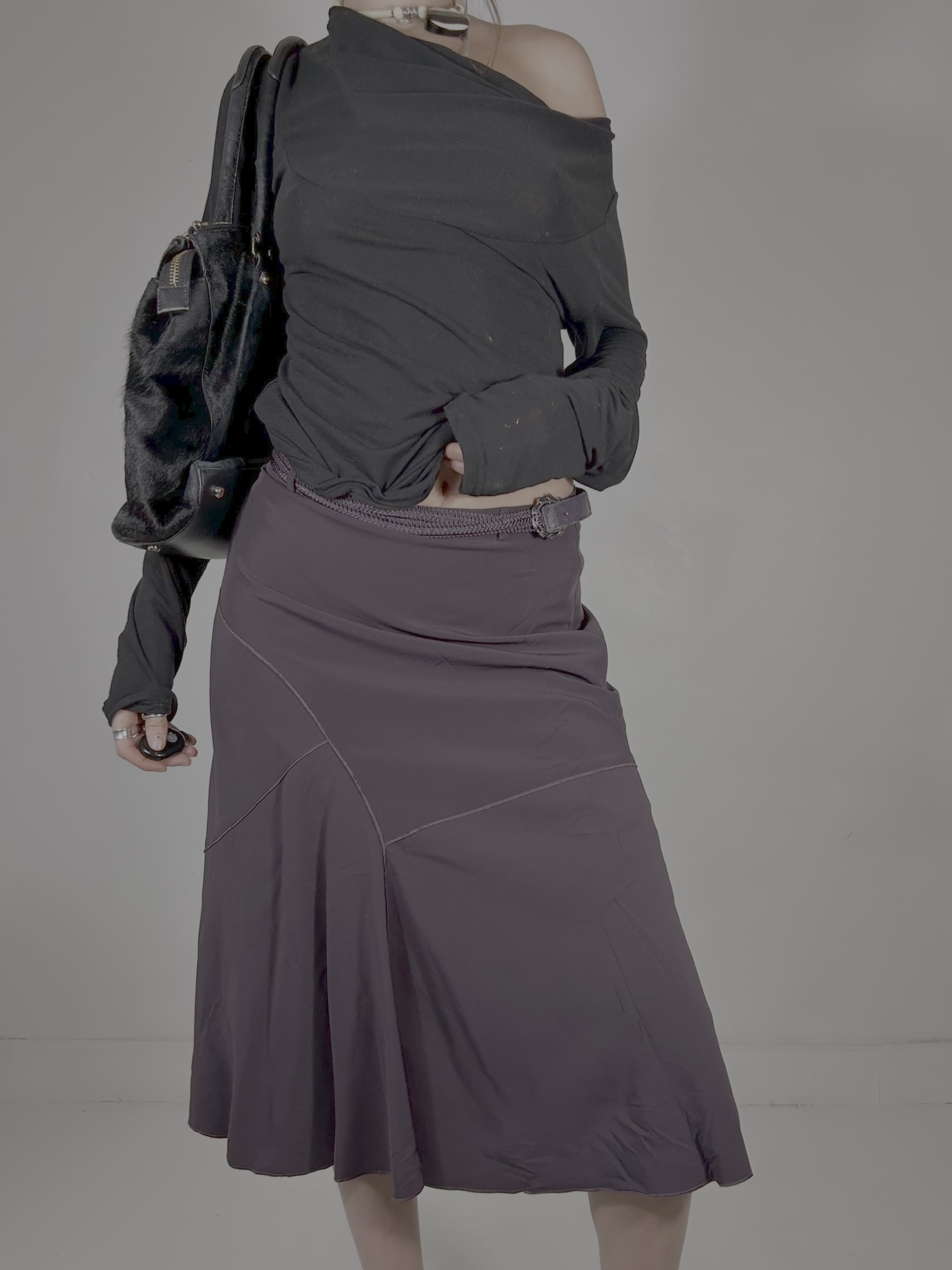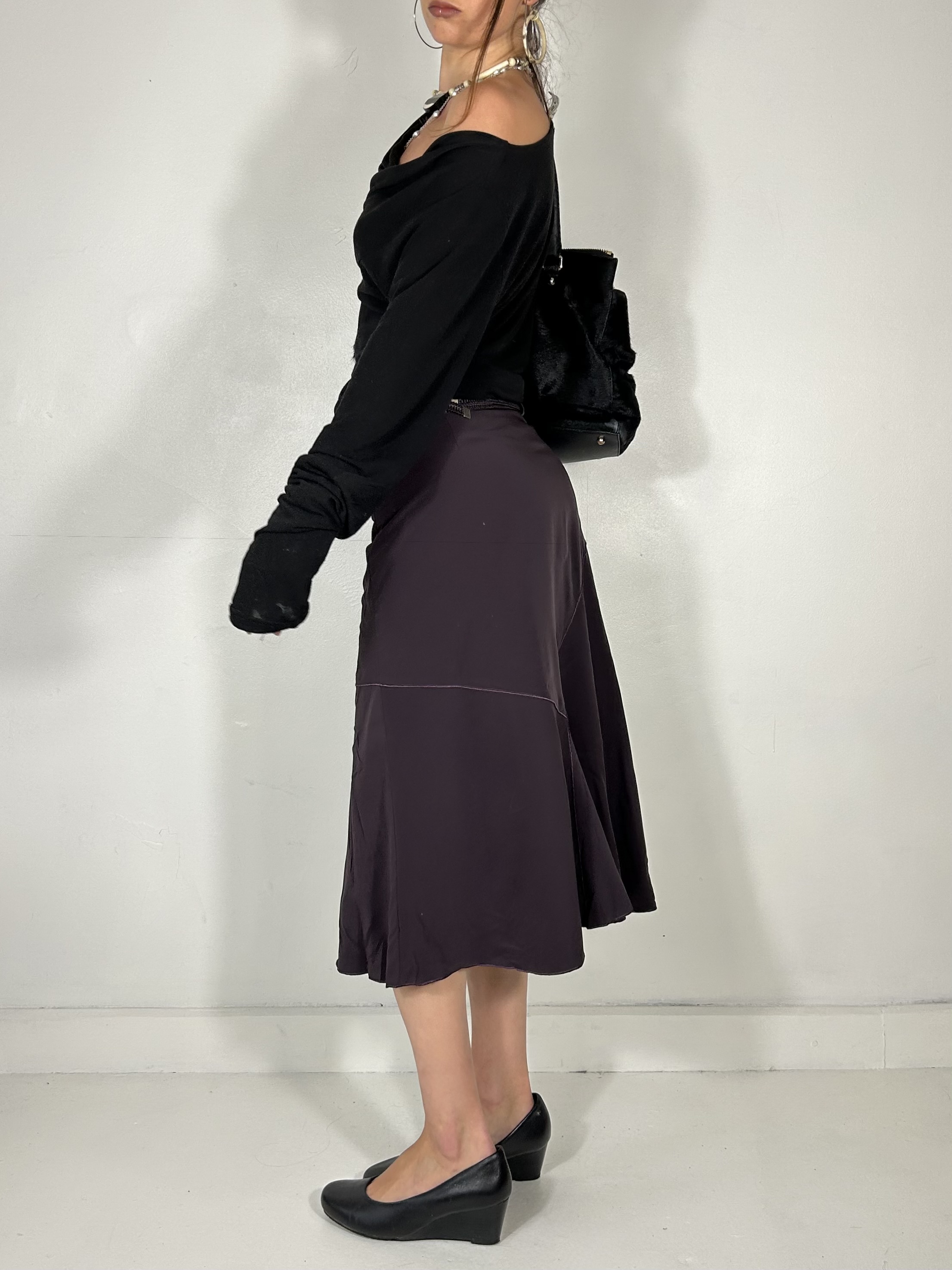 Purple canvas low rise midi skirt with belt detailing. Waist 28