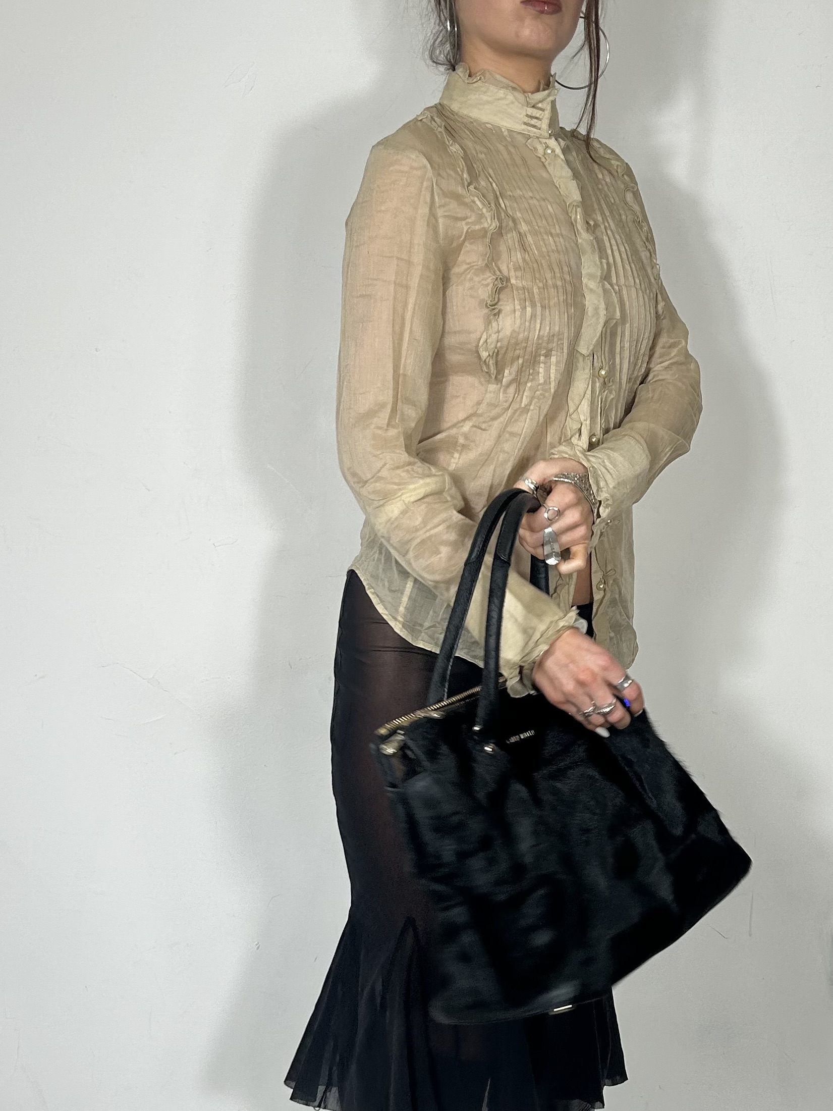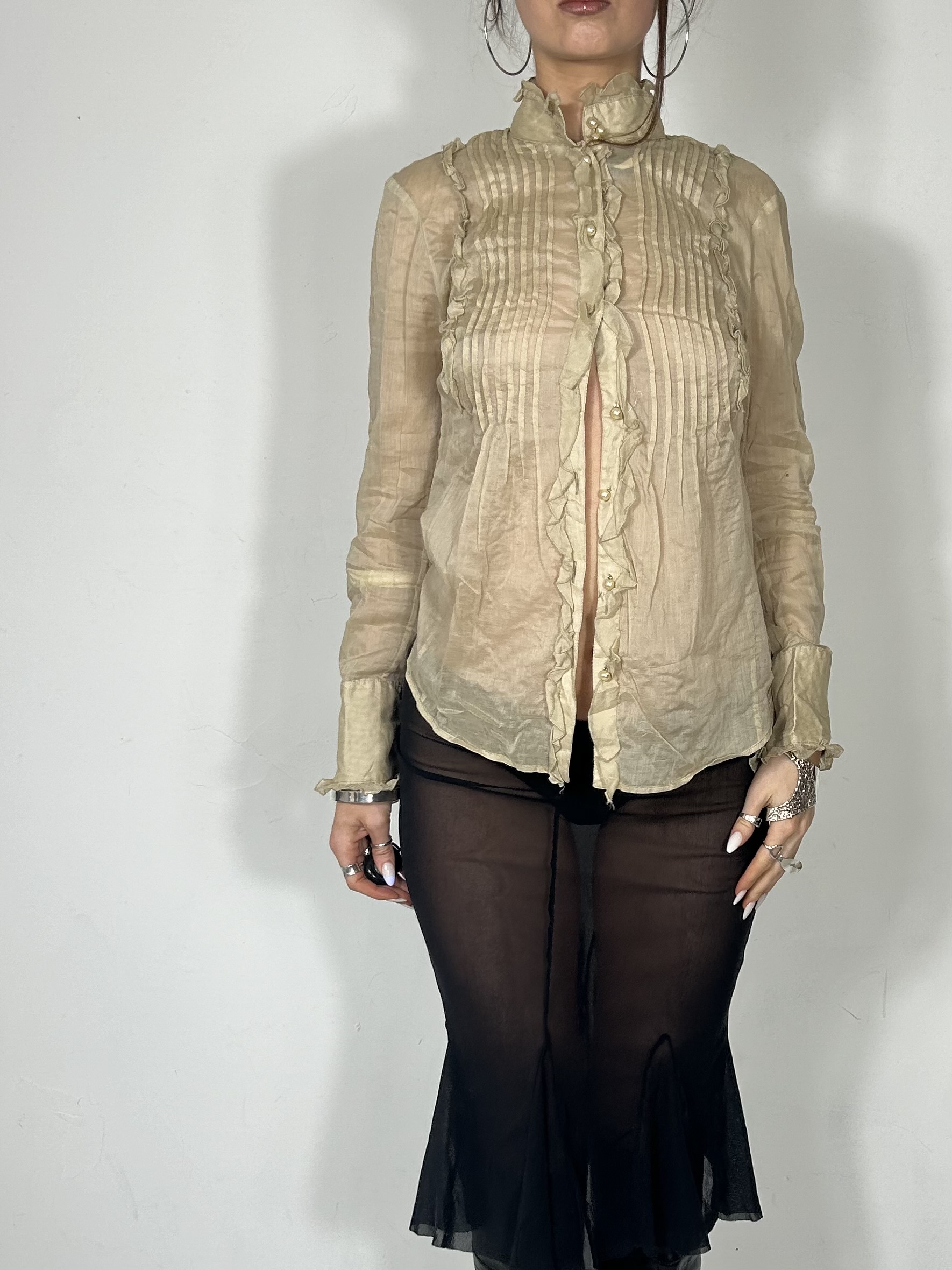 Cream semi sheer button up high neck ruffle blouse