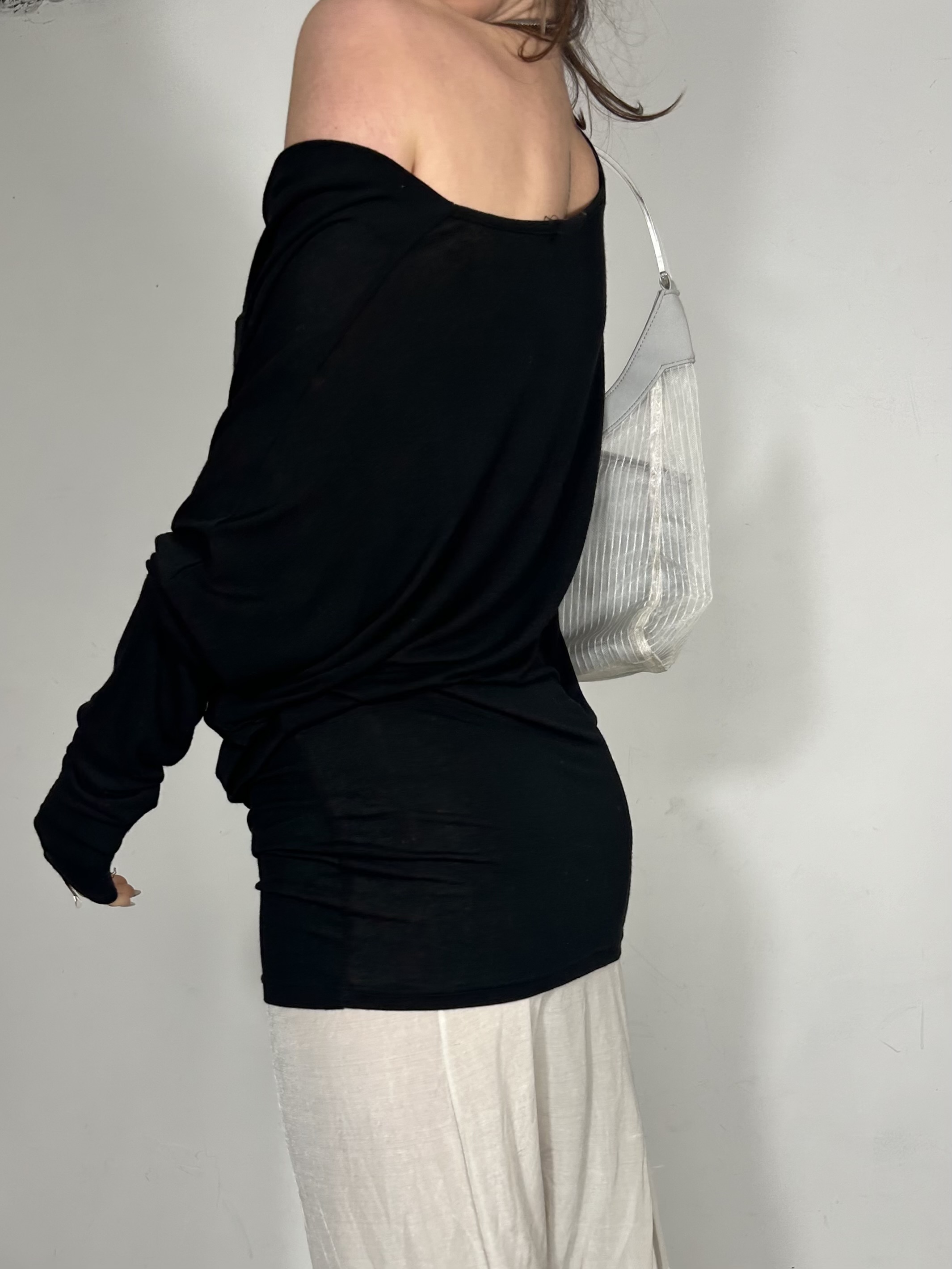 Black long drape top with slouchy neckline
