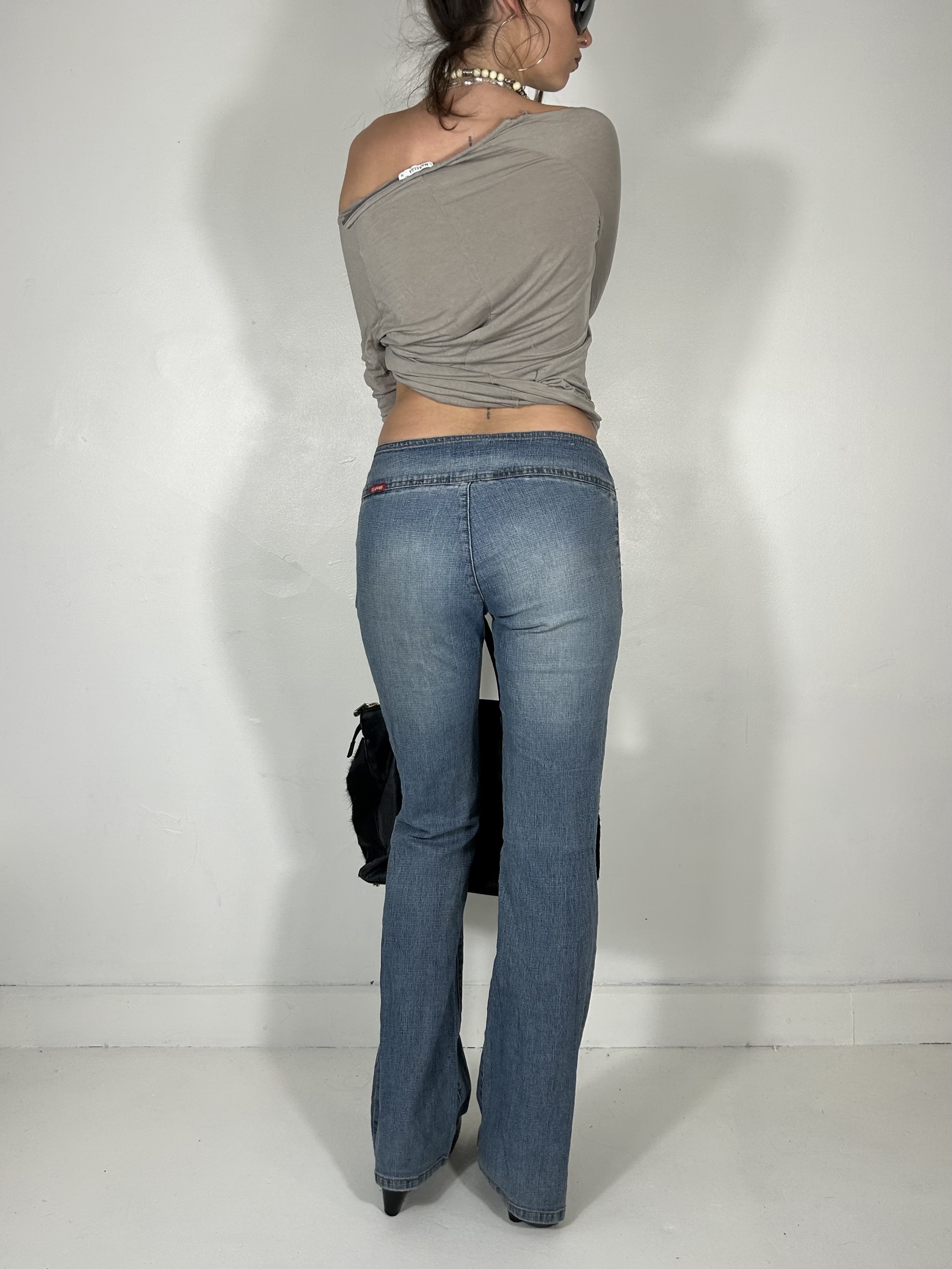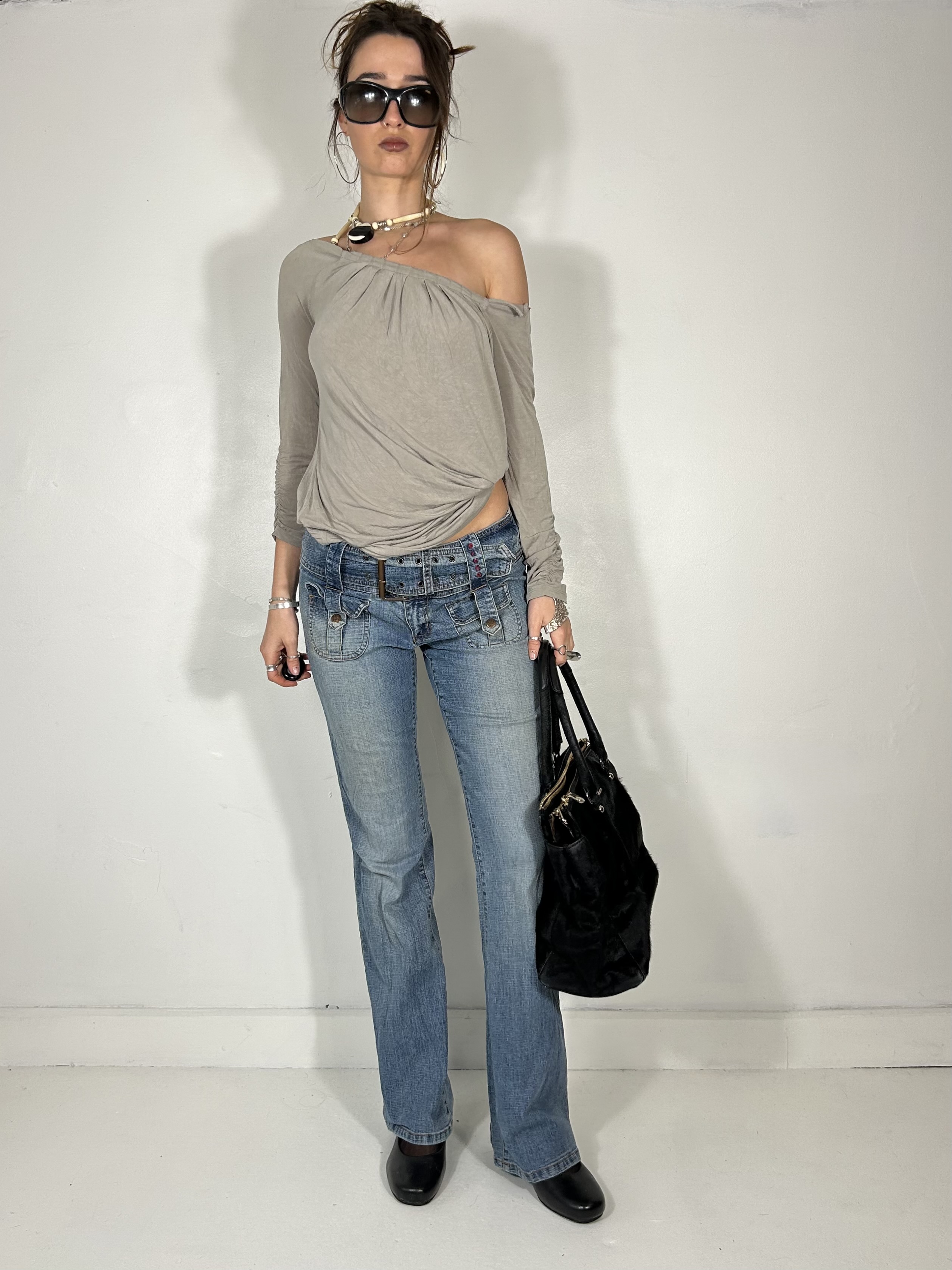Light wash slim fit low rise jeans with chunky buckle and utility straps. Waist 32