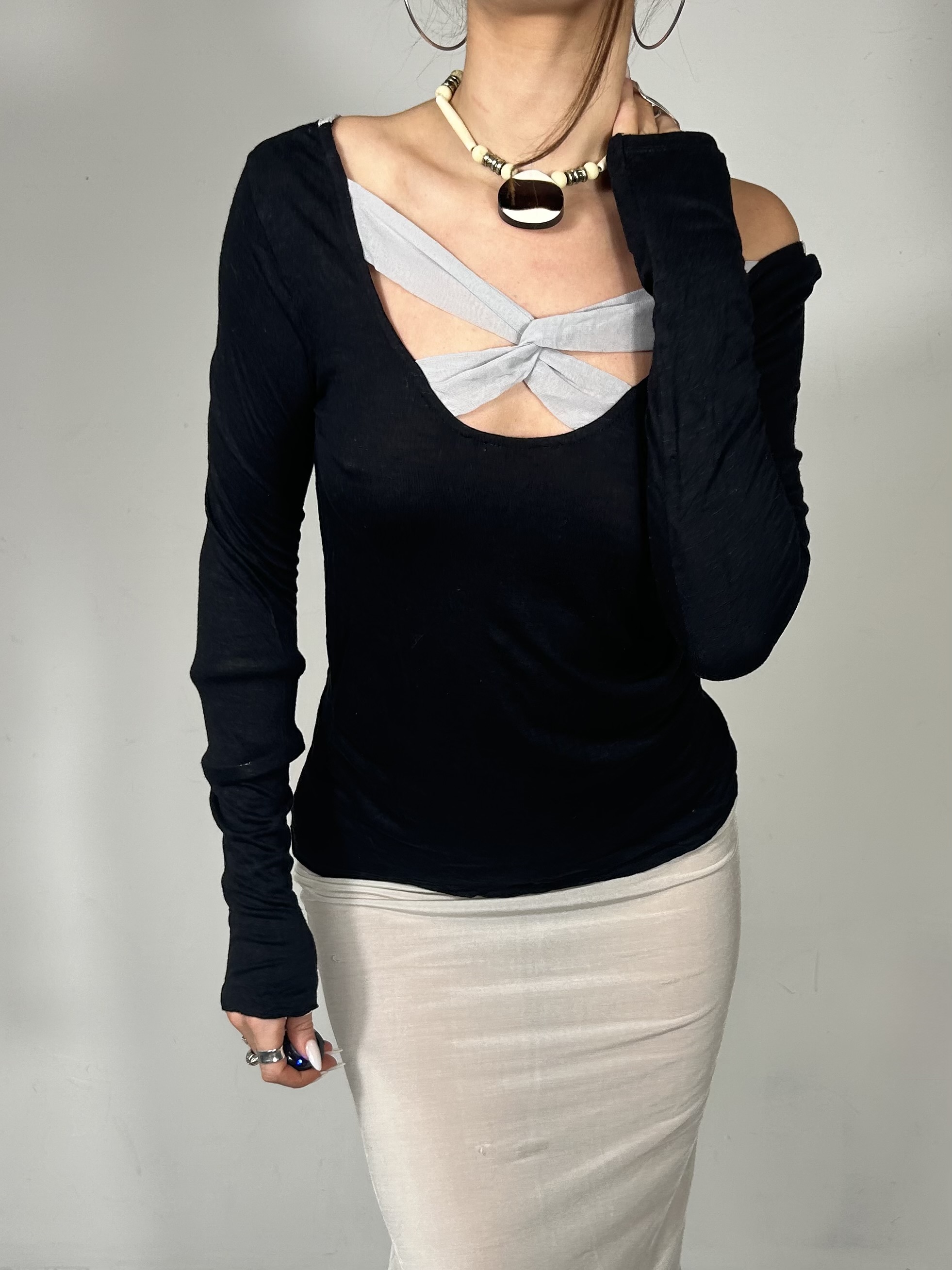 Midnight blue slouchy long sleeve top with powder blue cross detailing