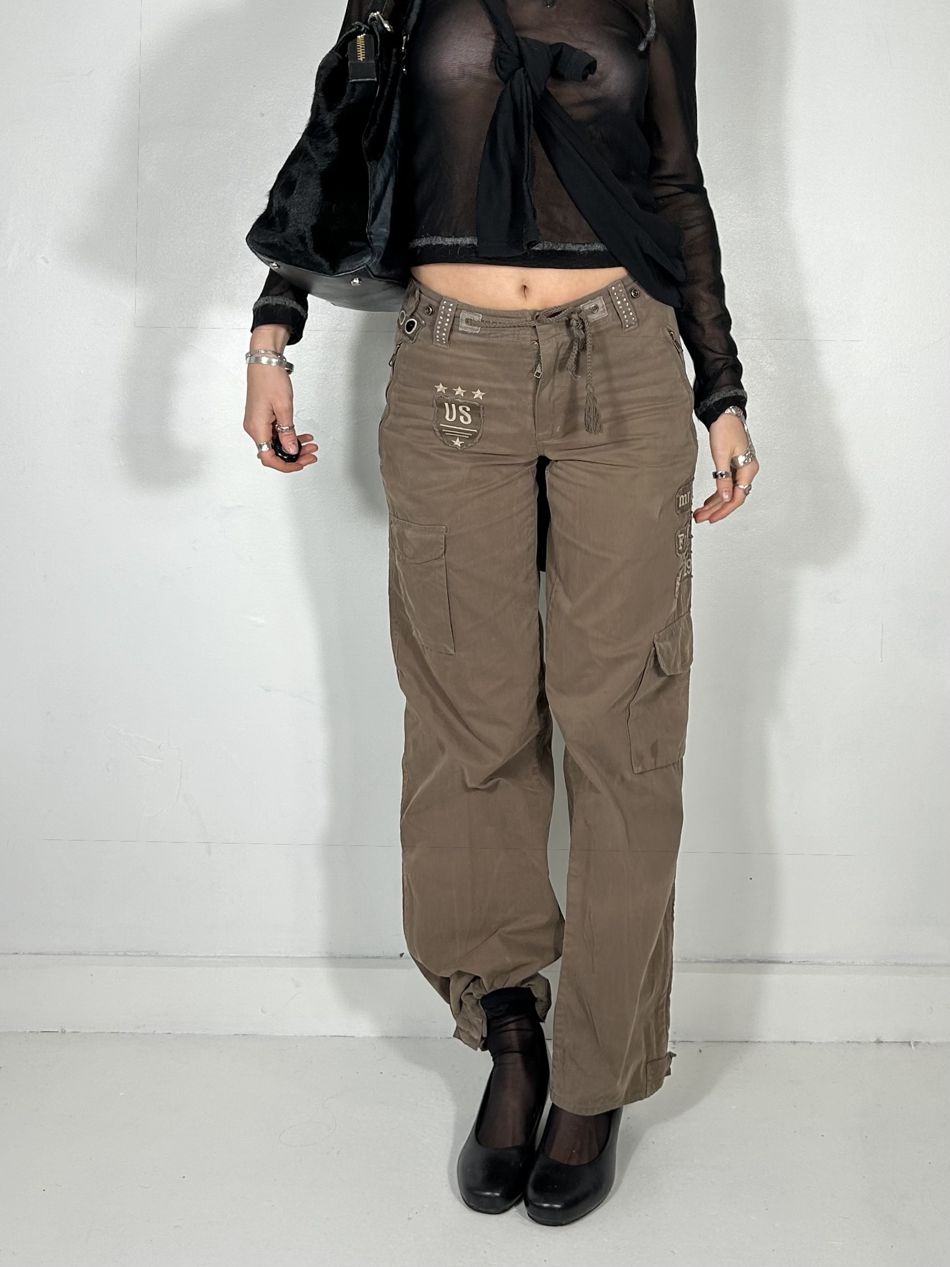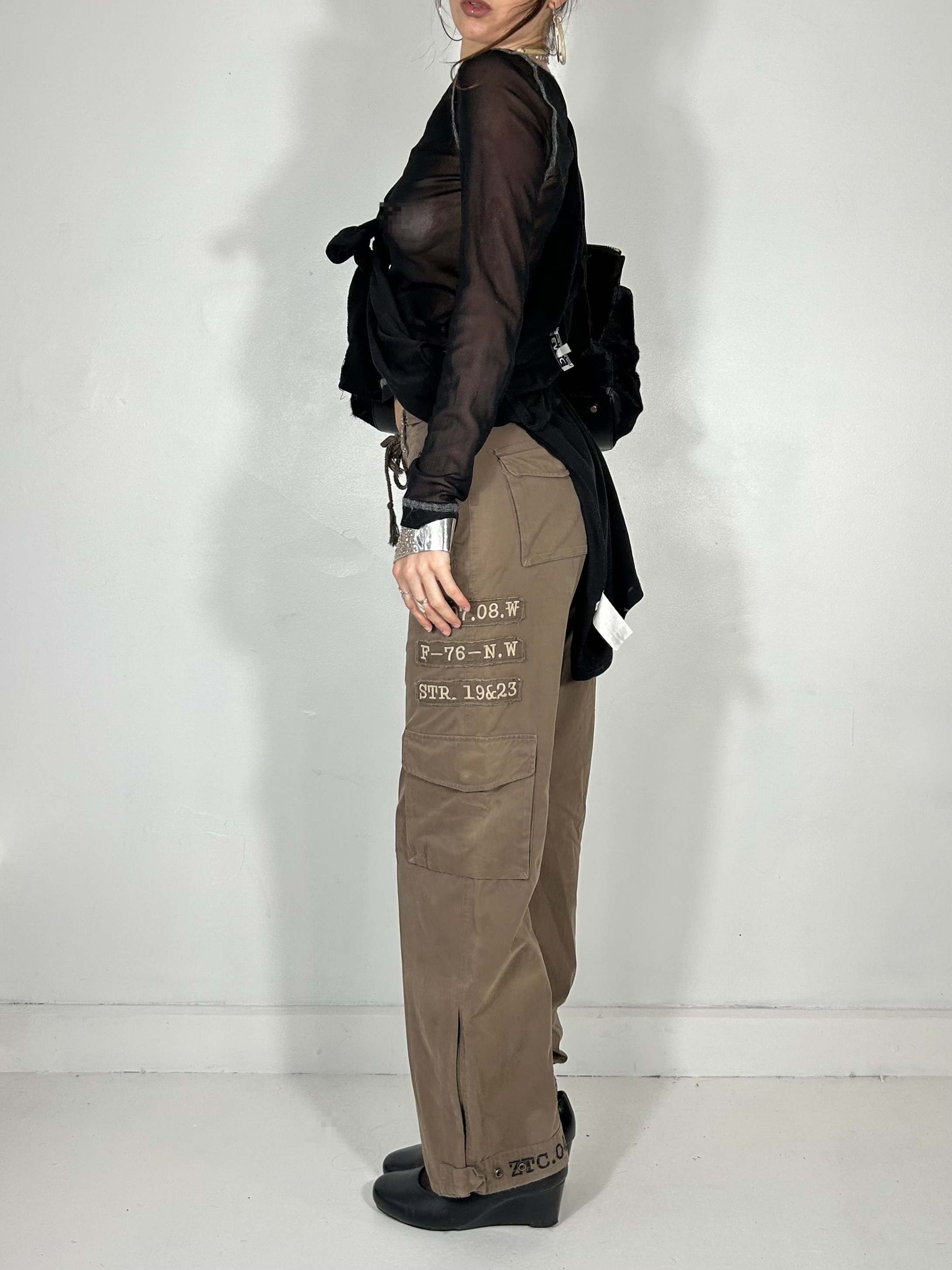 Khaki wide leg utility trousers with patch detailing. Waist 28