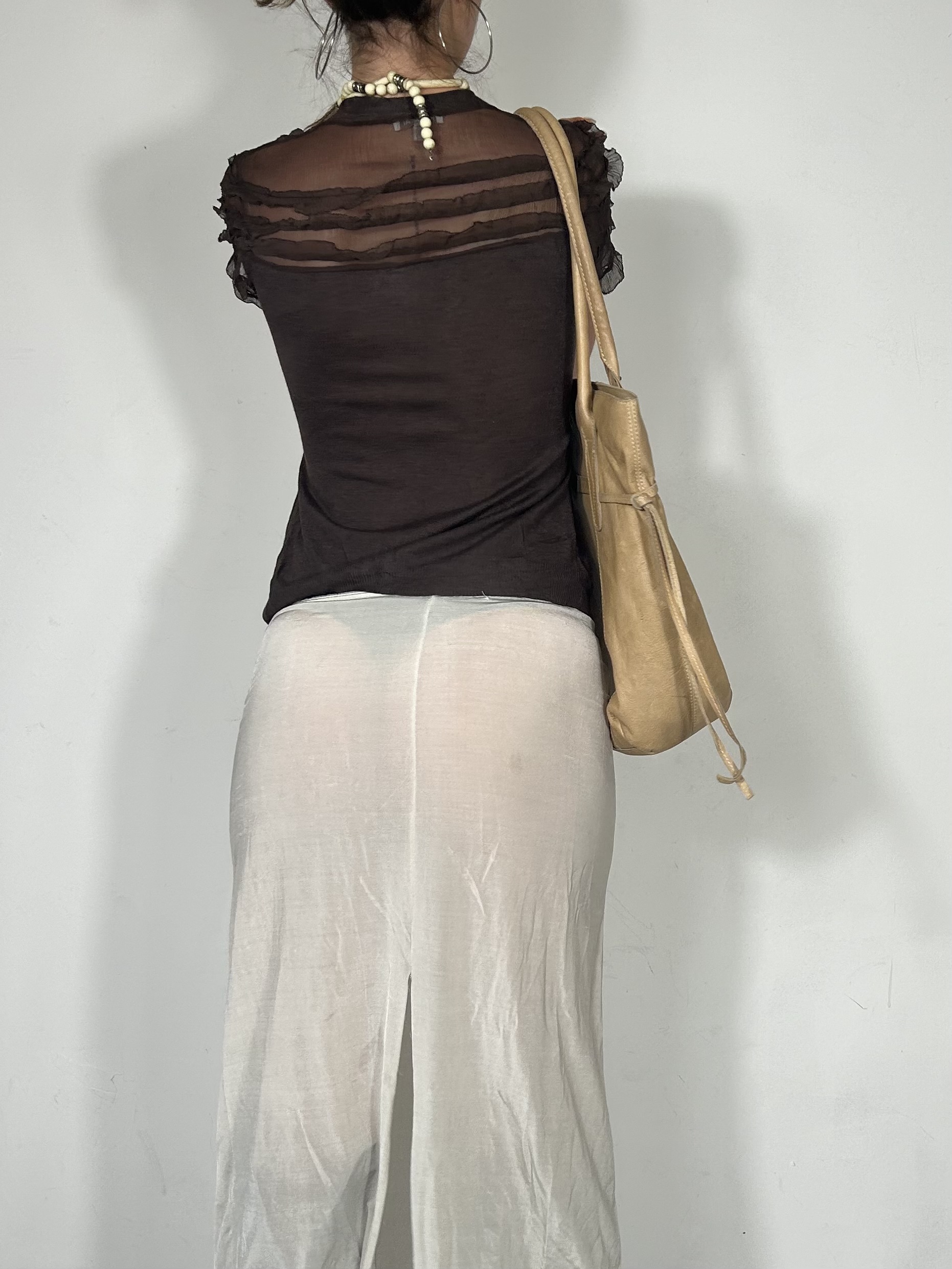 Chocolate brown silk blend tee with tie detail and ruffle sleeves